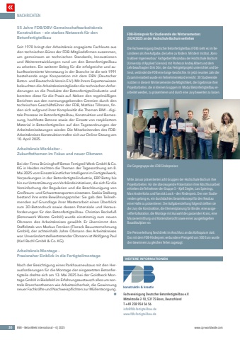 NACHRICHTEN30 BWI %u2013 BetonWerk International %u2013 4 | 2025 www.cpi-worldwide.com55 Jahre FDB/DBV-Gemeinschaftsarbeitskreis Konstruktion %u2013 ein starkes Netzwerk f%u00fcr den BetonfertigteilbauSeit 1970 bringt der Arbeitskreis engagierte Fachleute aus den technischen B%u00fcros der FDB-Mitgliedsfirmen zusammen, um gemeinsam an technischen Standards, Innovationen und Weiterentwicklungen rund um den Betonfertigteilbau zu arbeiten. Ein weiterer Beleg f%u00fcr die erfolgreiche und zukunftsorientierte Vernetzung in der Branche ist die seit 1991 bestehende enge Kooperation mit dem DBV (Deutscher Beton- und Bautechnik-Verein E.V.). Mit ihrem Expertenwissen beleuchten die Arbeitskreismitglieder die technischen Anforderungen an die Produkte der Betonfertigteilindustrie und bereiten diese f%u00fcr die Praxis auf. Neben den regelm%u00e4%u00dfigen Berichten aus den normungsgebenden Gremien durch den technischen Gesch%u00e4ftsf%u00fchrer der FDB, Mathias Tillmann, finden sich aufgrund ihrer Komplexit%u00e4t die Themen BIM %u2013 digitale Prozesse im Betonfertigteilbau, Konstruktion und Bemessung, hochfeste Betone sowie der Einsatz von rezykliertem Material in Betonfertigteilen auf den Tagesordnungen der Arbeitskreissitzungen wieder. Die Mitarbeitenden des FDBArbeitskreises Konstruktion trafen sich zur Online-Sitzung am 10. April 2025.Arbeitskreis Werkleiter %u2013 Zukunftsthemen im Fokus und neuer ObmannBei der Firma Br%u00fcninghoff Beton Fertigteil Werk GmbH & Co. KG in Heiden reichten die Themen der Tagesordnung am 8. Mai 2025 vom Einsatz k%u00fcnstlicher Intelligenz im Fertigteilwerk, Verpackungen in der Betonfertigteilindustrie, ERP-Betsy bis hin zur Unterst%u00fctzung von Verb%u00e4ndeinitiativen, die sich f%u00fcr die Vereinfachung der Regularien und die Beschleunigung von Gro%u00dfraum- und Schwertransporten einsetzen. Saskia Stalberg bestand ihre erste Bew%u00e4hrungsprobe: Sie gab den Teilnehmenden auf Grundlage ihrer Masterarbeit einen %u00dcberblick zum 3D-Betondruck sowie dessen Potenziale und Herausforderungen f%u00fcr den Betonfertigteilbau. Christian Reckefu%u00df (Betonwerk Werste GmbH) wurde einstimmig zum neuen Obmann des Arbeitskreises gew%u00e4hlt. Er %u00fcbernimmt den Staffelstab von Markus Frenken (Florack Bauunternehmung GmbH), der achteinhalb Jahre Obmann des Arbeitskreises war. Unver%u00e4ndert stellvertretender Obmann ist Wolfgang Paul (Karl Bachl GmbH & Co. KG).Arbeitskreis Montage %u2013 Praxisnaher Einblick in die FertigteilmontageNach der Besichtigung eines Parkhausneubaus mit den Herausforderungen f%u00fcr die Montage der eingesetzten Betonfertigteile drehte sich am 13. Mai 2025 bei der Goldbeck Montage GmbH in Bielefeld im Erfahrungsaustausch alles um zentrale Branchenthemen wie Arbeitssicherheit, die Gewinnung neuer Fachkr%u00e4fte und Nachweispflichten zur M%u00fcllentsorgung.nWEITERE INFORMATIONENFachvereinigung Deutscher Betonfertigteilbau e.V.Mittelstra%u00dfe 2-10, 53175 Bonn, DeutschlandT +49 228 954 56 56 info@fdb-fertigteilbau.dewww.fdb-fertigteilbau.deFDB-F%u00f6rderpreis f%u00fcr Studierende des Wintersemesters2024/2025 an der Hochschule Bochum verliehenDie Fachvereinigung Deutscher Betonfertigteilbau (FDB) sieht es im Besonderen als ihre Aufgabe, die Lehre zu f%u00f6rdern. Mit dem Institut %u201eKonstruktiver Ingenieurbau%u201c Fachgebiet Massivbau der Hochschule Bochum (University of Applied Sciences) mit Professor Andrej Albert und dem Lehrbeauftragten Dirk D%u00f6rr, der das Fertigteilprojekt unterrichtet und betreut, verbindet die FDB eine lange Geschichte. Im jetzt neunten Jahr der Zusammenarbeit wurde ein Teilnehmerrekord erreicht: 30 Studierende nutzten in diesem Wintersemester die M%u00f6glichkeit, die Ergebnisse ihrer Projektarbeiten, die in kleinen Gruppen im Modul Betonfertigteilbau erarbeitet werden, zu pr%u00e4sentieren und durch eine Jury bewerten zu lassen.Mitte Januar pr%u00e4sentierten acht Gruppen der Hochschule Bochum ihre Projektarbeiten. F%u00fcr die %u00fcberzeugende Pr%u00e4sentation ihrer Abschlussarbeit erhielten die Teilnehmer der Gruppe 5 %u2013 Kjell Ziegler, Lars Spierings, Marc-Andre Kolos und Yannick Loock %u2013 den F%u00f6rderpreis. Den vier Studierenden gelang es, ein durchdachtes Gesamtkonzept f%u00fcr den Neubau einer Halle zu pr%u00e4sentieren: Der Aufgabenstellung folgend stellten sie der Jury die Konstruktion, die Elementplanung f%u00fcr Binder, eine ausgereifte Kalkulation, die Montage mit Auswahl des passenden Krans, eine Massenermittlung und Kosten%u00fcbersicht sowie einen ausgekl%u00fcgelten Bauablaufplan vor.Die Preisverleihung fand direkt im Anschluss an das Kolloquium statt. Das mit dem FDB-F%u00f6rderpreis verbundene Preisgeld von 500 Euro wurde den Gewinnern zu gleichen Teilen zugesagt.Die Siegergruppe des FDB-F%u00f6rderpreises