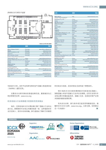 Partner OrganizationsOfficial AirlineEURASIA 2025www.iccx.orgSupportersOrganisationAllbau Software GmbH Germany www.allbau-software.deARCEN Portugal www.arcen.comASSYX GmbH & Co. KG Germany www.assyx.comAvermann Germany www.avermann.deBHS Sonthofen GmbH Germany www.bhs-sonthofen.deDezhou Haitian Electromechanical Technology Co., Ltd China www.haitianmachine.cnDongyue Machinery Group Co.,Ltd China www.dongyuegroup.comEhcolo Denmark www.ehcolo.comELKON T%u00fcrkiye www.elkon.netERMAK BETON T%u00fcrkiye www.ermakmakine.com.tr/enEUROMECC Italy www.euromecc.comFUJIAN QUNFENG MACHINERY CO.,LTD China www.qunfenggroup.comHa-Be Betonchemie GmbH Germany www.ha-be.comHebei Xindadi Electrical and Mechanical Manufacturing Co., Ltd. China www.hbxdd.comHESS GROUP Germany www.topwerk.com/hess-groupICCX Germany www.iccx.orgIMER GROUP Italy www.imergroup.comJiangsu Teeyer Intelligent Equipment Co.,LTD China www.teeyer.comKapag Kazakhstan www.kapag.kz/ruKBH Maschinenbau Germany www.k-b-h.deKEDA Suremaker China www.keda-suremaker.comKobra Germany www.kobragroup.comMasa GmbH Germany www.masa-group.comMEKA T%u00fcrkiyeMoldtech Spain www.moldtechsl.es/rumyWood Germany www.mywood.deNingbo Wewin Magnet Co., Ltd. China www.magnetictoolfactory.comNORDIMPIANTI SYSTEM Italy www.nordimpianti.comOsborn GmbH Germany www.osborn.comPenta Italy www.penta-automazioni.it/itPolblat Poland www.polblat.plPRINZING PFEIFFER Germany www.topwerk.com/prinzing-pfeifferPROGRESS GROUP Germany www.progress.groupQGM China www.zenithbrickmachine.comRampf Formen Germany www.rampf.comRatec Germany www.ratec.orgRekers Germany www.rekers.deRotho Germany www.rotho.deRUNDING China www.runding-aacline.comSaixin Magnetic China www.shuttering-magnets.comSchnell Spa Italy www.schnell.itShandong Tianyi Machinery co.,ltd China www.sdyzty.com/enSHANGHAI SHINRAY BIOTECH CO.,LTD China www.sidleychem.comSR SCHINDLER Germany www.topwerk.com/sr-schindlerTDM Engineering Finland www.tdm-engineering.comTechmatik Poland www.techmatik.plTianjin Yinfeng Machinery System Engineering Co.,Ltd China www.tyfmachine.comTJK Machinery China www.tjkmachinery-group.comTopWerk Group Germany www.topwerk.comUkeyer Intelligent Equipment (Zhejiang) Co., Ltd. China www.ukeyer.comWASA AG Germany www.wasa-technologies.comWehrhahn Germany www.wehrhahn.deZCJK China www.zcjk.com%u516c%u53f8 %u56fd%u5bb6 %u7f51%u5740%u516c%u53f8 %u56fd%u5bb6 %u7f51%u5740Status as of 26. 08. 2025WWW.ICCX.ORGwww.cpi-worldwide.com CPI %u2013 %u56fd%u9645%u6df7%u51dd%u571f%u751f%u4ea7%u5382 %u2013 5 | 2025 13%u8be6%u60c5%u8bf7%u54a8%u8be2%u53c2%u5c55%u5546%u540d%u5f55%u4e0e%u5c55%u4f4d%u5e73%u9762%u56fe%u4e13%u5bb6%u8fdb%u884c%u5206%u4eab%u3002%u672c%u73af%u8282%u7531%u54c8%u8428%u514b%u65af%u5766%u52a0%u6c14%u6df7%u51dd%u571f%u5236%u9020%u5546%u534f%u4f1a%uff08KAPAG%uff09%u63d0%u4f9b%u652f%u6301%u3002 %u5b8c%u6574%u4f1a%u8bae%u8bae%u7a0b%u53ef%u53c2%u9605%u672c%u62a5%u9053%u540e%u7eed%u5185%u5bb9%uff0c%u6700%u65b0%u7248%u672c%u4e5f%u5df2%u540c%u6b65%u66f4%u65b0%u81f3%u5b98%u7f51%uff1awww.iccx.org %u6b27%u4e9a%u6df7%u51dd%u571f%u884c%u4e1a%u89c4%u6a21%u6700%u5927%u7684%u56fd%u9645%u6027%u8d38%u6613%u5c55%u4f1a %u6bcf%u5e74%uff0c%u5168%u7403%u5404%u5730%u7684 ICCX %u5c55%u4f1a%u90fd%u6c47%u805a%u4e86%u6df7%u51dd%u571f%u884c%u4e1a%u7684%u4f17%u591a%u4f01%u4e1a%u3002%u53c2%u5c55%u5546%u548c%u4e13%u4e1a%u89c2%u4f17%u7684%u9700%u6c42%u9ad8%u5ea6%u4e00%u81f4%uff1a%u8fd9%u91cc%u63d0%u4f9b%u7684%u4e13%u4e1a%u4ea4%u6d41%u6df1%u5165%u3001%u52a1%u5b9e%u4e14%u76ee%u6807%u660e%u786e%u3002%u53c2%u4e0e%u8005%u5f7c%u6b64%u4e86%u89e3%u5bf9%u65b9%u7684%u9700%u6c42%u548c%u76ee%u6807%u8fd9%u4e3a%u9ad8%u6548%u3001%u6210%u529f%u7684%u5546%u4e1a%u6d3d%u8c08%u521b%u9020%u4e86%u7406%u60f3%u6761%u4ef6%u3002 %u9884%u8ba1 2025 %u5e74 ICCX %u6b27%u4e9a%u5c55%u5c06%u5438%u5f15%u7ea6 80 %u5bb6%u6765%u81ea%u6df7%u51dd%u571f%u3001%u9884%u5236%u6df7%u51dd%u571f%u548c%u52a0%u6c14%u6df7%u51dd%u571f%u884c%u4e1a%u7684%u4f01%u4e1a%u53c2%u5c55%u3002%u8fd9%u4e9b%u4f01%u4e1a%u5c06%u5411%u4e13%u4e1a%u89c2%u4f17%u5c55%u793a%u673a%u68b0%u8bbe%u5907%u6280%u672f%u3001%u6df7%u51dd%u571f%u5316%u5b66%u3001%u4fe1%u606f%u6280%u672f%u7b49%u4ea7%u4e1a%u76f8%u5173%u9886%u57df%u7684%u6700%u65b0%u53d1%u5c55%u6210%u679c%u3002 %u6709%u5173%u4f1a%u8bae%u8bae%u7a0b%u3001%u53c2%u4e0e%u6761%u4ef6%u6216%u4f4f%u5bbf%u5b89%u6392%u7b49%u6700%u65b0%u4fe1%u606f%uff0c%u8bf7%u968f%u65f6%u8bbf%u95ee ICCX %u5b98%u7f51%uff1awww.iccx.org%u3002%u7acb%u5373%u6ce8%u518c%uff0c%u5207%u52ff%u9519%u8fc7%u8fd9%u4e00%u884c%u4e1a%u76db%u4f1a%uff01 %u25a0