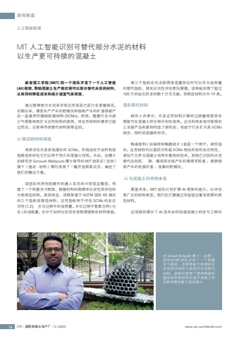 %u65b0%u95fb%u62a5%u905318 CPI %u2013 %u56fd%u9645%u6df7%u51dd%u571f%u751f%u4ea7%u5382 %u2013 5 | 2025 www.cpi-worldwide.com%u4eba%u5de5%u667a%u80fd%u6846%u67b6MIT %u4eba%u5de5%u667a%u80fd%u8bc6%u522b%u53ef%u66ff%u4ee3%u90e8%u5206%u6c34%u6ce5%u7684%u6750%u6599%u4ee5%u751f%u4ea7%u66f4%u53ef%u6301%u7eed%u7684%u6df7%u51dd%u571f%u9ebb%u7701%u7406%u5de5%u5b66%u9662 (MIT) %u7684%u4e00%u4e2a%u56e2%u961f%u5f00%u53d1%u4e86%u4e00%u4e2a%u4eba%u5de5%u667a%u80fd(AI)%u6846%u67b6%uff0c%u5e2e%u52a9%u6df7%u51dd%u571f%u751f%u4ea7%u5546%u8bc6%u522b%u53ef%u4ee5%u90e8%u5206%u66ff%u4ee3%u6c34%u6ce5%u7684%u6750%u6599%uff0c%u4ece%u800c%u540c%u65f6%u964d%u4f4e%u6210%u672c%u548c%u51cf%u5c11%u6e29%u5ba4%u6c14%u4f53%u6392%u653e%u3002 %u901a%u8fc7%u66ff%u6362%u90e8%u5206%u6c34%u6ce5%u6765%u5b9e%u73b0%u8fd9%u4e9b%u6548%u76ca%u5df2%u662f%u884c%u4e1a%u666e%u904d%u505a%u6cd5%u3002%u957f%u671f%u4ee5%u6765%uff0c%u7164%u70ad%u751f%u4ea7%u4ea7%u751f%u7684%u7c89%u7164%u7070%u548c%u70bc%u94a2%u4ea7%u751f%u7684%u77ff%u6e23%u7b49%u526f%u4ea7%u54c1%u4e00%u76f4%u88ab%u7528%u4f5c%u8f85%u52a9%u80f6%u51dd%u6750%u6599 (SCMs)%u3002%u7136%u800c%uff0c%u968f%u7740%u884c%u4e1a%u4e3a%u51cf%u5c11%u6c14%u5019%u5f71%u54cd%u800c%u6269%u5927%u8fd9%u4e9b%u6750%u6599%u7684%u4f7f%u7528%uff0c%u5bf9%u8fd9%u4e9b%u6750%u6599%u7684%u9700%u6c42%u5df2%u8d85%u8fc7%u4f9b%u5e94%uff0c%u8fd9%u4f7f%u5f97%u5bfb%u627e%u66ff%u4ee3%u6750%u6599%u53d8%u5f97%u8feb%u5207%u3002 AI %u9a71%u52a8%u7684%u6750%u6599%u7b5b%u9009 %u867d%u7136%u5b58%u5728%u8bb8%u591a%u5176%u4ed6%u6f5c%u5728%u7684 SCMs%uff0c%u4f46%u6311%u6218%u5728%u4e8e%u5982%u4f55%u6709%u6548%u5730%u7b5b%u9009%u548c%u8bc4%u4f30%u5b83%u4eec%u4ee5%u7528%u4e8e%u6301%u4e45%u7684%u6df7%u51dd%u571f%u7ed3%u6784%u3002%u4e3a%u6b64%uff0c%u7531%u535a%u58eb%u540e%u7814%u7a76%u5458 Soroush Mahjoubi %u535a%u58eb%u9886%u5bfc%u7684 MIT %u56e2%u961f%u5728%u300a%u81ea%u7136%u300b%u65d7%u4e0b%u300a%u901a%u8baf - %u6750%u6599%u300b%u671f%u520a%u53d1%u8868%u4e86%u4e00%u7bc7%u5f00%u653e%u83b7%u53d6%u8bba%u6587%uff0c%u9610%u8ff0%u4e86%u4ed6%u4eec%u7684%u89e3%u51b3%u65b9%u6848%u3002 %u8be5%u56e2%u961f%u5229%u7528%u5305%u62ec%u804a%u5929%u673a%u5668%u4eba%u5728%u5185%u7684%u5927%u578b%u8bed%u8a00%u6a21%u578b%uff0c%u6784%u5efa%u4e86%u4e00%u4e2a%u673a%u5668%u5b66%u4e60%u6846%u67b6%uff0c%u6839%u636e%u6750%u6599%u7684%u7269%u7406%u548c%u5316%u5b66%u6027%u8d28%u8bc4%u4f30%u548c%u5206%u7c7b%u5019%u9009%u6750%u6599%u3002%u5177%u4f53%u800c%u8a00%uff0c%u8be5%u6846%u67b6%u57fa%u4e8e ASTM %u56fd%u9645 R3 %u6d4b%u8bd5%u7684%u4e09%u4e2a%u6307%u6807%u6765%u7b5b%u9009%u6750%u6599%uff0c%u8fd9%u4e9b%u6307%u6807%u7528%u4e8e%u8bc4%u4f30 SCMs %u7684%u53cd%u5e94%u6d3b%u6027 [1,2]%uff1a %u6c34%u5316%u8fc7%u7a0b%u4e2d%u7684%u653e%u70ed%u91cf%uff0c%u6c34%u5316%u8fc7%u7a0b%u4e2d%u6c22%u6c27%u5316%u9499 ( %u77f3%u7070 ) %u7684%u6d88%u8017%u91cf%uff0c%u6c34%u5206%u5b50%u5982%u4f55%u5316%u5b66%u7ed3%u5408%u6216%u7269%u7406%u5438%u9644%u5728%u6750%u6599%u8868%u9762%u3002%u7b2c%u4e09%u4e2a%u6307%u6807%u5728%u65e0%u6cd5%u83b7%u5f97%u7b49%u6e29%u91cf%u70ed%u4eea%u65f6%u53ef%u4ee5%u4f5c%u4e3a%u653e%u70ed%u91cf%u7684%u66ff%u4ee3%u6307%u6807%uff0c%u4f7f%u53cd%u5e94%u6d3b%u6027%u8bc4%u4f30%u66f4%u52a0%u4fbf%u6377%u3002%u8be5%u7cfb%u7edf%u5904%u7406%u4e86%u8d85%u8fc7100 %u4e07%u4efd%u5ca9%u77f3%u6837%u672c%u548c%u6570%u5341%u4e07%u9875%u6587%u732e%uff0c%u5c06%u5019%u9009%u6750%u6599%u5206%u4e3a 19 %u7c7b%u3002%u6f5c%u5728%u66ff%u4ee3%u6750%u6599 %u7814%u7a76%u4eba%u5458%u8868%u793a%uff0c%u8bb8%u591a%u8fd9%u4e9b%u6750%u6599%u53ea%u9700%u7ecf%u8fc7%u7814%u78e8%u7b49%u7b80%u5355%u5904%u7406%u5c31%u53ef%u5728%u6df7%u51dd%u571f%u62cc%u5408%u7269%u4e2d%u5b9e%u9645%u4f7f%u7528%u3002%u8fd9%u4e3a%u5229%u7528%u672c%u5730%u53ef%u83b7%u5f97%u7684%u5de5%u4e1a%u526f%u4ea7%u54c1%u548c%u5e9f%u6599%u521b%u9020%u4e86%u65b0%u673a%u4f1a%uff0c%u6709%u52a9%u4e8e%u884c%u4e1a%u6269%u5927%u5176 SCMs%u7ec4%u5408%uff0c%u540c%u65f6%u4fc3%u8fdb%u5faa%u73af%u7ecf%u6d4e%u3002%u9676%u74f7%u5e9f%u6599 ( %u5982%u74f7%u7816%u548c%u9676%u5668%u788e%u7247 ) %u5c31%u662f%u4e00%u4e2a%u4f8b%u5b50%u3002%u7814%u7a76%u6307%u51fa%uff0c%u8fd9%u4e9b%u6750%u6599%u53ef%u4ee5%u63d0%u4f9b%u4e0e%u4f20%u7edf SCMs %u76f8%u4f3c%u7684%u6709%u5229%u53cd%u5e94%u7279%u6027%uff0c%u7c7b%u4f3c%u4e8e%u53e4%u7f57%u9a6c%u6df7%u51dd%u571f%u7ed3%u6784%u4e2d%u770b%u5230%u7684%u6280%u672f%u3002%u5176%u4ed6%u5df2%u8bc6%u522b%u7684%u6c34%u6ce5%u66ff%u4ee3%u54c1%u5305%u62ec%uff1a %u94dc%u3001%u954d%u6216%u950c%u51b6%u70bc%u4ea7%u751f%u7684%u586b%u57cb%u975e%u94c1%u6e23 %uff0c%u5e9f%u94a2%u7194%u70bc%u4ea7%u751f%u7684%u7535%u5f27%u7089%u6e23 %uff0c%u6536%u96c6%u7684%u7c89%u7164%u7070%u3002 AI %u4e0e%u6df7%u51dd%u571f%u79d1%u5b66%u7684%u672a%u6765 %u5c55%u671b%u672a%u6765%uff0cMIT %u56e2%u961f%u8ba1%u5212%u6269%u5c55 AI %u6846%u67b6%u7684%u80fd%u529b%uff0c%u4ee5%u8bc4%u4f30%u66f4%u5e7f%u6cdb%u7684%u6750%u6599%u7c7b%u578b%u3002%u4ed6%u4eec%u8fd8%u6253%u7b97%u901a%u8fc7%u5b9e%u9a8c%u9a8c%u8bc1%u6700%u6709%u524d%u666f%u7684%u5019%u9009%u6750%u6599%u3002 %u8fd9%u9879%u7814%u7a76%u5c55%u793a%u4e86 AI %u6280%u672f%u5982%u4f55%u52a0%u901f%u6df7%u51dd%u571f%u79d1%u5b66%u4e0e%u5de5%u7a0b%u7684%u7531 Soroush Mahjoubi %u535a%u58eb%uff08%u5982%u56fe%uff09%u9886%u5bfc%u7684 MIT %u56e2%u961f%u5f00%u53d1%u4e86%u4e00%u4e2a%u673a%u5668%u5b66%u4e60%u6846%u67b6%uff0c%u8be5%u6846%u67b6%u57fa%u4e8e%u7269%u7406%u548c%u5316%u5b66%u6027%u8d28%u8bc4%u4f30%u548c%u5206%u7c7b%u90e8%u5206%u6c34%u6ce5%u66ff%u4ee3%u6750%u6599%u3002%u8be5%u7814%u7a76%u5f3a%u8c03%u4e86%u5e9f%u5f03%u9676%u74f7%u548c%u5efa%u7b51%u6750%u6599%u7b49%u6750%u6599%u5728%u63d0%u5347%u6df7%u51dd%u571f%u62cc%u5408%u7269%u73af%u5883%u6027%u80fd%u65b9%u9762%u7684%u6f5c%u529b