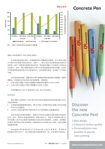 fifffififffflfiffffififfflfiff%u001afiff%u0019fiff%u0018fiff%u0017fiff%u0016fiff%u0015fiffifi%u001afi%u0018fi%u0016fifflfififi%u0014%u0013%u0012%u0011%u0010%u000f flfi%u0014%u0013%u0012%u0011%u0010%u000f %u0019fi%u0014%u0013%u0012%u0011%u0010%u000f fi%u0014%u0013%u0012%u0011%u0010%u000f flfi%u0014%u0013%u0012%u0011%u0010%u000f %u0019fi%u0014%u0013%u0012%u0011%u0010%u000ffi%u000e%u001a%u0019%u0013%u000c%u000b fi%u000e%u0018fi%u0013%u000c%u000b%u0009%u0008%u0007%u0006%u0008%u0005%u0004%u0003%u0001%u0001%u0081%u0007%u0006%u0013%u008d%u008f%u0003%u0004%u0090%u0007%u0013%u009d%u0014%u00a0 %u0005%u0009%u00ad%u0008%u0013%u009d%u00ad%u00ad%u00a0%u0080%u0082%u0001%u0001%u0004%u0005%u0013%u0003%u0005%u0009%u00ad%u0008 %u0083%u0001%u0082%u0004%u0005%u0013%u0003%u0005%u0009%u00ad%u0008 %u0084%u0013%u008d%u008f%u0003%u0004%u0090%u0007%u0013%u009d%u0014%u0013%u008f%u0012%u0013%u000b%u0001%u0082%u008d%u0007%u0006%u00a0Concrete Pen www.concretepenfactory.comDiscover the new Concrete Pen!%u00bb New design%u00bb Enhanced surface quality%u00bb Personalization now possible in precise color printing%u6df7%u51dd%u571f%u6280%u672fwww.cpi-worldwide.com CPI %u2013 %u56fd%u9645%u6df7%u51dd%u571f%u751f%u4ea7%u5382 %u2013 5 | 2025%u56fe 2%uff1a%u6df7%u51dd%u571f%u574d%u843d%u5ea6%u53ca%u76f8%u5e94%u9ad8%u6548%u51cf%u6c34%u5242%u63ba%u91cf%u6df7%u51dd%u571f%u7684%u574d%u843d%u5ea6%u4f4e%u4e8e 0.60 %u6c34%u80f6%u6bd4%u6df7%u51dd%u571f%u3002 %u5728%u672a%u63ba%u52a0%u9ad8%u6548%u51cf%u6c34%u5242%u65f6%uff0c%u574d%u843d%u5ea6%u968f fRCA %u63ba%u91cf%u589e%u52a0%u800c%u964d%u4f4e%u3002%u8fd9%u4e0e fRCA %u76f8%u8f83%u4e8e%u5929%u7136%u6c99%u4e18%u7802%u66f4%u9ad8%u7684%u5438%u6c34%u7387%u6709%u5173%uff08%u89c1%u8868 1%uff09%u3002fRCA %u56e0%u542b%u6709%u5b54%u9699%u7387%u8f83%u9ad8%u7684%u786c%u5316%u6c34%u6ce5%u6d46%u4f53%uff08HCP%uff09%u76f8%u800c%u5177%u6709%u66f4%u5f3a%u7684%u5438%u6c34%u7279%u6027%uff0c%u5bfc%u81f4%u65b0%u62cc%u6df7%u51dd%u571f%u4e2d%u53ef%u63d0%u4f9b%u5de5%u4f5c%u6027%u7684%u81ea%u7531%u6c34%u51cf%u5c11%u3002%u6b64%u5916%uff0cfRCA %u9897%u7c92%u901a%u5e38%u6bd4%u5929%u7136%u6c99%u4e18%u7802%u66f4%u5177%u68f1%u89d2%u6027%u548c%u7ec6%u957f%u5f62%u8c8c%uff0c%u4e14%u591a%u5b54%u6c34%u6ce5%u6d46%u4f53%u76f8%u4f7f%u5176%u5177%u6709%u66f4%u5927%u7684%u6bd4%u8868%u9762%u79ef [3]%uff0c%u8fd9%u4e9b%u56e0%u7d20%u53ef%u80fd%u8fdb%u4e00%u6b65%u52a0%u5267%u4e86%u5de5%u4f5c%u6027%u7684%u4e0b%u964d%u3002%u4e3a%u5b9e%u73b0%u540c%u7b49%u574d%u843d%u5ea6%uff0c%u9700%u968f fRCA %u66ff%u4ee3%u7387%u63d0%u9ad8%u800c%u589e%u52a0%u9ad8%u6548%u51cf%u6c34%u5242%u63ba%u91cf%u3002%u7ecf%u63ba%u52a0%u8c03%u6574%u540e%uff0c%u6240%u6709%u914d%u5408%u6bd4%u5747%u8fbe%u5230%u8bbe%u8ba1%u574d%u843d%u5ea6%u8981%u6c42%u3002%u5177%u4f53%u800c%u8a00%uff1a%u2022 0.45 %u6c34%u80f6%u6bd4%u6df7%u51dd%u571f%u7684%u51cf%u6c34%u5242%u63ba%u91cf%u4e3a%u80f6%u51dd%u6750%u6599%u8d28%u91cf%u7684 0.31%~0.87%%u2022 0.60 %u6c34%u80f6%u6bd4%u6df7%u51dd%u571f%u7684%u51cf%u6c34%u5242%u63ba%u91cf%u4e3a 0.25%~0.80%%u6240%u6709%u63ba%u91cf%u5747%u5904%u4e8e%u751f%u4ea7%u5382%u5bb6%u89c4%u5b9a%u7684 0.3%~3% %u5141%u8bb8%u8303%u56f4%u5185%u3002%u6297%u538b%u5f3a%u5ea6 %u786c%u5316%u6df7%u51dd%u571f%u5728%u6d47%u7b51%u540e 7 %u5929%u548c 28 %u5929%u7684%u5e73%u5747%u6297%u538b%u5f3a%u5ea6%u53ca%u76f8%u5e94%u6807%u51c6%u5dee%u5982%u56fe 3 %u6240%u793a%u3002%u8bd5%u9a8c%u7ed3%u679c%u8868%u660e%uff1a %u2022 %u5728%u5e38%u89c4%u8bd5%u9a8c%u6570%u636e%u79bb%u6563%u8303%u56f4%u5185%uff0cfRCA %u7684%u63ba%u5165%u5bf9%u4e24%u79cd%u6c34%u80f6%u6bd4%u6df7%u51dd%u571f%u7684%u6297%u538b%u5f3a%u5ea6%u5747%u672a%u4ea7%u751f%u8d1f%u9762%u5f71%u54cd %u2022 %u8fd9%u8bc1%u5b9e%u4e86%u5728%u7ed9%u5b9a%u66ff%u4ee3%u7387%u4e0b%u4f7f%u7528 fRCA %u751f%u4ea7%u7ed3%u6784%u6df7%u51dd%u571f%u7684%u666e%u904d%u9002%u7528%u6027 %u5728%u6240%u6709%u6c34%u80f6%u6bd4%u548c%u6d4b%u8bd5%u9f84%u671f%u4e0b%uff0c%u5404%u66ff%u4ee3%u6c34%u5e73%u7684%u6297%u538b%u5f3a%u5ea6%u5728%u8bef%u5dee%u8303%u56f4%u5185%u5747%u5177%u6709%u53ef%u6bd4%u6027%u3002%u6b64%u5916%uff0c%u53cc%u6837%u672c t %u68c0%u9a8c%u7ed3%u679c%u8868%u660e%uff0c%u4e24%u79cd%u6c34%u80f6%u6bd4%u4e0b%uff0c30% %u548c 50%fRCA %u66ff%u4ee3%u6c34%u5e73%u7684%u6df7%u51dd%u571f 28 %u5929%u6297%u538b%u5f3a%u5ea6%u4e0e%u57fa%u51c6%u914d%u5408%u6bd4%u76f8%u6bd4%u5747%u65e0%u663e%u8457%u5dee%u5f02%u3002%u8fd9%u8868%u660e%uff0c%u6309%u8d28%u91cf%u8ba1%u7528 fRCA %u66ff%u4ee3%u9ad8%u8fbe 50% %u7684%u7ec6%u9aa8%u6599%uff08%u5373%u7ec6%u9aa8%u6599%u4e2d%u6c99%u4e18%u7802%u7ec4%u5206%u7684 100%%uff09%u5bf9%u6297%u538b%u5f3a%u5ea6%u6027%u80fd%u5f71%u54cd%u6709%u9650%u3002Evangelista %u548c de Brito[7] %u4ee5 %u53ca Pereira %u7b49 %u4eba [9] %u4e5f %u89c2 %u5bdf %u5230%uff0c %u5728 30% %u548c50%fRCA %u66ff%u4ee3%u6c34%u5e73%u4e0b%uff0c%u6297%u538b%u5f3a%u5ea6%u7ed3%u679c%u4e0e%u57fa%u51c6%u914d%u5408%u6bd4%u4e00%u81f4%u3002%u4e0e%u672c%u7814%u7a76%u4e0d%u540c%u7684%u662f%uff0c