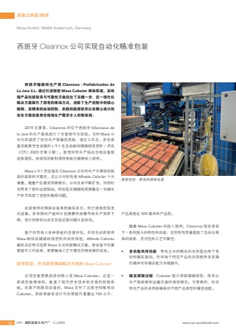 %u6df7%u51dd%u571f%u5236%u54c1/%u780c%u575750 CPI %u2013 %u56fd%u9645%u6df7%u51dd%u571f%u751f%u4ea7%u5382 %u2013 5 | 2025 www.cpi-worldwide.comMasa GmbH, 56626 Andernach, Germany%u897f%u73ed%u7259 Cleannox %u516c%u53f8%u5b9e%u73b0%u81ea%u52a8%u5316%u7cbe%u51c6%u5305%u88c5%u63a5%u53d7%u8003%u9a8c%uff1a%u539f%u6709%u7684%u5806%u579b%u8bbe%u5907%u897f%u73ed%u7259%u94fa%u8def%u7816%u751f%u4ea7%u5546 Cleannox - Prefabricados de La Jara S.L. %u901a%u8fc7%u5f15%u8fdb%u65b0%u578b Masa Cuboter %u5806%u579b%u7cfb%u7edf%uff0c%u5728%u7ec8%u7aef%u4ea7%u54c1%u5305%u88c5%u6548%u7387%u4e0e%u53ef%u9760%u6027%u65b9%u9762%u8fc8%u51fa%u4e86%u5173%u952e%u4e00%u6b65%u3002%u8fd9%u4e00%u73b0%u4ee3%u5316%u89e3%u51b3%u65b9%u6848%u53d6%u4ee3%u4e86%u539f%u6709%u7684%u5806%u579b%u65b9%u5f0f%uff0c%u6d88%u9664%u4e86%u751f%u4ea7%u6d41%u7a0b%u4e2d%u7684%u6838%u5fc3%u74f6%u9888%uff0c%u5176%u7cbe%u51c6%u7684%u8fd0%u52a8%u63a7%u5236%u3001%u5353%u8d8a%u7684%u80fd%u6e90%u6548%u7387%u4ee5%u53ca%u7cbe%u5fc3%u8bbe%u8ba1%u7684%u5b89%u5168%u65b9%u6848%u5b8c%u7f8e%u5951%u5408%u73b0%u573a%u751f%u4ea7%u9700%u6c42%u4ee4%u4eba%u5370%u8c61%u6df1%u523b%u30022019 %u5e74%u590f%u5b63%uff0cCleannox %u5bf9%u4f4d%u4e8e%u897f%u73ed%u7259 Villanueva de la Jara %u7684%u751f%u4ea7%u57fa%u5730%u8fdb%u884c%u4e86%u5168%u9762%u73b0%u4ee3%u5316%u6539%u9020%u3002%u5f53%u65f6 Masa %u516c%u53f8%u4e3a%u5176%u63d0%u4f9b%u4e86%u5305%u542b%u751f%u4ea7%u677f%u8f93%u9001%u7cfb%u7edf%u3001%u6db2%u538b%u5de5%u4f5c%u53f0%u3001%u591a%u8272%u88c5%u7f6e%u53ca%u914d%u5957%u5b89%u5168%u8bbe%u65bd%u7684 L 9.1 %u5168%u81ea%u52a8%u780c%u5757%u94fa%u8def%u7816%u6210%u578b%u673a%uff08%u8be6%u89c1%u300aCPi%u300b2020 %u5e74%u7b2c 3 %u671f%uff09%u3002%u65b0%u578b%u73af%u5f62%u751f%u4ea7%u7ebf%u7531%u5f53%u5730%u8bbe%u5907%u5236%u9020%u5546%u63d0%u4f9b%uff0c%u800c%u73b0%u6709%u7684%u914d%u6599%u6405%u62cc%u7cfb%u7edf%u4ecd%u7ee7%u7eed%u6295%u5165%u4f7f%u7528%u3002Masa L 9.1 %u578b%u8bbe%u5907%u5728 Cleannox %u516c%u53f8%u7684%u751f%u4ea7%u4e2d%u5c55%u73b0%u51fa%u6781%u9ad8%u7684%u6548%u7387%u548c%u53ef%u9760%u6027%uff0c%u8fd9%u8ba9%u516c%u53f8%u6240%u6709%u8005 Alfredo Cebri%u00e1n %u5341%u5206%u6ee1%u610f%u3002%u968f%u7740%u4ea7%u54c1%u9700%u6c42%u6301%u7eed%u589e%u957f%uff0c%u516c%u53f8%u4e1a%u52a1%u4e0d%u65ad%u6269%u5f20%uff0c%u4f46%u540c%u65f6%u4e5f%u5e26%u6765%u4e86%u65b0%u7684%u8fd0%u8425%u6311%u6218%uff0c%u7279%u522b%u662f%u5728%u94fa%u8def%u7816%u5c42%u5806%u53e0%u8fd9%u4e00%u5173%u952e%u751f%u4ea7%u73af%u8282%u51fa%u73b0%u4e86%u660e%u663e%u7684%u74f6%u9888%u95ee%u9898%u3002%u6b64%u524d%u4f7f%u7528%u7684%u5806%u579b%u8bbe%u5907%u867d%u7136%u670d%u5f79%u591a%u5e74%uff0c%u4f46%u5df2%u9010%u6e10%u663e%u73b0%u8001%u5316%u8ff9%u8c61%u3002%u5176%u6709%u9650%u7684%u4ea7%u80fd%u548c%u65e5%u76ca%u9891%u7e41%u7684%u6545%u969c%u5bfc%u81f4%u751f%u4ea7%u6548%u7387%u4e0b%u964d%u3001%u975e%u8ba1%u5212%u505c%u673a%u4ee5%u53ca%u4ea4%u8d27%u5ef6%u8fdf%u7b49%u95ee%u9898%u65e5%u76ca%u7a81%u51fa%u3002%u57fa%u4e8e%u5bf9%u5e02%u573a%u4e0a%u5404%u79cd%u7cfb%u7edf%u7684%u5168%u9762%u8bc4%u4f30%uff0c%u5e76%u7ed3%u5408%u6b64%u524d%u4f7f%u7528Masa %u780c%u5757%u53ca%u94fa%u8def%u7816%u6210%u578b%u673a%u7684%u826f%u597d%u4f53%u9a8c%uff0cAlfredo Cebri%u00e1n%u6700%u7ec8%u51b3%u5b9a%u518d%u6b21%u9009%u62e9 Masa %u516c%u53f8%u7684%u65b0%u89e3%u51b3%u65b9%u6848%u3002%u65b0%u8bbe%u5907%u4e0d%u4ec5%u9700%u8981%u63d0%u5347%u5de5%u4f5c%u6548%u7387%uff0c%u66f4%u8981%u786e%u4fdd%u5de5%u827a%u53ef%u9760%u6027%u5e76%u964d%u4f4e%u7ef4%u62a4%u6210%u672c%u3002%u6295%u8d44%u6548%u7387%uff1a%u4f5c%u4e3a%u65b0%u578b%u5806%u579b%u89e3%u51b3%u65b9%u6848%u7684 Masa Cuboter%u8fd9%u9879%u5168%u9762%u66f4%u6362%u6295%u8d44%u7684%u6838%u5fc3%u662f Masa Cuboter%uff0c%u8fd9%u662f%u4e00%u6b3e%u9ad8%u6027%u80fd%u5806%u579b%u673a%uff0c%u914d%u5907%u4e86%u73b0%u4ee3%u5b89%u5168%u6280%u672f%u548c%u5168%u65b0%u7684%u63a7%u5236%u7cfb%u7edf%u3002%u5728%u5ba2%u6237%u62c6%u9664%u65e7%u8bbe%u5907%u540e%uff0cMasa %u4ea4%u4ed8%u4e86%u8fd9%u6b3e%u5168%u4f3a%u670d%u7535%u52a8Cuboter%u3002%u5176%u6807%u51c6%u7248%u672c%u8bbe%u8ba1%u53ef%u5904%u7406%u63d0%u5347%u91cd%u91cf%u8fbe 700 %u516c%u65a4%u3001%u4ea7%u54c1%u9ad8%u5ea6%u8fbe 500 %u6beb%u7c73%u7684%u4ea7%u54c1%u5c42%u3002%u968f%u7740 Masa Cuboter %u7684%u6295%u5165%u4f7f%u7528%uff0cCleannox %u73b0%u5728%u53d7%u76ca%u4e8e%u4e00%u7cfb%u5217%u5f3a%u5927%u7684%u7279%u6027%u548c%u529f%u80fd%uff0c%u8fd9%u4e9b%u7279%u6027%u663e%u8457%u63d0%u9ad8%u4e86%u81ea%u52a8%u5316%u5806%u579b%u7684%u6548%u7387%u3001%u7075%u6d3b%u6027%u548c%u5de5%u827a%u53ef%u9760%u6027%uff1a%u2022 %u591a%u529f%u80fd%u5939%u6301%u529f%u80fd%uff1a%u5e26%u6709%u4e3b%u5939%u548c%u4fa7%u5939%u7684%u5939%u6301%u7bee%u7531%u4e24%u4e2a%u7535%u52a8%u4f3a%u670d%u7f38%u9a71%u52a8%u3002%u9488%u5bf9%u6bcf%u4e2a%u7279%u5b9a%u4ea7%u54c1%u7684%u5939%u6301%u7a0b%u5e8f%u53ca%u5176%u64cd%u4f5c%u987a%u5e8f%u53ef%u5b58%u50a8%u5728%u914d%u65b9%u5b58%u50a8%u5668%u4e2d%u3002%u2022 %u7a33%u5b9a%u6293%u53d6%u8fc7%u7a0b%uff1aCuboter %u5f3a%u529b%u6293%u53d6%u94fa%u8def%u7816%u5c42%uff0c%u4f7f%u5176%u4ece%u751f%u4ea7%u677f%u8f6c%u79fb%u5230%u8fd0%u8f93%u6258%u76d8%u65f6%u4fdd%u6301%u7a33%u5b9a%u3002%u53ef%u66f4%u6362%u7684%u3001%u9488%u5bf9%u7279%u5b9a%u4ea7%u54c1%u7684%u5939%u6301%u8f68%u786e%u4fdd%u5bf9%u4e0d%u540c%u4ea7%u54c1%u7c7b%u578b%u7684%u6700%u4f73%u9002%u914d%u3002