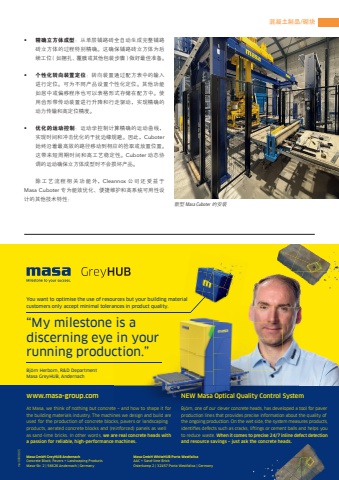 Masa GmbH GreyHUB Andernach Concrete Block, Pavers + Landscaping ProductsMasa-Str. 2 | 56626 Andernach | GermanyMasa GmbH WhiteHUB Porta WestfalicaAAC + Sand-lime BrickOsterkamp 2 | 32457 Porta Westfalica | GermanyAt Masa, we think of nothing but concrete %u2013 and how to shape it for the building materials industry. The machines we design and build are used for the production of concrete blocks, pavers or landscaping products, aerated concrete blocks and (reinforced) panels as well as sand-lime bricks. In other words, we are real concrete heads with a passion for reliable, high-performance machines.Bj%u00f6rn, one of our clever concrete heads, has developed a tool for paver production lines that provides precise information about the quality of the ongoing production. On the wet side, the system measures products, identifi es defects such as cracks, liftings or cement balls and helps you to reduce waste. When it comes to precise 24/7 inline defect detection and resource savings %u2013 just ask the concrete heads.You want to optimise the use of resources but your building material customers only accept minimal tolerances in product quality.%u201cMy milestone is a discerning eye in your running production.%u201dBj%u00f6rn Herborn, R%u2009&%u2009D DepartmentMasa GreyHUB, Andernachwww.masa-group.com NEW Masa Optical Quality Control Systemma-0000805%u6df7%u51dd%u571f%u5236%u54c1/%u780c%u5757%u65b0%u578b Masa Cuboter %u7684%u5b89%u88c5%u2022 %u7cbe%u786e%u7acb%u65b9%u4f53%u6210%u578b%uff1a%u4ece%u5355%u5c42%u94fa%u8def%u7816%u5168%u81ea%u52a8%u751f%u6210%u5b8c%u6574%u94fa%u8def%u7816%u7acb%u65b9%u4f53%u7684%u8fc7%u7a0b%u7279%u522b%u7cbe%u786e%u3002%u8fd9%u786e%u4fdd%u94fa%u8def%u7816%u7acb%u65b9%u4f53%u4e3a%u540e%u7eed%u5de5%u4f4d%uff08%u5982%u6346%u624e%u3001%u8986%u819c%u6216%u5176%u4ed6%u5305%u88c5%u6b65%u9aa4%uff09%u505a%u597d%u6700%u4f73%u51c6%u5907%u3002%u2022 %u4e2a%u6027%u5316%u8f6c%u5411%u88c5%u7f6e%u5b9a%u4f4d%uff1a%u8f6c%u5411%u88c5%u7f6e%u901a%u8fc7%u914d%u65b9%u8868%u4e2d%u7684%u8f93%u5165%u8fdb%u884c%u5b9a%u4f4d%u3002%u53ef%u4e3a%u4e0d%u540c%u4ea7%u54c1%u8bbe%u7f6e%u4e2a%u6027%u5316%u5b9a%u4f4d%u3002%u5176%u4ed6%u529f%u80fd%u5982%u5c45%u4e2d%u6216%u504f%u79fb%u7a0b%u5e8f%u4e5f%u53ef%u4ee5%u8868%u683c%u5f62%u5f0f%u5b58%u50a8%u5728%u914d%u65b9%u4e2d%u3002%u4f7f%u7528%u9f7f%u5f62%u5e26%u4f20%u52a8%u88c5%u7f6e%u8fdb%u884c%u5347%u964d%u548c%u884c%u8d70%u9a71%u52a8%uff0c%u5b9e%u73b0%u7cbe%u786e%u7684%u52a8%u529b%u4f20%u8f93%u548c%u9ad8%u5b9a%u4f4d%u7cbe%u5ea6%u3002%u2022 %u4f18%u5316%u7684%u8fd0%u52a8%u63a7%u5236%uff1a%u8fd0%u52a8%u5b66%u63a7%u5236%u8ba1%u7b97%u7cbe%u786e%u7684%u8fd0%u52a8%u66f2%u7ebf%uff0c%u5b9e%u73b0%u65f6%u95f4%u548c%u51b2%u51fb%u4f18%u5316%u7684%u5e72%u6270%u8fb9%u7f18%u89c4%u907f%u3002%u56e0%u6b64%uff0cCuboter%u59cb%u7ec8%u6cbf%u7740%u6700%u9ad8%u6548%u7684%u8def%u5f84%u79fb%u52a8%u5230%u76f8%u5e94%u7684%u62fe%u53d6%u6216%u653e%u7f6e%u4f4d%u7f6e%u3002%u8fd9%u5e26%u6765%u77ed%u5468%u671f%u65f6%u95f4%u548c%u9ad8%u5de5%u827a%u7a33%u5b9a%u6027%u3002Cuboter %u52a8%u6001%u534f%u8c03%u7684%u8fd0%u52a8%u786e%u4fdd%u7acb%u65b9%u4f53%u6210%u578b%u65f6%u4e0d%u4f1a%u635f%u574f%u4ea7%u54c1%u3002%u9664%u5de5%u827a%u6d41%u7a0b%u76f8%u5173%u529f%u80fd%u5916%uff0cCleannox %u516c%u53f8%u8fd8%u53d7%u76ca%u4e8eMasa Cuboter %u4e13%u4e3a%u80fd%u6548%u4f18%u5316%u3001%u4fbf%u6377%u7ef4%u62a4%u548c%u9ad8%u7cfb%u7edf%u53ef%u7528%u6027%u8bbe%u8ba1%u7684%u5176%u4ed6%u6280%u672f%u7279%u6027%uff1a