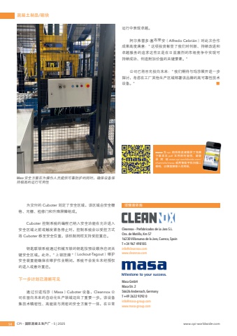 Cleannox %u2013 Prefabricados de La Jara S.L.Ctra. de Motilla, Km 57 16230 Villanueva de la Jara, Cuenca, SpainT +34 967 498185info@cleannox.comwww.cleannox.comMasa GmbHMasa-Str. 256626 Andernach, GermanyT +49 2632 9292 0info@masa-group.comwww.masa-group.com%u6df7%u51dd%u571f%u5236%u54c1/%u780c%u575754 CPI %u2013 %u56fd%u9645%u6df7%u51dd%u571f%u751f%u4ea7%u5382 %u2013 5 | 2025 www.cpi-worldwide.com%u8be6%u60c5%u8bf7%u54a8%u8be2masa %u4e3a cpi %u7684%u6240%u6709%u8bfb%u8005%u63d0%u4f9b%u4e86%u514d%u8d39%u4e0b%u8f7d%u672c%u6587 pdf %u6587%u4ef6%u7684%u53ef%u80fd%u6027%u3002%u8bf7%u767b%u5f55%u7f51%u7ad9 www.cpi-worldwide.com/channels/masa %u6216%u7528%u667a%u80fd%u624b%u673a%u626b%u63cf%u4e8c%u7ef4%u7801%uff0c%u4ee5%u4fbf%u76f4%u63a5%u767b%u5165%u672c%u7f51%u7ad9%u3002Masa %u5b89%u5168%u65b9%u6848%u5728%u4e3a%u64cd%u4f5c%u4eba%u5458%u63d0%u4f9b%u53ef%u9760%u9632%u62a4%u7684%u540c%u65f6%uff0c%u786e%u4fdd%u8bbe%u5907%u4fdd%u6301%u6781%u9ad8%u7684%u8fd0%u884c%u53ef%u7528%u6027%u4e3a%u4ea4%u4ed8%u7684 Cuboter %u5212%u5b9a%u4e86%u5b89%u5168%u533a%u57df%uff0c%u8be5%u533a%u57df%u7531%u5b89%u5168%u6805%u683c%u3001%u5149%u6805%u3001%u68c0%u4fee%u95e8%u548c%u5347%u964d%u5c4f%u969c%u7ec4%u6210%u3002 Cuboter %u63a7%u5236%u7cfb%u7edf%u7684%u7f16%u7a0b%u5df2%u7eb3%u5165%u5b89%u5168%u529f%u80fd%u5728%u5141%u8bb8%u8fdb%u5165%u5b89%u5168%u533a%u57df%u4e4b%u524d%u6216%u89e6%u53d1%u7d27%u6025%u505c%u6b62%u65f6%uff0c%u63a7%u5236%u7cfb%u7edf%u4f1a%u4ee5%u53d7%u63a7%u65b9%u5f0f%u5c06 Cuboter %u79fb%u81f3%u5b89%u5168%u4f4d%u7f6e%uff0c%u8be5%u673a%u5236%u540c%u6837%u652f%u6301%u53d7%u63a7%u91cd%u542f%u3002 %u94a5%u5319%u8054%u9501%u7cfb%u7edf%u901a%u8fc7%u673a%u68b0%u4e92%u9501%u7684%u94a5%u5319%u6309%u9884%u8bbe%u987a%u5e8f%u542f%u95ed%u5173%u952e%u5b89%u5168%u533a%u57df%u3002%u6b64%u5916%uff0c\%u5b89%u5168%u88c5%u7f6e%u80fd%u786e%u4fdd%u5728%u7ef4%u62a4%u4f5c%u4e1a%u671f%u95f4%uff0c%u7cfb%u7edf%u4e0d%u4f1a%u53d1%u751f%u672a%u7ecf%u6388%u6743%u7684%u8fdb%u5165%u6216%u610f%u5916%u91cd%u542f%u3002 %u4e0b%u4e00%u6b65%u8ba1%u5212%u5df2%u6e05%u6670%u53ef%u89c1 %u901a%u8fc7%u5f15%u8fdb%u739b%u838e%uff08Masa%uff09Cuboter %u8bbe%u5907%uff0cCleannox %u516c%u53f8%u5728%u9762%u5411%u672a%u6765%u7684%u81ea%u52a8%u5316%u751f%u4ea7%u9886%u57df%u8fc8%u51fa%u4e86%u91cd%u8981%u4e00%u6b65%u3002%u8be5%u8bbe%u5907%u96c6%u6280%u672f%u7cbe%u5bc6%u6027%u3001%u9ad8%u80fd%u6548%u4e0e%u5468%u5bc6%u7684%u5b89%u5168%u65b9%u6848%u4e8e%u4e00%u4f53%uff0c%u5728%u65e5%u5e38%u8fd0%u884c%u4e2d%u8868%u73b0%u5353%u8d8a%u3002%u963f%u5c14%u5f17%u96f7%u591a%u00b7%u585e%u5e03%u91cc%u5b89%uff08Alfredo Cebri%u00e1n%uff09%u5bf9%u6b64%u6b21%u5408%u4f5c%u6210%u679c%u9ad8%u5ea6%u6ee1%u610f%uff1a\%u5353%u8d8a%u670d%u52a1%u7684%u8ffd%u6c42%u8fd9%u4e9b%u6b63%u662f%u5728%u65e5%u76ca%u6fc0%u70c8%u7684%u5e02%u573a%u7ade%u4e89%u4e2d%u5b9e%u73b0%u53ef%u6301%u7eed%u6210%u529f%u3001%u521b%u9020%u9644%u52a0%u4ef7%u503c%u7684%u5173%u952e%u8981%u7d20%u3002\%u516c%u53f8%u5df2%u5c06%u76ee%u5149%u6295%u5411%u672a%u6765%uff1a\%u63a2%u8ba8%uff0c%u8003%u8651%u5728%u5de5%u5382%u5176%u4ed6%u751f%u4ea7%u533a%u57df%u90e8%u7f72%u8be5%u54c1%u724c%u7684%u9ad8%u53ef%u9760%u6027%u6280%u672f%u8bbe%u5907%u3002\%u25a0