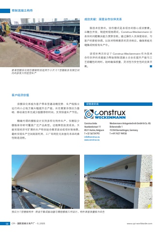 Weckenmann Anlagentechnik GmbH & Co. KG Birkenstra%u00dfe 1 72358 Dormettingen, Germany T +49 7427 94930 Construx bvba Hazebeekstraat 11 8531 Hulste, Belgium T +32 56724793 info@construx.eu www.construx.eu %u9884%u5236%u6df7%u51dd%u571f%u6784%u4ef658 CPI %u2013 %u56fd%u9645%u6df7%u51dd%u571f%u751f%u4ea7%u5382 %u2013 5 | 2025 www.cpi-worldwide.com%u8be6%u60c5%u8bf7%u54a8%u8be2%u7d27%u51d1%u578b%u6a21%u5757%u5316%u7ec4%u5408%u6a21%u677f%u7279%u522b%u9002%u7528%u4e8e%u5c0f%u5c3a%u5bf8 T %u578b%u697c%u677f%u53ca%u6709%u9650%u7a7a%u95f4%u5185%u7684%u591a%u53d8%u51e0%u4f55%u9020%u578b%u751f%u4ea7%u9884%u5e94%u529b T %u578b%u697c%u677f%u6784%u4ef6 - %u5f97%u76ca%u4e8e%u96c6%u6210%u632f%u52a8%u5668%u4e0e%u7cbe%u5bc6%u6a21%u677f%u51e0%u4f55%u8bbe%u8ba1%uff0c%u6784%u4ef6%u8868%u9762%u8d28%u91cf%u6781%u4e3a%u51fa%u8272%u5ba2%u6237%u7ecf%u6d4e%u4ef7%u503c %u8be5%u6a21%u5757%u5316%u7cfb%u7edf%u4e3a%u5ba2%u6237%u5e26%u6765%u663e%u8457%u6218%u7565%u4f18%u52bf%uff1a%u751f%u4ea7%u7ebf%u72ec%u7acb%u8fd0%u884c%u7684%u5c0f%u5360%u5730%u65b9%u6848%u5927%u5e45%u63d0%u5347%u603b%u4ea7%u80fd%uff0c%u4e14%u65e0%u9700%u590d%u6742%u9884%u5e94%u529b%u57fa%u7840%uff1b%u79fb%u52a8%u6db2%u538b%u5355%u5143%u51cf%u5c11%u8131%u6a21%u505c%u673a%u65f6%u95f4%uff0c%u652f%u6301%u5feb%u901f%u751f%u4ea7%u8282%u62cd%u3002%u7cbe%u786e%u53ef%u8c03%u7684%u6a21%u677f%u8bbe%u8ba1%u652f%u6301%u591a%u6837%u5316%u6784%u4ef6%u751f%u4ea7%uff0c%u4ec5%u9700%u8f83%u5c11%u6a21%u677f%u5e93%u5b58%u5373%u53ef%u8986%u76d6%u5e7f%u6cdb%u4ea7%u54c1%u7c7b%u578b%u3002%u8fd9%u65e2%u964d%u4f4e%u6295%u8d44%u6210%u672c%uff0c%u53c8%u80fd%u5b9e%u73b0%u7ecf%u6d4e%u53ef%u6269%u5c55%u7684%u751f%u4ea7%u7279%u522b%u9002%u5408%u9700%u6c42%u6ce2%u52a8%u6216%u9879%u76ee%u5236%u573a%u666f%uff0c%u6700%u7ec8%u5b9e%u73b0%u751f%u4ea7%u7a7a%u95f4%u9ad8%u6548%u5229%u7528%u3001%u5de5%u5382%u5e03%u5c40%u4f18%u5316%u53ca%u9762%u5411%u672a%u6765%u7684%u67d4%u6027%u5236%u9020%u6d41%u7a0b%u3002 %u6210%u529f%u5173%u952e%uff1a%u6df1%u5ea6%u5408%u4f5c%u4f19%u4f34%u5173%u7cfb%u9664%u6280%u672f%u4f18%u52bf%u5916%uff0c%u534f%u4f5c%u6a21%u5f0f%u662f%u672c%u9879%u76ee%u7684%u6838%u5fc3%u6210%u529f%u8981%u7d20%u3002%u4ece%u6982%u5ff5%u5f00%u53d1%u3001%u5236%u9020%u5230%u73b0%u573a%u8c03%u8bd5%uff0cConstrux-Weckenmann %u4ee5%u52a1%u5b9e%u7684%u95ee%u9898%u89e3%u51b3%u80fd%u529b%u8d2f%u7a7f%u5168%u7a0b%u3002%u901a%u8fc7%u64cd%u4f5c%u4eba%u5458%u6df1%u5ea6%u57f9%u8bad%u3001%u4e0e%u5ba2%u6237%u7684%u7d27%u5bc6%u534f%u8c03%uff0c%u4ee5%u53ca%u5bf9%u7279%u6b8a%u9700%u6c42%u7684%u7075%u6d3b%u54cd%u5e94%uff0c%u786e%u4fdd%u7cfb%u7edf%u65e0%u7f1d%u96c6%u6210%u5230%u73b0%u6709%u751f%u4ea7%u4e2d%u3002 %u8be5%u9879%u76ee%u518d%u6b21%u5370%u8bc1%u4e86 Construx-Weckenmann %u4f5c%u4e3a%u6280%u672f%u5408%u4f5c%u4f19%u4f34%u7684%u5353%u8d8a%u80fd%u529b%u5e2e%u52a9%u9884%u5236%u6df7%u51dd%u571f%u4f01%u4e1a%u5728%u63d0%u5347%u4ea7%u80fd%u4e0e%u5de5%u827a%u524d%u77bb%u6027%u7684%u540c%u65f6%uff0c%u59cb%u7ec8%u786e%u4fdd%u8d28%u91cf%u3001%u7075%u6d3b%u6027%u4e0e%u5b89%u5168%u6027%u7684%u5b8c%u7f8e%u5e73%u8861%u3002 %u25a0