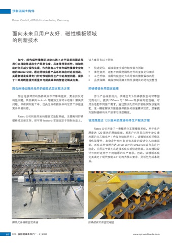 %u9884%u5236%u6df7%u51dd%u571f%u6784%u4ef660 CPI %u2013 %u56fd%u9645%u6df7%u51dd%u571f%u751f%u4ea7%u5382 %u2013 5 | 2025 www.cpi-worldwide.comRatec GmbH, 68766 Hockenheim, Germany%u9762%u5411%u672a%u6765%u4e14%u7528%u6237%u53cb%u597d%uff1a%u78c1%u6027%u6a21%u677f%u9886%u57df%u7684%u521b%u65b0%u6280%u672f%u9694%u70ed%u5143%u4ef6%u78c1%u5438%u56fa%u5b9a%u7cfb%u7edf %u9636%u68af%u6a21%u677f%u4e13%u7528%u56fa%u5b9a%u78c1%u5ea7%u5982%u4eca%uff0c%u73b0%u4ee3%u78c1%u6027%u6a21%u677f%u7684%u529f%u80fd%u5df2%u8fdc%u4e0d%u6b62%u4e8e%u7b80%u5355%u7684%u56fa%u5b9a%u4f5c%u7528%u5b83%u5fc5%u987b%u80fd%u591f%u9002%u5e94%u751f%u4ea7%u5468%u671f%u8282%u594f%u3001%u5177%u5907%u4f7f%u7528%u7075%u6d3b%u6027%u3001%u7f29%u77ed%u7ec4%u88c5%u65f6%u95f4%u5e76%u51cf%u5c11%u64cd%u4f5c%u5931%u8bef%u3002%u4f5c%u4e3a%u62e5%u6709%u4e09%u5341%u4f59%u5e74%u78c1%u6027%u6a21%u677f%u4e13%u4e1a%u7ecf%u9a8c%u7684 Ratec %u516c%u53f8%uff0c%u901a%u8fc7%u6301%u7eed%u5b8c%u5584%u4ea7%u54c1%u7cfb%u5217%u6765%u5e94%u5bf9%u8fd9%u4e9b%u6311%u6218%u3002%u5176%u6700%u65b0%u7814%u53d1%u6210%u679c%u4e13%u95e8%u9488%u5bf9%u9884%u5236%u6784%u4ef6%u751f%u4ea7%u4e2d%u7684%u5178%u578b%u95ee%u9898%uff0c%u63d0%u4f9b%u4e86%u4e00%u7cfb%u5217%u65e2%u80fd%u63d0%u5347%u8d28%u91cf%u53c8%u53ef%u63d0%u9ad8%u6548%u7387%u7684%u667a%u80fd%u5316%u89e3%u51b3%u65b9%u6848%u3002%u9633%u53f0%u8fde%u63a5%u5904%u9694%u70ed%u5143%u4ef6%u7684%u78c1%u5438%u5f0f%u56fa%u5b9a%u89e3%u51b3%u65b9%u6848 %u9633%u53f0%u8fde%u63a5%u90e8%u4f4d%u7684%u70ed%u6865%u6548%u5e94%u4e0d%u4ec5%u5f71%u54cd%u80fd%u6548%uff0c%u66f4%u4f1a%u5f15%u53d1%u7ed3%u6784%u6027%u95ee%u9898%u3002%u867d%u7136%u91c7%u7528 Isokorb %u7b49%u9694%u70ed%u5143%u4ef6%u53ef%u4ece%u7ed3%u6784%u4e0a%u89e3%u51b3%u8be5%u95ee%u9898%uff0c%u4f46%u5728%u5b9e%u9645%u65bd%u5de5%u4e2d%uff0c%u8fd9%u7c7b%u5143%u4ef6%u5728%u6a21%u677f%u4e2d%u7684%u5b9a%u4f4d%u5de5%u5e8f%u5f80%u5f80%u590d%u6742%u4e14%u6613%u51fa%u9519%u3002 Ratec %u516c%u53f8%u521b%u65b0%u5f00%u53d1%u7684%u78c1%u5438%u5f0f%u9002%u914d%u7cfb%u7edf%uff0c%u65e0%u9700%u8017%u65f6%u62e7%u7d27%u87ba%u6813%u6216%u52a0%u88c5%u652f%u67b6%uff0c%u5373%u53ef%u5c06 Isokorb %u7262%u56fa%u56fa%u5b9a%u4e8e%u9884%u5236%u53f0%u5ea7%u4e0a%u3002%u8be5%u65b9%u6848%u5177%u6709%u4ee5%u4e0b%u4f18%u52bf%uff1a %u2022 %u5feb%u901f%u5b9a%u4f4d%uff1a%u78c1%u5438%u88c5%u7f6e%u5b9e%u73b0%u79d2%u7ea7%u5b89%u88c5%u4e0e%u62c6%u5378 %u2022 %u67d4%u6027%u590d%u7528%uff1a%u9002%u914d%u4e0d%u540c%u89c4%u683c%u9694%u70ed%u5143%u4ef6%u7684%u91cd%u590d%u5b9a%u4f4d%u9700%u6c42 %u2022 %u5de5%u827a%u5347%u7ea7%uff1a%u6d88%u9664%u4f20%u7edf%u56fa%u5b9a%u65b9%u5f0f%u5bfc%u81f4%u7684%u6a21%u677f%u504f%u79fb%u98ce%u9669 %u2022 %u54c1%u8d28%u4fdd%u969c%uff1a%u786e%u4fdd%u9884%u5236%u6df7%u51dd%u571f%u6784%u4ef6%u63a5%u7f1d%u5904%u7684%u7ed3%u6784%u5b8c%u6574%u6027 %u9636%u68af%u6a21%u677f%u4e13%u7528%u56fa%u5b9a%u78c1%u5ea7%u4f5c%u4e3a%u4ea7%u54c1%u7ebf%u65b0%u6210%u5458%uff0c%u8be5%u78c1%u5ea7%u4e13%u4e3a%u9636%u68af%u6a21%u677f%u9762%u7684%u53ef%u9760%u56fa%u5b9a%u800c%u8bbe%u8ba1%u3002%u63d0%u4f9b 150mm %u4e0e 180mm %u7b49%u591a%u79cd%u9ad8%u5ea6%u89c4%u683c%uff0c%u53ef%u7075%u6d3b%u9002%u914d%u4e0d%u540c%u65bd%u5de5%u9700%u6c42%u3002%u901a%u8fc7%u9884%u8bbe%u5b54%u4f4d%u7684%u5b89%u88c5%u677f%u5b9e%u73b0%u5feb%u901f%u88c5%u914d%uff0c%u8fd9%u4e00%u7cbe%u5bc6%u89e3%u51b3%u65b9%u6848%u80fd%u786e%u4fdd%u6a21%u677f%u7684%u5feb%u901f%u7cbe%u51c6%u5b9a%u4f4d%uff0c%u663e%u8457%u63d0%u5347%u9884%u5236%u697c%u68af%u7684%u751f%u4ea7%u6548%u7387%u4e0e%u6210%u578b%u7cbe%u5ea6%u3002 %u9488%u5bf9%u539a%u5ea6%u8fbe 120 %u5398%u7c73%u7684%u539a%u5899%u6784%u4ef6%u751f%u4ea7%u89e3%u51b3%u65b9%u6848Ratec %u516c%u53f8%u5f00%u53d1%u4e86%u4e00%u5957%u6a21%u5757%u5316%u652f%u6491%u6a21%u677f%u7cfb%u7edf%uff0c%u7528%u4e8e%u751f%u4ea7%u539a%u5ea6%u8fbe 120 %u5398%u7c73%u7684%u539a%u5899%u622a%u9762%u3002%u67d0%u5ba2%u6237%u5df2%u5c06%u5176%u5e94%u7528%u4e8e 840 %u6beb%u7c73%u539a%u7684%u5939%u82af%u5899%u751f%u4ea7%uff08%u542b%u590d%u6742%u7ec6%u90e8%u7ed3%u6784%uff09%u3002%u8be5%u6a21%u677f%u7cfb%u7edf%u51ed%u501f%u5176%u64cd%u4f5c%u7b80%u4fbf%u6027%u3001%u9ad8%u7a33%u5b9a%u6027%u548c%u53ef%u8d77%u91cd%u673a%u540a%u88c5%u7684%u8bbe%u8ba1%u4ee4%u4eba%u5370%u8c61%u6df1%u523b%u3002%u7cfb%u7edf%u91c7%u7528%u5438%u9644%u529b%u8fbe 2100 %u516c%u65a4%u7684 SPB2100 %u78c1%u529b%u76d2%u8fdb%u884c%u56fa%u5b9a%uff0c%u5e76%u5f97%u76ca%u4e8e%u9501%u5b54%u5f0f%u8fde%u63a5%u7cfb%u7edf%u5b9e%u73b0%u5feb%u901f%u7ec4%u88c5%u3002%u5176%u53cc%u6a21%u5757%u8bbe%u8ba1%u53ef%u540c%u65f6%u9002%u7528%u4e8e%u4e0d%u540c%u5899%u539a%u7684%u751f%u4ea7%u9700%u6c42%u3002%u56e0%u6b64%uff0c%u8be5%u6a21%u677f%u7cfb%u7edf%u5b8c%u7f8e%u6ee1%u8db3%u4e86%u73b0%u4ee3%u9884%u5236%u5de5%u5382%u7684%u4e24%u5927%u6838%u5fc3%u8981%u6c42%uff1a%u7075%u6d3b%u6027%u4e0e%u6210%u672c%u6548%u76ca%u3002