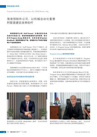 %u9884%u5236%u6df7%u51dd%u571f%u6784%u4ef664 CPI %u2013 %u56fd%u9645%u6df7%u51dd%u571f%u751f%u4ea7%u5382 %u2013 5 | 2025 www.cpi-worldwide.comProgress Machines & Automation AG, 39042 Brixen, Italy%u6d77%u6e7e%u9884%u5236%u4ef6%u516c%u53f8%uff1a%u4ee5%u673a%u68b0%u81ea%u52a8%u5316%u91cd%u5851%u963f%u8054%u914b%u5efa%u7b51%u6548%u7387%u6807%u6746%u6d77%u6e7e%u9884%u5236%u4ef6%u516c%u53f8%u603b%u7ecf%u7406%uff08Valentijn Blonk%uff09%u5f3a%u8c03%uff1a\%u6211%u4eec%u4ea7%u80fd%u6269%u5f20%u7684%u6838%u5fc3%u9a71%u52a8%u529b%u3002\%u6d77%u6e7e%u9884%u5236%u4ef6%u516c%u53f8%u9ad8%u7ea7%u5de5%u5382%u7ecf%u7406%uff08Walid Aoun%uff09%u6307%u51fa%uff1a\%u7edf%u7684%u5e94%u7528%u4f7f%u6211%u4eec%u7684%u751f%u4ea7%u89c4%u5212%u4e0e%u6267%u884c%u6548%u7387%u5f97%u5230%u663e%u8457%u63d0%u5347%u3002\%u6d77%u6e7e%u9884%u5236%u4ef6%u516c%u53f8%uff08Gulf Precast%uff09%u6b63%u901a%u8fc7%u524d%u6cbf%u81ea%u52a8%u5316%u6280%u672f%u4e0e%u5148%u8fdb%u5de5%u827a%uff0c%u63a8%u52a8%u963f%u8054%u914b%u5efa%u7b51%u884c%u4e1a%u7684%u53d8%u9769%u3002%u8be5%u516c%u53f8 %u4e0e Progress Group %u96c6%u56e2%u5408%u4f5c%uff0c%u91c7%u7528%u5168%u65b0 M-System BlueMesh%u00ae %u94a2%u7b4b%u7f51%u710a%u63a5%u751f%u4ea7%u7ebf%uff0c%u663e%u8457%u63d0%u5347%u751f%u4ea7%u6548%u7387%u5e76%u91cd%u5851%u7f51%u7247%u4ea7%u54c1%u7684%u8d28%u91cf%u6807%u51c6%u3002 %u6d77%u6e7e%u9884%u5236%u4ef6%u516c%u53f8%uff08Gulf Precast%uff09%u521b%u7acb%u4e8e 1984 %u5e74%uff0c%u73b0%u5df2%u53d1%u5c55%u6210%u4e3a%u963f%u8054%u914b%u9886%u5148%u7684%u9884%u5236%u6df7%u51dd%u571f%u5236%u9020%u5546%u4e4b%u4e00%uff0c%u5728%u8be5%u5730%u533a%u57ce%u5e02%u5929%u9645%u7ebf%u7684%u5851%u9020%u4e2d%u53d1%u6325%u7740%u5173%u952e%u4f5c%u7528%u3002%u51ed%u501f%u627f%u63a5%u8fea%u62dc%u8d2d%u7269%u4e2d%u5fc3%uff08Dubai Mall%uff09%u548c%u963f%u5e03%u624e%u6bd4%u673a%u573a%uff08Abu Dhabi Airport%uff09%u7b49%u5730%u6807%u9879%u76ee%u7684%u4e30%u5bcc%u7ecf%u9a8c%uff0c%u8be5%u516c%u53f8%u5df2%u4ece%u5355%u4e00%u5de5%u5382%u53d1%u5c55%u4e3a%u62e5%u6709%u591a%u4e2a%u751f%u4ea7%u57fa%u5730%u7684%u884c%u4e1a%u5de8%u5934%u3002%u76ee%u524d%uff0c%u516c%u53f8%u5728%u963f%u5e03%u624e%u6bd4%u8fd0%u8425%u4e09%u5bb6%u9884%u5236%u6784%u4ef6%u5de5%u5382%uff0c%u5728%u8fea%u62dc%u8bbe%u6709%u4e24%u5904%u751f%u4ea7%u57fa%u5730%uff0c%u5176%u4e2d%u5305%u62ec%u4e13%u95e8%u751f%u4ea7%u7a7a%u5fc3%u697c%u677f%u7684%u4e13%u7528%u8bbe%u65bd%u3002%u6d77%u6e7e%u9884%u5236%u4ef6%u516c%u53f8%u603b%u7ecf%u7406 Valentijn Blonk %u8868%u793a%uff1a\%u5730%u533a%u9996%u6279%u9884%u5236%u6784%u4ef6%u751f%u4ea7%u4f01%u4e1a%u4e4b%u4e00%uff0c%u6211%u4eec%u5df2%u5927%u5e45%u63d0%u5347%u4ea7%u80fd%u4ee5%u6ee1%u8db3%u5e02%u573a%u9700%u6c42%uff0c%u5e76%u5728%u521b%u65b0%u4e0e%u81ea%u52a8%u5316%u9886%u57df%u6295%u5165%u5de8%u8d44%u3002\%u81ea%u52a8%u5316%u5728%u5e94%u5bf9%u5e02%u573a%u9700%u6c42%u4e2d%u7684%u5173%u952e%u4f5c%u7528 2020 %u5e74%u540e%uff0c%u963f%u8054%u914b%u5efa%u7b51%u4e1a%u5f3a%u52bf%u590d%u82cf%uff0c%u522b%u5885%u3001%u5b66%u6821%u53ca%u57fa%u7840%u8bbe%u65bd%u5efa%u8bbe%u9879%u76ee%u9700%u6c42%u6fc0%u589e%u3002%u6d77%u6e7e%u9884%u5236%u4ef6%u516c%u53f8%uff08Gulf Precast%uff09%u51ed%u501f%u6bcf%u65e5%u8d85 1,000 %u7acb%u65b9%u7c73%u7684%u9884%u5236%u6df7%u51dd%u571f%u4ea7%u80fd%u76f8%u5f53%u4e8e%u6bcf%u65e5%u5efa%u6210 8 %u680b%u522b%u5885%u7684%u65bd%u5de5%u91cf%u6210%u529f%u628a%u63e1%u5e02%u573a%u673a%u9047%u3002 %u81ea%u52a8%u5316%u6280%u672f%u662f%u8fd9%u4e00%u6210%u5c31%u7684%u6838%u5fc3%u9a71%u52a8%u529b%u3002%u901a%u8fc7%u4f18%u5316%u751f%u4ea7%u6d41%u7a0b%u5e76%u964d%u4f4e%u5bf9%u6280%u672f%u5de5%u4eba%u7684%u4f9d%u8d56%uff0c%u8be5%u516c%u53f8%u5728%u5feb%u901f%u53d8%u5316%u7684%u5e02%u573a%u4e2d%u59cb%u7ec8%u4fdd%u6301%u7ade%u4e89%u529b%u3002\%u548c%u53ef%u9760%u6027%u7684%u65b9%u6cd5%uff0cValentijn Blonk %u5f3a%u8c03%uff0c\%u4e1a%u672a%u6765%u3002%u4ece Progress Group %u5f15%u8fdb%u7684%u6700%u65b0%u8bbe%u5907%uff0c%u4f7f%u6211%u4eec%u80fd%u591f%u5728%u5e94%u5bf9%u7528%u5de5%u77ed%u7f3a%u7684%u540c%u65f6%u575a%u5b88%u9ad8%u6807%u51c6%u3002\Progress Group %u96c6%u56e2%u7684%u6280%u672f%u8d4b%u80fd %u4f5c %u4e3a %u6d77 %u6e7e %u9884 %u5236 %u4ef6 %u516c %u53f8 %u6210 %u529f %u7684 %u5173 %u952e %u63a8 %u624b%uff0cProgress Group %u96c6%u56e2%u63d0%u4f9b%u7684 M-System BlueMesh %u94a2%u7b4b%u7f51%u710a%u63a5%u751f%u4ea7%u7ebf%u5f7b%u5e95%u9769%u65b0%u4e86%u751f%u4ea7%u6d41%u7a0b%u3002%u8fd9%u5957%u9ad8%u5ea6%u81ea%u52a8%u5316%u7684%u8bbe%u5907%u53ef%u76f4%u63a5%u5904%u7406%u5377%u6750%u539f%u6599%uff0c%u5e76%u667a%u80fd%u6309%u56fe%u7eb8%u96c6%u6210%u9762%u677f%u5f00%u5b54%u529f%u80fd%u3002%u8be5%u6280%u672f%u4e0d%u4ec5%u51cf%u5c11%u4e86%u6750%u6599%u6d6a%u8d39%uff0c%u66f4%u5728%u54c1%u8d28%u4e0e%u6548%u7387%u5c42%u9762%u5b9e%u73b0%u53cc%u91cd%u7a81%u7834%u3002 %u6d77%u6e7e%u9884%u5236%u4ef6%u516c%u53f8%u603b%u7ecf%u7406 Valentijn Blonk %u8bc4%u4ef7%u9053%uff1a\ Group %u96c6%u56e2%u7684%u94a2%u7b4b%u7f51%u710a%u63a5%u751f%u4ea7%u7ebf%u5f7b%u5e95%u6539%u53d8%u4e86%u6211%u4eec%u7684%u751f%u4ea7%u6a21%u5f0f%u3002%u5b83%u4e0d%u4ec5%u5927%u5e45%u51cf%u5c11%u4e86%u5de5%u65f6%u9700%u6c42%uff0c%u66f4%u5b9e%u73b0%u4e86%u6750%u6599%u6d6a%u8d39%u6700%u5c0f%u5316%u3001%u7cbe%u5ea6%u663e%u8457%u63d0%u5347%u548c%u4ea7%u54c1%u54c1%u8d28%u5347%u7ea7%u3002%u5373%u4f7f%u5728%u52b3%u52a8%u529b%u6210%u672c%u76f8%u5bf9%u8f83%u4f4e%u7684%u963f%u8054%u914b%uff0c%u8fd9%u5957%u7cfb%u7edf%u4ecd%u80fd%u5e26%u6765%u5168%u65b9%u4f4d%u7684%u663e%u8457%u6210%u672c%u4f18%u5316%u3002\