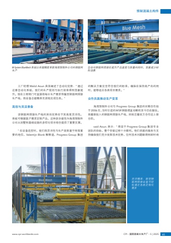 %u9884%u5236%u6df7%u51dd%u571f%u6784%u4ef6www.cpi-worldwide.com CPI %u2013 %u56fd%u9645%u6df7%u51dd%u571f%u751f%u4ea7%u5382 %u2013 5 | 2025 65M-System BlueMesh %u7cfb%u7edf%u4ee5%u5353%u8d8a%u7cbe%u5ea6%u9769%u65b0%u6d77%u6e7e%u9884%u5236%u4ef6%u516c%u53f8%u7684%u94a2%u7b4b%u7f51%u751f%u4ea7%u81ea%u52a8%u5316%u94a2%u7b4b%u7f51%u710a%u63a5%u5728%u63d0%u5347%u4ea7%u54c1%u901f%u5ea6%u4e0e%u8d28%u91cf%u7684%u540c%u65f6%uff0c%u663e%u8457%u51cf%u5c11%u6750%u6599%u6d6a%u8d39%u7075%u6d3b%u7cbe%u51c6%uff1a%u65b0%u578b%u94a2%u7b4b%u7f51%u710a%u63a5%u8bbe%u5907%u53ef%u8f7b%u677e%u6ee1%u8db3%u5404%u7c7b%u5b9a%u5236%u5316%u9700%u6c42%u5de5%u5382%u7ecf%u7406 Walid Aoun %u5177%u4f53%u9610%u8ff0%u4e86%u81ea%u52a8%u5316%u4f18%u52bf%uff1a\%u8fd9%u5957%u81ea%u52a8%u5316%u7cfb%u7edf%uff0c%u6211%u4eec%u7684%u751f%u4ea7%u89c4%u5212%u4e0e%u6267%u884c%u6548%u7387%u5f97%u5230%u663e%u8457%u63d0%u5347%u3002%u73b0%u5728%u5de5%u7a0b%u90e8%u95e8%u53ef%u76f4%u63a5%u5c06%u6bcf%u65e5%u751f%u4ea7%u9700%u6c42%u4f20%u8f93%u81f3%u94a2%u7b4b%u7f51%u710a%u63a5%u751f%u4ea7%u7ebf%uff0c%u800c%u8bbe%u5907%u603b%u80fd%u7cbe%u51c6%u65e0%u8bef%u5730%u5b8c%u6210%u4efb%u52a1%u3002\%u9ad8%u6548%u4e0e%u7075%u6d3b%u517c%u5907 %u8be5%u94a2%u7b4b%u7f51%u710a%u63a5%u751f%u4ea7%u7ebf%u7684%u7a81%u51fa%u4f18%u52bf%u5728%u4e8e%u5176%u9ad8%u5ea6%u7075%u6d3b%u6027%u3002%u7cfb%u7edf%u53ef%u6839%u636e%u5ba2%u6237%u9700%u6c42%u5b9a%u5236%u4ea7%u54c1%uff0c%u8fd9%u79cd%u591a%u529f%u80fd%u6027%u4e3a%u6d77%u6e7e%u9884%u5236%u4ef6%u516c%u53f8%u4ece%u522b%u5885%u5230%u57fa%u7840%u8bbe%u65bd%u7684%u591a%u6837%u5316%u9879%u76ee%u7ec4%u5408%u63d0%u4f9b%u4e86%u91cd%u8981%u652f%u6491%u3002 \ %u5728%u8bbe%u5907%u9009%u578b%u65f6%uff0c%u6211%u4eec%u5c06%u7075%u6d3b%u6027%u4e0e%u751f%u4ea7%u6548%u7387%u7f6e%u4e8e%u540c%u7b49%u91cd%u8981%u7684%u5730%u4f4d%uff0cValentijn Blonk %u89e3%u91ca%u9053%uff0cProgress Group %u96c6%u56e2%u7684%u89e3%u51b3%u65b9%u6848%u5b8c%u5168%u7b26%u5408%u6211%u4eec%u7684%u6807%u51c6%uff0c%u786e%u4fdd%u5728%u4fdd%u6301%u9ad8%u4ea7%u51fa%u7684%u540c%u65f6%uff0c%u80fd%u591f%u9002%u5e94%u5404%u7c7b%u9879%u76ee%u9700%u6c42%u3002\%u5408%u4f5c%u5171%u8d62%u63a8%u52a8%u751f%u4ea7%u53d8%u9769 %u6d77%u6e7e%u9884%u5236%u4ef6%u516c%u53f8%u4e0e Progress Group %u96c6%u56e2%u7684%u957f%u671f%u5408%u4f5c%u59cb%u4e8e2006%u5e74%uff0c%u5f53%u65f6%u5f15%u8fdb%u7684MSR%u94a2%u7b4b%u8c03%u76f4%u5207%u65ad%u673a%u81f3%u4eca%u4ecd%u5728%u670d%u5f79%u3002%u800c%u6700%u65b0%u6295%u5165%u7684%u94a2%u7b4b%u7f51%u710a%u63a5%u751f%u4ea7%u7ebf%uff0c%u5219%u6807%u5fd7%u7740%u53cc%u65b9%u5408%u4f5c%u8fc8%u4e0a%u65b0%u53f0%u9636%u3002 said Aoun. %u8868%u793a%uff1a\%u56e2%u961f%u7684%u534f%u52a9%uff0c%u6574%u4e2a%u5b89%u88c5%u8fc7%u7a0b%u5341%u5206%u987a%u5229%u3002%u4ed6%u4eec%u5353%u8d8a%u7684%u670d%u52a1%u4e0e%u652f%u6301%u786e%u4fdd%u6211%u4eec%u5145%u5206%u53d1%u6325%u6280%u672f%u4f18%u52bf%uff0c%u4efb%u4f55%u6280%u672f%u95ee%u9898%u90fd%u5f97%u5230%u5373%u65f6%u54cd