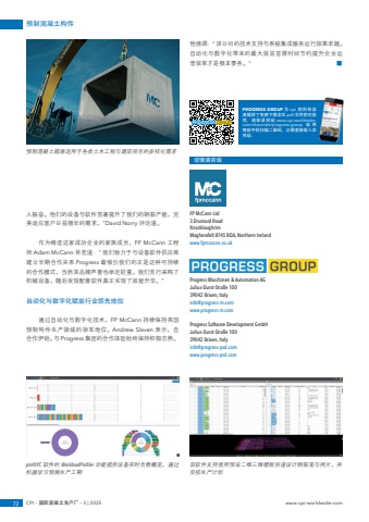 FP McCann Ltd3 Drumard RoadKnockloughrimMagherafelt BT45 8QA, Northern Irelandwww.fpmccann.co.ukProgress Maschinen & Automation AGJulius-Durst-Stra%u00dfe 10039042 Brixen, Italyinfo@progress-m.comwww.progress-m.comProgress Software Development GmbHJulius-Durst-Stra%u00dfe 10039042 Brixen, Italyinfo@progress-psd.comwww.progress-psd.com%u9884%u5236%u6df7%u51dd%u571f%u6784%u4ef672 CPI %u2013 %u56fd%u9645%u6df7%u51dd%u571f%u751f%u4ea7%u5382 %u2013 5 | 2025 www.cpi-worldwide.com%u8be6%u60c5%u8bf7%u54a8%u8be2PROGRESS GROUP %u4e3a cpi %u7684%u6240%u6709%u8bfb%u8005%u63d0%u4f9b%u4e86%u514d%u8d39%u4e0b%u8f7d%u672c%u6587 pdf %u6587%u4ef6%u7684%u53ef%u80fd%u6027%u3002%u8bf7%u767b%u5f55%u7f51%u7ad9 www.cpi-worldwide.com/channels/progress-group %u6216 %u7528%u667a%u80fd%u624b%u673a%u626b%u63cf%u4e8c%u7ef4%u7801%uff0c%u4ee5%u4fbf%u76f4%u63a5%u767b%u5165%u672c%u7f51%u7ad9%u3002%u9884%u5236%u6df7%u51dd%u571f%u7bb1%u6db5%u9002%u7528%u4e8e%u5404%u7c7b%u571f%u6728%u5de5%u7a0b%u4e0e%u5efa%u7b51%u9879%u76ee%u7684%u591a%u6837%u5316%u9700%u6c42profitYC %u8f6f%u4ef6%u7684 WorkloadProfiler %u529f%u80fd%u63d0%u4f9b%u8bbe%u5907%u5b9e%u65f6%u8d1f%u8f7d%u6982%u89c8%uff0c%u901a%u8fc7%u673a%u5668%u5b66%u4e60%u9884%u6d4b%u751f%u4ea7%u5de5%u671f%u8be5%u8f6f%u4ef6%u652f%u6301%u4f7f%u7528%u9884%u8bbe%u4e8c%u7ef4%u4e09%u7ef4%u6a21%u677f%u5feb%u901f%u8bbe%u8ba1%u94a2%u7b4b%u7b3c%u4e0e%u7f51%u7247%uff0c%u5e76%u5b89%u6392%u751f%u4ea7%u8ba1%u5212%u4eba%u632f%u594b%u3002%u4ed6%u4eec%u7684%u8bbe%u5907%u4e0e%u8f6f%u4ef6%u663e%u8457%u63d0%u5347%u4e86%u6211%u4eec%u7684%u94a2%u7b4b%u4ea7%u80fd%uff0c%u5b8c%u7f8e%u9002%u5e94%u5ba2%u6237%u65e5%u76ca%u589e%u957f%u7684%u9700%u6c42%uff0c\%u4f5c%u4e3a%u7f14%u9020%u8fd9%u5bb6%u6210%u529f%u4f01%u4e1a%u7684%u5bb6%u65cf%u6210%u5458%uff0cFP McCann %u5de5%u7a0b%u5e08 Adam McCann %u8865%u5145%u9053%uff1a\%u5efa%u7acb%u957f%u671f%u5408%u4f5c%u5173%u7cfb Progress %u6700%u5438%u5f15%u6211%u4eec%u7684%u6b63%u662f%u8fd9%u79cd%u53ef%u6301%u7eed%u7684%u5408%u4f5c%u6a21%u5f0f%uff0c%u5f53%u7136%u5176%u54c1%u724c%u58f0%u8a89%u4e5f%u4e3e%u8db3%u8f7b%u91cd%u3002%u6211%u4eec%u5148%u884c%u91c7%u8d2d%u4e86%u673a%u68b0%u8bbe%u5907%uff0c%u968f%u540e%u53d1%u73b0%u914d%u5957%u8f6f%u4ef6%u771f%u6b63%u5b9e%u73b0%u4e86%u6548%u80fd%u5347%u534e%u3002\%u81ea%u52a8%u5316%u4e0e%u6570%u5b57%u5316%u8d4b%u80fd%u884c%u4e1a%u9886%u5148%u5730%u4f4d%u901a%u8fc7%u81ea%u52a8%u5316%u4e0e%u6570%u5b57%u5316%u6280%u672f%uff0cFP McCann %u6301%u7eed%u4fdd%u6301%u82f1%u56fd%u9884%u5236%u6784%u4ef6%u751f%u4ea7%u9886%u57df%u7684%u9886%u519b%u5730%u4f4d%u3002Andrew Slaven %u8868%u793a%uff0c%u81ea%u5408%u4f5c%u4f0a%u59cb%uff0c%u4e0e Progress %u96c6%u56e2%u7684%u5408%u4f5c%u4f53%u9a8c%u59cb%u7ec8%u4fdd%u6301%u79ef%u6781%u6001%u52bf%u3002%u4ed6%u5f3a%u8c03%uff1a\%u81ea%u52a8%u5316%u4e0e%u6570%u5b57%u5316%u5e26%u6765%u7684%u6700%u5927%u6548%u76ca%u9996%u63a8%u65f6%u95f4%u8282%u7ea6%u63d0%u5347%u4f01%u4e1a%u8fd0%u8425%u6548%u7387%u624d%u662f%u6839%u672c%u8981%u52a1%u3002\%u25a0