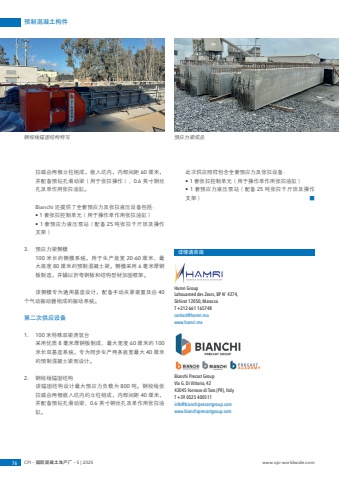 Hamri GroupLahouamed des Zears, BP N' 4374,Skhirat 12050, MaroccoT +212 661 165748contact@hamri.mawww.hamri.maBianchi Precast GroupVia G. Di Vittorio, 4243045 Fornovo di Taro (PR), ItalyT +39 0525 400511info@bianchiprecastgroup.comwww.bianchiprecastgroup.com%u9884%u5236%u6df7%u51dd%u571f%u6784%u4ef676 CPI %u2013 %u56fd%u9645%u6df7%u51dd%u571f%u751f%u4ea7%u5382 %u2013 5 | 2025 www.cpi-worldwide.com%u8be6%u60c5%u8bf7%u54a8%u8be2%u94a2%u7ede%u7ebf%u951a%u56fa%u7ed3%u6784%u7279%u5199 %u9884%u5e94%u529b%u6881%u6210%u54c1%u62c9%u7aef%u7531%u4e24%u6839%u7acb%u67f1%u7ec4%u6210%uff0c%u5d4c%u5165%u5751%u5185%uff0c%u5185%u90e8%u95f4%u8ddd 60 %u5398%u7c73%uff0c%u5e76%u914d%u5907%u9884%u94bb%u5b54%u6ed1%u52a8%u6881%uff08%u7528%u4e8e%u5f20%u62c9%u64cd%u4f5c%uff09%u30010.6 %u82f1%u5bf8%u94a2%u4e1d%u5b54%u53ca%u5355%u4f5c%u7528%u5f20%u62c9%u6cb9%u7f38%u3002 Bianchi %u8fd8%u63d0%u4f9b%u4e86%u5168%u5957%u9884%u5e94%u529b%u53ca%u5f20%u62c9%u6db2%u538b%u8bbe%u5907%u5305%u62ec%uff1a %u2022 1 %u5957%u5f20%u62c9%u63a7%u5236%u5355%u5143%uff08%u7528%u4e8e%u64cd%u4f5c%u5355%u4f5c%u7528%u5f20%u62c9%u6cb9%u7f38%uff09 %u2022 1 %u5957%u9884%u5e94%u529b%u6db2%u538b%u6cf5%u7ad9%uff08%u914d%u5907 25 %u5428%u5f20%u62c9%u5343%u65a4%u9876%u53ca%u64cd%u4f5c%u652f%u67b6%uff09 3. %u9884%u5e94%u529b%u6881%u4fa7%u6a21 100 %u7c73%u957f%u7684%u4fa7%u6a21%u7cfb%u7edf%uff0c%u7528%u4e8e%u751f%u4ea7%u5e95%u5bbd 20-60 %u5398%u7c73%u3001%u6700%u5927%u9ad8%u5ea6 80 %u5398%u7c73%u7684%u9884%u5236%u6df7%u51dd%u571f%u6881%u3002%u4fa7%u6a21%u91c7%u7528 6 %u6beb%u7c73%u539a%u94a2%u677f%u5236%u9020%uff0c%u5e76%u8f85%u4ee5%u6298%u5f2f%u94a2%u677f%u548c%u7ed3%u6784%u578b%u6750%u52a0%u56fa%u6846%u67b6%u3002 %u8be5%u4fa7%u6a21%u4e13%u4e3a%u901a%u7528%u57fa%u5ea7%u8bbe%u8ba1%uff0c%u914d%u5907%u624b%u52a8%u5939%u7d27%u88c5%u7f6e%u53ca%u7531 40%u4e2a%u6c14%u52a8%u632f%u52a8%u5668%u7ec4%u6210%u7684%u632f%u52a8%u7cfb%u7edf%u3002 %u7b2c%u4e8c%u6b21%u4f9b%u5e94%u8bbe%u59071. 100 %u7c73%u7279%u6b8a%u53cc%u6881%u6d47%u7b51%u53f0 %u91c7%u7528%u4f18%u8d28 8 %u6beb%u7c73%u539a%u94a2%u677f%u5236%u6210%u3001%u6700%u5927%u5bbd%u5ea6 60 %u5398%u7c73%u7684 100%u7c73%u957f%u53cc%u57fa%u5ea7%u7cfb%u7edf%uff0c%u4e13%u4e3a%u540c%u6b65%u751f%u4ea7%u4e24%u6761%u5e95%u5bbd%u6700%u5927 40 %u5398%u7c73%u7684%u9884%u5236%u6df7%u51dd%u571f%u6881%u800c%u8bbe%u8ba1%u3002 2. %u94a2%u7ede%u7ebf%u951a%u56fa%u7ed3%u6784 %u8be5%u951a%u56fa%u7ed3%u6784%u8bbe%u8ba1%u6700%u5927%u9884%u5e94%u529b%u8d1f%u8f7d%u4e3a 800 %u5428%u3002%u94a2%u7ede%u7ebf%u5f20%u62c9%u7aef%u7531%u4e24%u6839%u5d4c%u5165%u5751%u5185%u7684%u7acb%u67f1%u7ec4%u6210%uff0c%u5185%u90e8%u95f4%u8ddd 40 %u5398%u7c73%uff0c%u5e76%u914d%u5907%u9884%u94bb%u5b54%u6ed1%u52a8%u6881%u30010.6 %u82f1%u5bf8%u94a2%u4e1d%u5b54%u53ca%u5355%u4f5c%u7528%u5f20%u62c9%u6cb9%u7f38%u3002 %u6b64%u6b21%u4f9b%u5e94%u540c%u6837%u5305%u542b%u5168%u5957%u9884%u5e94%u529b%u53ca%u5f20%u62c9%u8bbe%u5907%uff1a %u2022 1 %u5957%u5f20%u62c9%u63a7%u5236%u5355%u5143%uff08%u7528%u4e8e%u64cd%u4f5c%u5355%u4f5c%u7528%u5f20%u62c9%u6cb9%u7f38%uff09 %u2022 1 %u5957%u9884%u5e94%u529b%u6db2%u538b%u6cf5%u7ad9%uff08%u914d%u5907 25 %u5428%u5f20%u62c9%u5343%u65a4%u9876%u53ca%u64cd%u4f5c%u652f%u67b6%uff09 %u25a0