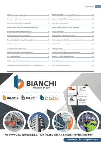 AEM, www.conexpoconagg.com 67Afinitas, www.afinitas.com 17AGRU Kunststofftechnik GmbH, www.agru.at 33BIANCHI CASSEFORME S.R.L., www.bianchicasseforme.it 77B.T. innovation GmbH, www.bt-innovation.de 69Construx Weckenmann, www.construx.eu 57Curetec (Shanghai) New Energy Technology Co., Ltd., 27EBAWE, www.ebawe.de 73HESS GROUP, www.hessgroup.com 25Masa GmbH Andernach, www.masa-group.com 51NPCA, www.precast.org 59PAUL Maschinenfabrik GmbH & Co. KG, www.paul.eu 71Pavers and Blocks Manufacturers Association (PBMA), www.pbma.in 55PRINZING PFEIFFER, www.prinzing-pfeiffer.com 37Progress Holding AG/SPA, www.progress-group.info C4RATEC GmbH, www.ratec.org 63RIB SAA Software Engineering GmbH, www.saa.at 61ROTHO, www.rotho.de 49Sicoma Zhuhai Co Ltd, www.sicoma.com.cn C2Sommer Anlagentechnik GmbH, www.sommer-precast.de 19SR SCHINDLER, www.sr-schindler.com 45TEKA, www.teka.de 31TopWerk China Hess Langfang, www.hess-china.com C3Wiggert & Co. GmbH, www.wiggert.com C1World of Concrete, www.worldofconcrete.com 75XYPEX Chemical, www.xypex.com 39%u5e7f%u544a%u5ba2%u6237%u540d%u5355
