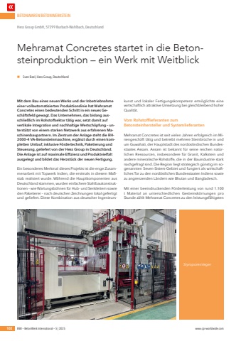 BETONWAREN/BETONWERKSTEIN102 BWI %u2013 BetonWerk International %u2013 5 | 2025 www.cpi-worldwide.comMit dem Bau eines neuen Werks und der Inbetriebnahme einer vollautomatisierten Produktionslinie hat Mehramat Concretes einen bedeutenden Schritt in ein neues Gesch%u00e4ftsfeld gewagt. Das Unternehmen, das bislang ausschlie%u00dflich im Rohstoffsektor t%u00e4tig war, setzt damit auf vertikale Integration und nachhaltige Wertsch%u00f6pfung %u2013 unterst%u00fctzt von einem starken Netzwerk aus erfahrenen Maschinenbaupartnern. Im Zentrum der Anlage steht die RH2000-4 VA-Betonsteinmaschine, erg%u00e4nzt durch einen kompletten Umlauf, inklusive F%u00f6rdertechnik, Paketierung und Steuerung, geliefert von der Hess Group in Deutschland. Die Anlage ist auf maximale Effizienz und Produktvielfalt ausgelegt und bildet das Herzst%u00fcck der neuen Fertigung.Ein besonderes Merkmal dieses Projekts ist die enge Zusammenarbeit mit Topwerk Indien, die erstmals in diesem Ma%u00dfstab realisiert wurde. W%u00e4hrend die Hauptkomponenten aus Deutschland stammen, wurden einfachere Stahlbaukonstruktionen %u2013 wie Wartungsb%u00fchnen f%u00fcr Hub- und Senkleitern sowie den Paketierer %u2013 nach deutschen Zeichnungen lokal gefertigt und geliefert. Diese Kombination aus deutscher Ingenieurskunst und lokaler Fertigungskompetenz erm%u00f6glichte eine wirtschaftlich attraktive Umsetzung bei gleichbleibend hoher Qualit%u00e4t.Vom Rohstofflieferanten zum Betonsteinhersteller und SystemlieferantenMehramat Concretes ist seit vielen Jahren erfolgreich im Minengesch%u00e4ft t%u00e4tig und betreibt mehrere Steinbr%u00fcche in und um Guwahati, der Hauptstadt des nordostindischen Bundesstaates Assam. Assam ist bekannt f%u00fcr seine reichen nat%u00fcrlichen Ressourcen, insbesondere f%u00fcr Granit, Kalkstein und andere mineralische Rohstoffe, die in der Bauindustrie stark nachgefragt sind. Die Region liegt strategisch g%u00fcnstig im sogenannten Seven-Sisters-Gebiet und fungiert als wirtschaftliches Tor zu den nord%u00f6stlichen Bundesstaaten Indiens sowie zu angrenzenden L%u00e4ndern wie Bhutan und Bangladesch.Mit einer beeindruckenden F%u00f6rderleistung von rund 1.100 t Material an unterschiedlichen Gesteinsk%u00f6rnungen pro Stunde z%u00e4hlt Mehramat Concretes zu den leistungsf%u00e4higsten Mehramat Concretes startet in die Betonsteinproduktion %u2013 ein Werk mit WeitblickHess Group GmbH, 57299 Burbach-Wahlbach, Deutschlandn Sven Beel, Hess Group, DeutschlandStyroporeinleger