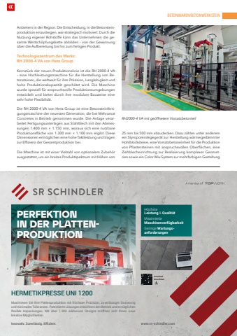 BETONWAREN/BETONWERKSTEINwww.cpi-worldwide.com BWI %u2013 BetonWerk International %u2013 5 | 2025 103Anbietern in der Region. Die Entscheidung, in die Betonsteinproduktion einzusteigen, war strategisch motiviert: Durch die Nutzung eigener Rohstoffe kann das Unternehmen die gesamte Wertsch%u00f6pfungskette abbilden %u2013 von der Gewinnung %u00fcber die Aufbereitung bis hin zum fertigen Produkt.Technologiezentrum des Werks: RH 2000-4 VA von Hess GroupKernst%u00fcck der neuen Produktionslinie ist die RH 2000-4 VA %u2013 eine Hochleistungsmaschine f%u00fcr die Herstellung von Betonsteinen, die weltweit f%u00fcr ihre Pr%u00e4zision, Langlebigkeit und hohe Produktionskapazit%u00e4t gesch%u00e4tzt wird. Die Maschine wurde speziell f%u00fcr anspruchsvolle Produktionsumgebungen entwickelt und bietet durch ihre modulare Bauweise eine sehr hohe Flexibilit%u00e4t.Die RH 2000-4 VA von Hess Group ist eine Betonsteinfertigungsmaschine der neuesten Generation, die bei Mehramat Concretes in Betrieb genommen wurde. Die Anlage verarbeitet Fertigungsunterlagen aus Stahlblech mit den Abmessungen 1.400 mm %u00d7 1.150 mm, woraus sich eine nutzbare Produktionsfl%u00e4che von 1.300 mm %u00d7 1.100 mm ergibt. Diese Dimensionen erm%u00f6glichen eine hohe Taktleistung und tragen zur Effizienz der Gesamtproduktion bei.Die Maschine ist mit einer Vielzahl von optionalem Zubeh%u00f6r ausgestattet, um ein breites Produktspektrum mit H%u00f6hen von 25 mm bis 500 mm abzudecken. Dazu z%u00e4hlen unter anderem ein Styroporeinlegeger%u00e4t zur Herstellung w%u00e4rmeged%u00e4mmter Hohlblocksteine, eine Vorsatzbetoneinheit f%u00fcr die Produktion von Pflastersteinen mit anspruchsvollen Oberfl%u00e4chen, eine Ziehblecheinrichtung zur Realisierung komplexer Geometrien sowie ein Color-Mix-System zur mehrfarbigen Gestaltung RH2000-4 VA mit ge%u00f6ffnetem Vorsatzbetonteilwww.sr-schindler.comMaximieren Sie Ihre Plattenproduktion mit h%u00f6chster Pr%u00e4zision, zuverl%u00e4ssiger Dosierung und minimalen Toleranzen. Patentierte L%u00f6sungen erleichtern den Betrieb und erm%u00f6glichenflexible Anpassungen. Mit %u00fcber 1.500 exklusiven Designs er%u00f6ffnen sich Ihnen neuekreative M%u00f6glichkeiten.Innovativ. Zuverl%u00e4ssig. Effi zient.H%u00f6chsteLeistung & Qualit%u00e4tMaximierteMaschinenverf%u00fcgbarkeitGeringe WartungsanforderungenPERFEKTIONIN DER PLATTENPRODUKTIONHERMETIKPRESSE UNI 1200DownloadBrosch%u00fcren