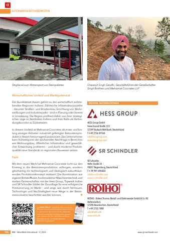 BETONWAREN/BETONWERKSTEIN106 BWI %u2013 BetonWerk International %u2013 5 | 2025 www.cpi-worldwide.comWirtschaftliches Umfeld und MarktpotenzialDer Bundesstaat Assam geh%u00f6rt zu den wirtschaftlich aufstrebenden Regionen Indiens. Zahlreiche Infrastrukturprojekte %u2013 darunter Stra%u00dfen- und Br%u00fcckenbau, Errichtung von Wohnsiedlungen und Industrieparks %u2013 sind in Planung oder bereits in Umsetzung. Die Region profitiert dabei von ihrer strategischen Lage im Nordosten Indiens und ihrer Rolle als Verbindungskorridor zu S%u00fcdostasien.In diesem Umfeld ist Mehramat Concretes als erster und bislang einziger Anbieter industriell gefertigter Betonsteinprodukte in Assam hervorragend positioniert. Das Unternehmen kann fr%u00fchzeitig von der wachsenden Nachfrage in Bereichen wie Wohnungsbau, %u00f6ffentlicher Infrastruktur und gewerblicher Entwicklung profitieren %u2013 und durch moderne Produktqualit%u00e4t neue Standards im regionalen Bauwesen setzen.FazitMit dem neuen Werk hat Mehramat Concretes nicht nur den Einstieg in die Betonsteinproduktion vollzogen, sondern gleichzeitig ein technologisch und %u00f6kologisch zukunftsweisendes Produktionskonzept realisiert. Die Kombination aus eigener Rohstoffbasis, hochmoderner Maschinentechnik und starken Partnerschaften mit der Hess Group, Topwerk Indien und SR Schindler bildet die Grundlage f%u00fcr eine erfolgreiche Positionierung im Markt %u2013 und zeigt, wie durch Vertrauen, Technologie und Nachhaltigkeit neue Wege in der Betonsteinindustrie beschritten werden k%u00f6nnen. nWEITERE INFORMATIONENHESS Group GmbH Freier-Grund-Stra%u00dfe 123 57299 Burbach-Wahlbach, Deutschland T +49 2736 49760 info@hessgroup.com www.hessgroup.comSR Schindler Hofer Stra%u00dfe 24 93057 Regensburg, Deutschland T + 49 941 696820 info@sr-schindler.com www.sr-schindler.comROTHO %u2013 Robert Thomas Metall- und Elektrowerke GmbH & Co. KG Hellerstra%u00dfe 657290 Neunkirchen, Deutschland T +49 2735 7880 sales@rotho.dewww.rotho.deDie HESS GROUP erm%u00f6glicht allen Lesern der BWI den kostenlosen Download dieses Artikels im pdf-Format. Besuchen Sie die Webseite www.cpi-worldwide.com/channels/topwerk oder scannen Sie den QR-Code mit Ihrem Smartphone ein, um direkt auf diese Webseite zu gelangen.Stegband zum Abtransport von Steinpaketen Charanjit Singh Gandhi, Gesch%u00e4ftsf%u00fchrender Gesellschafter Singh Brothers und Mehramat Concretes LLP