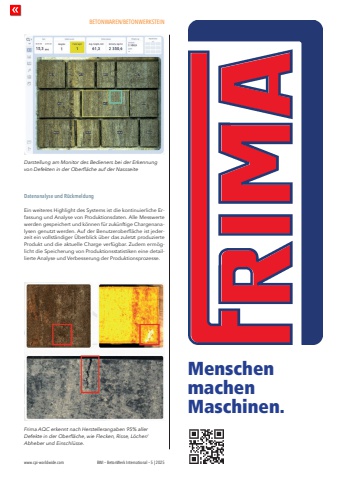 BETONWAREN/BETONWERKSTEINwww.cpi-worldwide.com BWI %u2013 BetonWerk International %u2013 5 | 2025Datenanalyse und R%u00fcckmeldungEin weiteres Highlight des Systems ist die kontinuierliche Erfassung und Analyse von Produktionsdaten. Alle Messwerte werden gespeichert und k%u00f6nnen f%u00fcr zuk%u00fcnftige Chargenanalysen genutzt werden. Auf der Benutzeroberfl%u00e4che ist jederzeit ein vollst%u00e4ndiger %u00dcberblick %u00fcber das zuletzt produzierte Produkt und die aktuelle Charge verf%u00fcgbar. Zudem erm%u00f6glicht die Speicherung von Produktionsstatistiken eine detaillierte Analyse und Verbesserung der Produktionsprozesse.Darstellung am Monitor des Bedieners bei der Erkennung von Defekten in der Oberfl%u00e4che auf der NassseiteFrima AQC erkennt nach Herstellerangaben 95% aller Defekte in der Oberfl%u00e4che, wie Flecken, Risse, L%u00f6cher/ Abheber und Einschl%u00fcsse.MenschenmachenMaschinen.