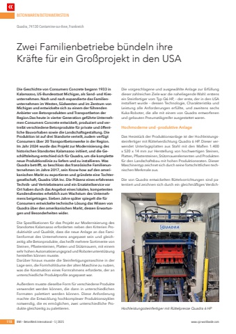 BETONWAREN/BETONWERKSTEIN118 BWI %u2013 BetonWerk International %u2013 5 | 2025 www.cpi-worldwide.comDie Geschichte von Consumers Concrete begann 1933 in Kalamazoo, US-Bundesstaat Michigan, als Sand- und Kiesunternehmen. Nach und nach expandierte das Familienunternehmen im Westen, S%u00fcdwesten und im Zentrum von Michigan und entwickelte sich zu einem der f%u00fchrenden Anbieter von Betonprodukten und Transportbeton der Region.Das heute in vierter Generation gef%u00fchrte Unternehmen Consumers Concrete entwickelt, produziert und vertreibt verschiedene Betonprodukte f%u00fcr private und %u00f6ffentliche Bauvorhaben sowie die Landschaftsgestaltung. Die Produktion ist auf drei Standorte verteilt, zudem verf%u00fcgt Consumers %u00fcber 20 Transportbetonwerke in der Region. Im Jahr 2024 wurde das Projekt zur Modernisierung des historischen Standortes Kalamazoo initiiert, und die Gesch%u00e4ftsleitung entschied sich f%u00fcr Quadra, um die komplette neue Produktionslinie zu liefern und zu installieren. Was Quadra betrifft, so beschloss das franz%u00f6sische Familienunternehmen im Jahre 2017, sein Know-how auf den amerikanischen Markt zu exportieren und gr%u00fcndete eine Tochtergesellschaft, Quadra USA Inc. Die Pr%u00e4senz eines erfahrenen Technik- und Vertriebsteams und ein Ersatzteilservice vor Ort haben durch das Angebot eines lokalen, kompetenten Kundendienstes erheblich zum Wachstum des Unternehmens beigetragen. Sieben Jahre sp%u00e4ter spiegelt die f%u00fcr Consumers entwickelte technische L%u00f6sung das Wissen von Quadra %u00fcber den amerikanischen Markt, dessen Erwartungen und Besonderheiten wider.Die Spezifikationen f%u00fcr das Projekt zur Modernisierung des Standortes Kalamazoo erforderten neben den Kriterien Produktivit%u00e4t und Qualit%u00e4t, dass die neue Anlage an das Familienformat des Unternehmens angepasst sein und gleichzeitig alle Betonprodukte, das hei%u00dft mehrere Sortimente von Steinen, Pflastersteinen, Platten und St%u00fctzmauern, mit einem sehr hohen Automatisierungsgrad und Roboterunterst%u00fctzung herstellen k%u00f6nnen musste.Dar%u00fcber hinaus musste die Steinfertigungsmaschine in der Lage sein, die Formhohlr%u00e4ume der alten Maschine zu nutzen, was die Konstruktion eines Formrahmens erforderte, der an unterschiedliche Produktprofile angepasst war.Au%u00dferdem musste dieselbe Form f%u00fcr verschiedene Produkte verwendet werden k%u00f6nnen, die dann in unterschiedlichen Formaten palettiert werden k%u00f6nnen. Diese Anforderung machte die Entwicklung hochkomplexer Produktionszyklen notwendig, die es erm%u00f6glichen, zwei unterschiedliche Produkte gleichzeitig zu palettieren.Die vorgeschlagene und ausgew%u00e4hlte Anlage zur Erf%u00fcllung dieser zahlreichen Ziele war die naheliegende Wahl: erstens ein Steinfertiger vom Typ Q6 HP, %u2013 der erste, der in den USA installiert wurde %u2013 dessen Technologie, Charakteristika und Leistung alle Anforderungen erf%u00fcllte, und zweitens sechs Kuka-Roboter, die alle mit einem von Quadra entworfenen und gebauten Pneumatikgreifer ausgestattet waren.Hochmoderne und -produktive AnlageDas Herzst%u00fcck der Produktionsanlage ist der Hochleistungssteinfertiger mit R%u00fcttelverdichtung Quadra 6 HP. Dieser verwendet Unterlagsplatten aus Stahl mit den Ma%u00dfen 1.400 x 520 x 14 mm zur Herstellung von hochwertigen Steinen, Platten, Pflastersteinen, St%u00fctzmauerelementen und Produkten f%u00fcr den Landschaftsbau mit hohen Produktionsraten. Dieser Maschinentyp zeichnet sich durch seine fortschrittlichen technischen Merkmale aus.Die von Quadra entwickelten R%u00fcttelvorrichtungen sind patentiert und zeichnen sich durch ein gleichm%u00e4%u00dfiges VerdichZwei Familienbetriebe b%u00fcndeln ihre Kr%u00e4fte f%u00fcr ein Gro%u00dfprojekt in den USAQuadra, 74130 Contamine-sur-Arve, FrankreichHochleistungssteinfertiger mit R%u00fcttelpresse Quadra 6 HP