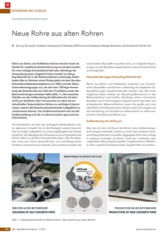 BETONROHRE UND -SCH%u00c4CHTE124 BWI %u2013 BetonWerk International %u2013 5 | 2025 www.cpi-worldwide.comRohre aus Beton und Stahlbeton k%u00f6nnen bereits heute als Quelle f%u00fcr rezyklierte Gesteinsk%u00f6rnung verwendet werden. F%u00fcr eine richtige Kreislaufwirtschaft w%u00e4re allerdings die Verwendung eines m%u00f6glichst hohen Anteils von Recycling-Betonbruch in der Rohrproduktion notwendig. Daher lotete Sika im Rahmen eines Pilotprojekts mit dem Bundesfachverband Betonkanalsysteme e.V. (FBS) und der R%u00f6serUnternehmensgruppe aus, ob sich eine 100%ige Verwertung des Betonbruchs aus Sicht der Produktion sowie der Betontechnologie umsetzen lie%u00dfe (Abb. 1). Die einzelnen Schritte von der Aufbereitung des Betonbruchs mit dem reCO2ver-Verfahren %u00fcber Vorversuche im Labor bis zur industriellen Testproduktion f%u00fchrten zu wichtigen Erkenntnissen, welche die Betonkreislaufwirtschaft ma%u00dfgeblich revolutionieren k%u00f6nnen. Der Artikel konzentriert sich auf die Problemstellung und die in Laborversuchen gewonnenen Erkenntnisse.Die Kanalisation ist einer der wichtigsten Bestandteile unserer gebauten Umwelt. Sie ist das R%u00fcckgrat unserer Gesundheit und tr%u00e4gt ma%u00dfgeblich zur Leistungsf%u00e4higkeit der Gesellschaft bei. Die Megatrends Urbanisierung und Umweltschutz f%u00fchren dabei zu gro%u00dfen Herausforderungen. Das Kanalsystem muss zum einen dauerhaft sein, um zuverl%u00e4ssig seiner Funktion nachkommen zu k%u00f6nnen. Zum anderen m%u00fcssen die verwendeten Baustoffe recycelbar sein, um m%u00f6gliche Anpassungen an das Bev%u00f6lkerungswachstum ressourcenschonend zu erm%u00f6glichen. Herausforderungen Recycling-BetonbruchRohre aus Beton und Stahlbeton bestehen aus mineralischen Baustoffen und k%u00f6nnen vollst%u00e4ndig als rezyklierte Gesteinsk%u00f6rnungen wiederverwendet werden. Das Ziel eines m%u00f6glichst hohen Anteils von Recycling-Betonbruch in der Rohrproduktion wird bisher allerdings neben normativen Vorgaben auch technologisch begrenzt durch die hohe und schwankende Wasseraufnahme sowie die gro%u00dfe und raue Oberfl%u00e4che des Betonbruches. Beides wirkt sich negativ auf die Herstellung und Qualit%u00e4t von Betonrohren im sofort entschalten Produktionsverfahren aus. Aufbereitung mit reCO2verSika hat mit dem reCO2ver-Verfahren eine Aufbereitungstechnologie entwickelt, welche zu einer fast prim%u00e4ren Sandund Kiesqualit%u00e4t des recycelten Aggregats f%u00fchrt. Dies erfolgt in mehreren Schritten. In Schritt 1 wird der in %u00fcblicher, aber ungesiebter Recycling-Korngr%u00f6%u00dfe vorgebrochene Altbeton in einer speziell konzeptionierten Kugelm%u00fchle im kontinuNeue Rohre aus alten RohrenKreislaufwirtschaft bei Betonrohrenn Dipl.-Ing. (FH) Jorg M. Schrabback, Fachingenieur f%u00fcr Pflasterbau (EIPOS), Business Development Manager Betonwaren, Sika Deutschland CH AG & Co KGAbb. 1: Kreislaufwirtschaft bei Betonrohren: Neue Rohre aus alten Rohren%u00a9 R%u00f6ser GmbH/ FBS (Bilder links und rechts), Sika AG (Bild Mitte)