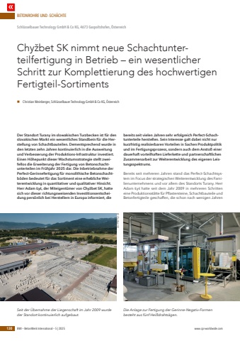 BETONROHRE UND -SCH%u00c4CHTE130 BWI %u2013 BetonWerk International %u2013 5 | 2025 www.cpi-worldwide.comDer Standort Turany im slowakischen Turzbecken ist f%u00fcr den slovakischen Markt ein wesentliches Standbein f%u00fcr die Herstellung von Schachtbauteilen. Dementsprechend wurde in den letzten zehn Jahren kontinuierlich in die Ausweitung und Verbesserung der Produktions-Infrastruktur investiert. Einen H%u00f6hepunkt dieser Wachstumsstrategie stellt zweifellos die Erweiterung der Fertigung von Betonschachtunterteilen im Fr%u00fchjahr 2025 dar. Die Inbetriebnahme der Perfect-Gerinnefertigung f%u00fcr monolithische Betonschachtb%u00f6den bedeutet f%u00fcr das Sortiment eine erhebliche Weiterentwicklung in quantitativer und qualitativer Hinsicht. Herr Adam %u0141y%u015b, der Miteigent%u00fcmer von Chy%u017ebet SK, hatte sich vor dieser richtungsweisenden Investitionsentscheidung pers%u00f6nlich bei Herstellern in Europa informiert, die bereits seit vielen Jahren sehr erfolgreich Perfect-Schachtunterteile herstellen. Sein Interesse galt dabei nicht nur kurzfristig realisierbaren Vorteilen in Sachen Produktpolitik und im Fertigungsprozess, sondern auch dem Ansto%u00df einer dauerhaft vorteilhaften Lieferkette und partnerschaftlichen Zusammenarbeit zur Weiterentwicklung des eigenen Leistungsspektrums.Bereits seit mehreren Jahren stand das Perfect-Schachtsystem im Focus der strategischen Weiterentwicklung des Familienunternehmens und vor allem des Standorts Turany. Herr Adam %u0141y%u015b hatte seit dem Jahr 2009 in mehreren Schritten eine Produktionsst%u00e4tte f%u00fcr Pflastersteine, Schachtbauteile und Betonfertigteile geschaffen, die schon nach wenigen Jahren Chy%u017ebet SK nimmt neue Schachtunterteilfertigung in Betrieb %u2013 ein wesentlicher Schritt zur Komplettierung des hochwertigen Fertigteil-Sortiments Schl%u00fcsselbauer Technology GmbH & Co KG, 4673 Gaspoltshofen, %u00d6sterreichn Christian Weinberger, Schl%u00fcsselbauer Technology GmbH & Co KG, %u00d6sterreichSeit der %u00dcbernahme der Liegenschaft im Jahr 2009 wurde der Standort kontinuierlich aufgebaut.Die Anlage zur Fertigung der Gerinne-Negativ-Formen besteht aus f%u00fcnf Hei%u00dfdrahts%u00e4gen.%u00a9 Chy%u017ebet SK