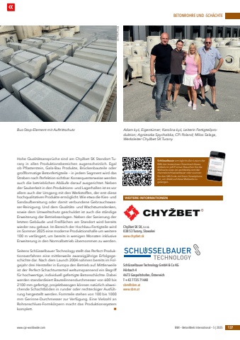 BETONROHRE UND -SCH%u00c4CHTEwww.cpi-worldwide.com BWI %u2013 BetonWerk International %u2013 5 | 2025 137Hohe Qualit%u00e4tsanspr%u00fcche sind am Chy%u017ebet SK Standort Turany in allen Produktionsbereichen augenscheinlich. Egal ob Pflasterstein, Gala-Bau Produkte, Br%u00fcckenbauteile oder gro%u00dfformatige Betonfertigteile %u2013 in jedem Segment wird das Streben nach Perfektion sichtbar. Konsequenterweise werden auch die betrieblichen Abl%u00e4ufe darauf ausgerichtet. Neben der Sauberkeit in den Produktions- und Lagerhallen ist es vor allem auch der Umgang mit den Werkstoffen, der erst diese hochqualitativen Produkte erm%u00f6glicht. Wie etwa die Kies- und Sandaufbereitung oder damit verbundene Gebrauchswasser-Reinigung. Und dem Qualit%u00e4ts- und Wachstumsdenken, sowie dem Umweltschutz geschuldet ist auch die st%u00e4ndige Erweiterung der Betriebsanlagen. Neben der Sanierung der letzten Geb%u00e4ude und Freifl%u00e4chen am Standort wird bereits wieder neu gebaut. Im Bereich der Hochbau-Fertigteile wird im Sommer 2025 eine moderne Produktionshalle um weitere 100 m verl%u00e4ngert, um bereits in wenigen Monaten inklusive Erweiterung in den Normalbetrieb %u00fcbernommen zu werden.Seitens Schl%u00fcsselbauer Technology stellt das Perfect-Produktionsverfahren eine mittlerweile zwanzigj%u00e4hrige Erfolgsgeschichte dar. Nach dem Launch 2004 nahmen bereits im Folgejahr drei Hersteller in Europa den Betrieb auf. Mittlerweile ist der Perfect-Schachtunterteil weltumspannend ein Begriff f%u00fcr hochwertige, individuell gefertigte Betonsch%u00e4chte. Dabei werden standardisiert Bauteilinnendurchmesser von 600 bis 2100 mm gefertigt, projektbezogen k%u00f6nnen nat%u00fcrlich abweichende Schachtb%u00f6den in runder oder rechteckiger Ausf%u00fchrung hergestellt werden. Formteile stehen von 100 bis 1000 mm Gerinne-Durchmesser zur Verf%u00fcgung. Eine Vielzahl an Rohranschluss-Formk%u00f6rpern macht das Produktionssystem komplett. nWEITERE INFORMATIONENChy%u017ebet SK SK, s.r.o.038 53 Turany, Slowakeiwww.chyzbet.skSchl%u00fcsselbauer Technology GmbH & Co KG H%u00f6rbach 44673 Gaspoltshofen, %u00d6sterreich T +43 7735 71440 sbm@sbm.atwww.sbm.atSchl%u00fcsselbauer erm%u00f6glicht allen Lesern der BWI den kostenlosen Download dieses Artikels im pdf-Format. Besuchen Sie die Webseite www.cpi-worldwide.com/de/ channels/schluesselbauer oder scannen Sie den QR-Code mit Ihrem Smartphone ein, um direkt auf diese Webseite zu gelangen.Bus-Stop-Element mit Auftrittschutz Adam %u0141y%u015b, Eigent%u00fcmer; Karolina %u0141y%u015b, Leiterin Fertigteilproduktion; Agnieszka Spychalska, CPi Poland; Milos Salaga, Werksleiter Chy%u017ebet SK Turany%u00a9 Chy%u017ebet SK