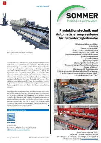 BETONFERTIGTEILEwww.cpi-worldwide.com BWI %u2013 BetonWerk International %u2013 5 | 2025Die Modelle der Syntheton-Baureihe decken den Durchmesserbereich von 6-25 mm ab und k%u00f6nnen mit drei bis zu sechs Rotoren konfiguriert werden. Jeder Rotor ist einem Durchmesser gewidmet und wird einmalig werkseitig eingestellt. Um den Produktionsfluss weiter zu optimieren, verf%u00fcgt die Syntheton %u00fcber ein patentiertes System, um beim Wechsel des zu bearbeitenden Coils schnell weiterarbeiten zu k%u00f6nnen, ohne auf das zeitraubende Stumpfschwei%u00dfen zur%u00fcckgreifen zu m%u00fcssen. Daf%u00fcr wird das letzte Coilst%u00fcck nach vorne in Produktionsrichtung herausgef%u00fchrt und der neue Draht mit den angetriebenen Vorricht- und Drahtf%u00fchrungseinheiten in den Rotor eingef%u00fchrt, ohne die Rollen des Rotors umstellen zu m%u00fcssen.Auch beim Biegeradiuswechsel wird Zeit gespart, denn dieser erfolgt ohne Verz%u00f6gerung. Alle Biegeradien befinden sich auf einem einziehbaren Biegewerkzeug direkt auf den Biegemodulen. Die Biegemodule m%u00fcssen nicht zu einer Auswechselstation fahren, wie dies, mit gro%u00dfen Zeitverlusten, bei den verbreiteten Anlagen der Fall ist. Durch das ausgekl%u00fcgelte und kompakte Design sind alle Komponenten der Syntheton leicht zug%u00e4nglich und wartungsarm. nWEITERE INFORMATIONENEurobend GmbHAlexanderstr. 1, 90547 N%u00fcrnberg-Stein, Deutschlandinfo@eurobend.com, www.eurobend.comMELC-Monoline-Maschine bis 25mmSOMMER Anlagentechnik GmbHBenzstra%u00dfe 1 | D-84051 Altheim/GermanyTel: +49 (0) 87 03 / 98 91-0 | Fax: +49 (0) 87 03 / 98 91-25info@sommer-precast.de | www.sommer-precast.de| Station%u00e4re Bahnenproduktion| Kipptische| Palettenumlaufanlagen| Transport- und Handlingssysteme| Multi-Funktions-Schalungsroboter| Betonverteilsysteme f%u00fcr alle Einsatzzwecke| Verdichtungssysteme| Gl%u00e4ttmaschinen| Schalungssysteme| Schalungen f%u00fcr Sonderbauteile| Garagenschalungen/Raumzellenschalungen/ Sonderschalungen| Schalungen f%u00fcr Skelettbauweise| St%u00fctzenschalungen/Binderschalungen/TT-Schalungen| Isolierungs-Prozess-Anwendungs-Roboter (IPAR)| Shuttle-Processing-Plant (SPP)Produktionstechnik undAutomatisierungssysteme f%u00fcr Betonfertigteilwerke