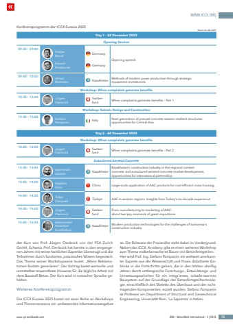 WWW.ICCX.ORGwww.cpi-worldwide.com BWI %u2013 BetonWerk International %u2013 5 | 2025 15Day 1 %u2013 03 December 2025 Opening Session09:30 - 09:40 Holger KarutzEduard KinsbrunerGermanyGermanyOpening speech09:40 - 10:00 Almaz Khamitov Kazakhstan Methods of modern paver production through strategic equipment investmentsWorkshop: When complaints generate benefits10:30 - 12:30 J%u00fcrgen OecknickSwitzerland When complaints generate benefits %u2013 Part 1Workshop: Seismic Design and Construction13:30 - 15:00 Stefano Pampanin Italy Next generation of precast concrete seismic-resilient structures: opportunities for Central AsiaDay 2 %u2013 04 December 2025 Workshop: When complaints generate benefits10:00 - 12:00 J%u00fcrgen OecknickSwitzerland When complaints generate benefits %u2013 Part 2Autoclaved Aerated Concrete13:30 - 13:45 Vyacheslav Lazarev KazakhstanKazakhstan%u2018s construction industry in the regional context: concrete and autoclaved aerated concrete market development, opportunities for international partnership13:45 - 14:00 Stephen Shen China Large-scale application of AAC products for cost-efficient mass housing14:00 - 14:30 Tolga %u00d6tzoprak T%u00fcrkiye AAC in seismic regions: Insights from Turkey%u2019s six-decade experience14:30 - 15:00 J%u00fcrgen OecknickSwitzerlandFrom manufacturing to marketing of AAC %u2013 about two key moments of great importance15:00 - 15:30 Makhambet Kaisarbek KuralbekulyKazakhstan Modern production technologies for the challenges of tomorrow%u2018s construction industryKonferenzprogramm der ICCX Eurasia 2025 Stand: 26. 08. 2025der Kurs von Prof. J%u00fcrgen Oecknick von der PSA Zurich GmbH, Schweiz. Prof. Oecknick hat bereits in den vergangenen Jahren mit seiner fachlichen Expertise %u00fcberzeugt und die Teilnehmer durch fundiertes, praxisnahes Wissen begeistert.Das Thema seiner Workshopserie lautet: %u201eWenn Reklamationen Nutzen generieren%u201c. Der Vortrag bietet wertvolle und unmittelbar anwendbare Hinweise f%u00fcr die t%u00e4gliche Arbeit mit dem Baustoff Beton. Der Kurs wird in russischer Sprache gehalten.Weiteres KonferenzprogrammDie ICCX Eurasia 2025 bietet mit einer Reihe an Workshops und Themensessions ein umfassendes Informationsangebot an. Die Relevanz der Praxisn%u00e4he steht dabei im Vordergrund. Neben der ICCX Academy gibt es einen weiteren Workshop zum Thema erdbebensicheres Bauen mit Betonfertigteilen.Hier wird Prof. Ing. Stefano Pampanin, ein weltweit anerkannter Experte aus der Wissenschaft und Praxis detaillierte Einblicke in die Fortschritte geben, die in den letzten drei%u00dfig Jahren durch umfangreiche Forschungs-, Entwicklungs- und Umsetzungsarbeiten f%u00fcr ein integriertes, schadensarmes Bausystem auf der Grundlage der Betonfertigteiltechnologie, einschlie%u00dflich des Skeletts des %u00dcberbaus und der nichttragenden Komponenten, erzielt wurden. Stefano Pampanin ist Professor am Department of Structural and Geotechnical Engineering, Universit%u00e4t Rom, %u2018La Sapienza%u2019 in Italien.