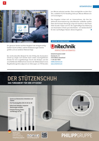 BETONFERTIGTEILEwww.cpi-worldwide.com BWI %u2013 BetonWerk International %u2013 5 | 2025 151Ein eindrucksvolles Beispiel f%u00fcr den Erfolg des Automation Check-up zeigte sich bereits beim ersten durchgef%u00fchrten Einsatz f%u00fcr eine Logistikanlage: Durch die Analyse und die anschlie%u00dfenden Ma%u00dfnahmen konnte die Stillstandszeit eines Regalbedienger%u00e4ts aufgrund von St%u00f6rungen um 94 Stunden pro Monat reduziert werden. Dies erm%u00f6glichte es dem Kunden, zus%u00e4tzlich 4.215 Handling-Units pro Monat effizient einund auszulagern.Das Angebot richtet sich an Unternehmen, die ihre bestehende Automatisierung zukunftssicher aufstellen wollen. Dass das Konzept %u00fcberzeugt, zeigt sich bereits in der Praxis: Viele Kunden haben sich f%u00fcr die regelm%u00e4%u00dfige Durchf%u00fchrung von Automation Check-ups entschieden %u2013 ein starkes Zeichen f%u00fcr den nachhaltigen Nutzen dieses Angebots. nWEITERE INFORMATIONENUnitechnik Systems GmbH Fritz-Kotz-Str. 14 51674 Wiehl, Deutschland T +49 2261 9870 info@unitechnik.comwww.unitechnik.comEin genauer Vorher-nachher-Vergleich der Anlagenverf%u00fcgbarkeit macht sichtbar, welche Verbesserungen bereits greifen und wo weiteres Potenzial liegt.DER ST%u00dcTZENSCHUHPHILIPP GmbHLilienthalstr. 7-963741 Aschaffenburginfo@philipp-gruppe.de www.philipp-gruppe.de PHILIPPGRUPPEDAS FUNDAMENT F%u00dcR IHRE EFFIZIENZ!%u00bb System aus St%u00fctzenschuh, Ankerbolzen und Zubeh%u00f6r%u00bb F%u00fcnf Standardgr%u00f6%u00dfen (20, 24, 30, 36, 39)%u00bb Sofort hoch belastbar, tempor%u00e4re Abst%u00fctzungen entfallen%u00bb Einfache Planung, Einbau und Montage vor Ort