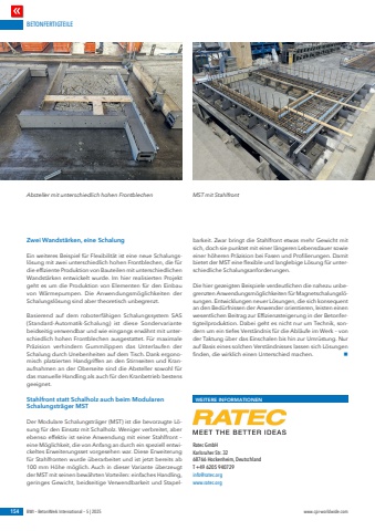 BETONFERTIGTEILE154 BWI %u2013 BetonWerk International %u2013 5 | 2025 www.cpi-worldwide.comZwei Wandst%u00e4rken, eine SchalungEin weiteres Beispiel f%u00fcr Flexibilit%u00e4t ist eine neue Schalungsl%u00f6sung mit zwei unterschiedlich hohen Frontblechen, die f%u00fcr die effiziente Produktion von Bauteilen mit unterschiedlichen Wandst%u00e4rken entwickelt wurde. Im hier realisierten Projekt geht es um die Produktion von Elementen f%u00fcr den Einbau von W%u00e4rmepumpen. Die Anwendungsm%u00f6glichkeiten der Schalungsl%u00f6sung sind aber theoretisch unbegrenzt. Basierend auf dem roboterf%u00e4higen Schalungssystem SAS (Standard-Automatik-Schalung) ist diese Sondervariante beidseitig verwendbar und wie eingangs erw%u00e4hnt mit unterschiedlich hohen Frontblechen ausgestattet. F%u00fcr maximale Pr%u00e4zision verhindern Gummilippen das Unterlaufen der Schalung durch Unebenheiten auf dem Tisch. Dank ergonomisch platzierten Handgriffen an den Stirnseiten und Kranaufnahmen an der Oberseite sind die Absteller sowohl f%u00fcr das manuelle Handling als auch f%u00fcr den Kranbetrieb bestens geeignet.Stahlfront statt Schalholz auch beim Modularen Schalungstr%u00e4ger MSTDer Modulare Schalungstr%u00e4ger (MST) ist die bevorzugte L%u00f6sung f%u00fcr den Einsatz mit Schalholz. Weniger verbreitet, aber ebenso effektiv ist seine Anwendung mit einer Stahlfront %u2013 eine M%u00f6glichkeit, die von Anfang an durch ein speziell entwickeltes Erweiterungsset vorgesehen war. Diese Erweiterung f%u00fcr Stahlfronten wurde %u00fcberarbeitet und ist jetzt bereits ab 100 mm H%u00f6he m%u00f6glich. Auch in dieser Variante %u00fcberzeugt der MST mit seinen bew%u00e4hrten Vorteilen: einfaches Handling, geringes Gewicht, beidseitige Verwendbarkeit und Stapelbarkeit. Zwar bringt die Stahlfront etwas mehr Gewicht mit sich, doch sie punktet mit einer l%u00e4ngeren Lebensdauer sowie einer h%u00f6heren Pr%u00e4zision bei Fasen und Profilierungen. Damit bietet der MST eine flexible und langlebige L%u00f6sung f%u00fcr unterschiedliche Schalungsanforderungen.Die hier gezeigten Beispiele verdeutlichen die nahezu unbegrenzten Anwendungsm%u00f6glichkeiten f%u00fcr Magnetschalungsl%u00f6sungen. Entwicklungen neuer L%u00f6sungen, die sich konsequent an den Bed%u00fcrfnissen der Anwender orientieren, leisten einen wesentlichen Beitrag zur Effizienzsteigerung in der Betonfertigteilproduktion. Dabei geht es nicht nur um Technik, sondern um ein tiefes Verst%u00e4ndnis f%u00fcr die Abl%u00e4ufe im Werk %u2013 von der Taktung %u00fcber das Einschalen bis hin zur Umr%u00fcstung. Nur auf Basis eines solchen Verst%u00e4ndnisses lassen sich L%u00f6sungen finden, die wirklich einen Unterschied machen. nWEITERE INFORMATIONENRatec GmbH Karlsruher Str. 32 68766 Hockenheim, Deutschland T +49 6205 940729 info@ratec.org www.ratec.orgAbsteller mit unterschiedlich hohen Frontblechen MST mit Stahlfront