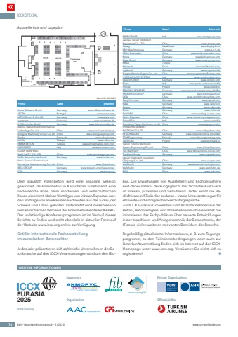 ICCX SPECIAL16 BWI %u2013 BetonWerk International %u2013 5 | 2025 www.cpi-worldwide.comWEITERE INFORMATIONENPartner OrganizationsOfficial AirlineEURASIA 2025www.iccx.orgSupportersOrganisationAusstellerliste und LageplanDem Baustoff Porenbeton wird eine separate Session gewidmet, da Porenbeton in Kasachstan zunehmend eine bedeutende Rolle beim modernen und wirtschaftlichen Bauen einnimmt. Neben Vortr%u00e4gen von lokalen Experten werden Vortr%u00e4ge von anerkannten Fachleuten aus der T%u00fcrkei, der Schweiz und China geboten. Unterst%u00fctzt wird diese Session vom kasachischen Verband der Porenbetonhersteller KAPAG. Das vollst%u00e4ndige Konferenzprogramm ist im Verlauf dieses Berichts zu finden und steht ebenfalls in aktueller Form auf der Website www.iccx.org online zur Verf%u00fcgung. Gr%u00f6%u00dfte internationale Fachausstellung im eurasischen BetonsektorJedes Jahr pr%u00e4sentieren sich zahlreiche Unternehmen der Betonbranche auf den ICCX-Veranstaltungen rund um den Globus. Die Erwartungen von Ausstellern und Fachbesuchern sind dabei nahezu deckungsgleich: Der fachliche Austausch ist intensiv, praxisnah und zielf%u00fchrend. Jeder kennt die Bed%u00fcrfnisse und Ziele des anderen %u2013 ideale Voraussetzungen f%u00fcr effiziente und erfolgreiche Gesch%u00e4ftsgespr%u00e4che.Zur ICCX Eurasia 2025 werden rund 80 Unternehmen aus der Beton-, Betonfertigteil- und Porenbetonindustrie erwartet. Sie informieren das Fachpublikum %u00fcber neueste Entwicklungen in der Maschinen- und Anlagentechnik, der Betonchemie, der IT sowie vielen weiteren relevanten Bereichen der Branche.Regelm%u00e4%u00dfig aktualisierte Informationen, z. B. zum Tagungsprogramm, zu den Teilnahmebedingungen oder auch zur Unterkunftsvermittlung finden sich im Internet auf der ICCXHomepage unter www.iccx.org. Vers%u00e4umen Sie nicht, sich zu registrieren! nAllbau Software GmbH Germany www.allbau-software.deARCEN Portugal www.arcen.comASSYX GmbH & Co. KG Germany www.assyx.comAvermann Germany www.avermann.deBHS Sonthofen GmbH Germany www.bhs-sonthofen.deDezhou Haitian Electromechanical Technology Co., Ltd China www.haitianmachine.cnDongyue Machinery Group Co.,Ltd China www.dongyuegroup.comEhcolo Denmark www.ehcolo.comELKON T%u00fcrkiye www.elkon.netERMAK BETON T%u00fcrkiye www.ermakmakine.com.tr/enEUROMECC Italy www.euromecc.comFUJIAN QUNFENG MACHINERY CO.,LTD China www.qunfenggroup.comHa-Be Betonchemie GmbH Germany www.ha-be.comHebei Xindadi Electrical and Mechanical Manufacturing Co., Ltd. China www.hbxdd.comHESS GROUP Germany www.topwerk.com/hess-groupICCX Germany www.iccx.orgIMER GROUP Italy www.imergroup.comJiangsu Teeyer Intelligent Equipment Co.,LTD China www.teeyer.comKapag Kazakhstan www.kapag.kz/ruKBH Maschinenbau Germany www.k-b-h.deKEDA Suremaker China www.keda-suremaker.comKobra Germany www.kobragroup.comMasa GmbH Germany www.masa-group.comMEKA T%u00fcrkiyeMoldtech Spain www.moldtechsl.es/rumyWood Germany www.mywood.deNingbo Wewin Magnet Co., Ltd. China www.magnetictoolfactory.comNORDIMPIANTI SYSTEM Italy www.nordimpianti.comOsborn GmbH Germany www.osborn.comPenta Italy www.penta-automazioni.it/itPolblat Poland www.polblat.plPRINZING PFEIFFER Germany www.topwerk.com/prinzing-pfeifferPROGRESS GROUP Germany www.progress.groupQGM China www.zenithbrickmachine.comRampf Formen Germany www.rampf.comRatec Germany www.ratec.orgRekers Germany www.rekers.deRotho Germany www.rotho.deRUNDING China www.runding-aacline.comSaixin Magnetic China www.shuttering-magnets.comSchnell Spa Italy www.schnell.itShandong Tianyi Machinery co.,ltd China www.sdyzty.com/enSHANGHAI SHINRAY BIOTECH CO.,LTD China www.sidleychem.comSR SCHINDLER Germany www.topwerk.com/sr-schindlerTDM Engineering Finland www.tdm-engineering.comTechmatik Poland www.techmatik.plTianjin Yinfeng Machinery System Engineering Co.,Ltd China www.tyfmachine.comTJK Machinery China www.tjkmachinery-group.comTopWerk Group Germany www.topwerk.comUkeyer Intelligent Equipment (Zhejiang) Co., Ltd. China www.ukeyer.comWASA AG Germany www.wasa-technologies.comWehrhahn Germany www.wehrhahn.deZCJK China www.zcjk.comFirma Land InternetFirma Land InternetStand: 26. 08. 2025