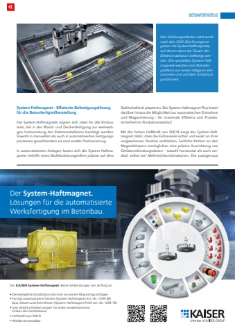BETONFERTIGTEILEwww.cpi-worldwide.com BWI %u2013 BetonWerk International %u2013 5 | 2025 161System-Haftmagnet %u2013 Effiziente Befestigungsl%u00f6sung f%u00fcr die BetonfertigteilherstellungDie System-Haftmagnete eignen sich ideal f%u00fcr alle Einbauteile, die in der Wand- und Deckenfertigung zur werkseitigen Vorbereitung der Elektroinstallation ben%u00f6tigt werden. Sowohl in manuellen als auch in automatisierten Fertigungsprozessen gew%u00e4hrleisten sie eine exakte Positionierung.In automatisierten Anlagen lassen sich die System-Haftmagnete mithilfe eines Multifunktionsgreifers pr%u00e4zise auf dem Stahlschaltisch platzieren. Der System-Haftmagnet Plus bietet dar%u00fcber hinaus die M%u00f6glichkeit zur automatischen Entnahme und Magazinierung %u2013 f%u00fcr maximale Effizienz und Prozesssicherheit im Produktionsablauf.Mit der hohen Haftkraft von 500 N sorgt der System-Haftmagnet daf%u00fcr, dass die Einbauteile sicher und exakt an ihrer vorgesehenen Position verbleiben. Seitliche Kerben an den Magnetk%u00f6rpern erm%u00f6glichen eine pr%u00e4zise Ausrichtung von Ger%u00e4teverbindungsdosen %u2013 sowohl horizontal als auch vertikal, selbst bei Mehrfachkombinationen. Die passgenaue Der Schalungsroboter setzt exakt nach den CAD-Zeichnungsvorgaben die Systemhaftmagnete, auf denen dann die Dosen der Elektroinstallation befestigt werden. Die speziellen System-Haftmagnete werden vom Robotergreifarm aus einem Magazin entnommen und auf dem Schaltisch positioniert.KAI0925CPIDer System-Haftmagnet. L%u00f6sungen f%u00fcr die automatisierteWerksfertigung im Betonbau.Der KAISER System-Haftmagnet. Beste Verbindungen von Anfang an. %u2022 Die komplette Installation kann mit nur einem Magnettyp erfolgen%u2022 F%u00fcr das automatisierte Setzen (System-Haftmagnet Art.-Nr. 1299-69) bzw. Setzen und Entnehmen (System-Haftmagnet PLUS Art.-Nr. 1299-70)%u2022 Vier seitliche Kerben sorgen f%u00fcr einen verdrehsicheren Einbau der Ger%u00e4tedosen%u2022 Haftkraft von 500 N%u2022 Wiederverwendbar