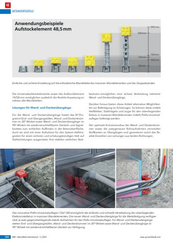 BETONFERTIGTEILE164 BWI %u2013 BetonWerk International %u2013 5 | 2025 www.cpi-worldwide.comDie Universalaufstockelemente sowie das Aufstockelement 10/50 mm erm%u00f6glichen zus%u00e4tzlich die flexible Anpassung an nahezu alle Wandst%u00e4rken.L%u00f6sungen f%u00fcr Wand- und Decken%u00fcberg%u00e4ngeF%u00fcr die Wand- und Decken%u00fcberg%u00e4nge bietet das B%u00b2-Programm End- und %u00dcbergangst%u00fcllen, Wand- und Deckenkr%u00fcmmer im 30%u00b0-Winkel sowie Wand- und Decken%u00fcberg%u00e4nge im 90%u00b0-Winkel mit wiederverschlie%u00dfbaren Deckeln und Signalborsten zum einfachen Auffinden in der Betonoberfl%u00e4che. Auch sie sind mit einer Aufnahme f%u00fcr den System-Haftmagneten f%u00fcr einen sicheren und schalungsb%u00fcndigen Halt auf Stahlschalungen ausger%u00fcstet. Ihre stabilen seitlichen Rastkonturen erm%u00f6glichen eine sichere Verbindung mehrerer Wand- und Decken%u00fcberg%u00e4nge.Dar%u00fcber hinaus bieten diese Artikel alternative M%u00f6glichkeiten zur Befestigung an Schalungen. So k%u00f6nnen diese mittels Hei%u00dfkleber, Stahln%u00e4geln und sogar f%u00fcr den obenliegenden Einbau in massiven Wandelementen mittels Prefix-Universalauflager befestigt werden.Der optimale Kr%u00fcmmerradius der Wand- und Deckenkr%u00fcmmer sowie die passgenauen Rohraufnahmen vermeiden Sto%u00dfkanten an %u00dcberg%u00e4ngen und garantieren somit das flexible Einziehen von Leitungen aus beiden Richtungen.Einfache und sichere Einstellung auf die erforderliche Wandst%u00e4rke bei massiven Wandelementen und bei Doppelw%u00e4ndenDas innovative Prefix-Universalauflager (1261-00) erm%u00f6glicht die einfache und schnelle Verarbeitung der obenliegenden Elektroinstallation in massiven Wandelementen. Die neuen Wand- und Decken%u00fcberg%u00e4nge f%u00fcr die Werksfertigung verf%u00fcgen %u00fcber je zwei gegen%u00fcberliegende stabile Aufnahmen f%u00fcr das Prefix-Universalauflager. F%u00fcr Wand- und Decken%u00fcberg%u00e4nge stehen End- und %u00dcbergangst%u00fcllen, Wand- und Deckenkr%u00fcmmer im 30%u00b0-Winkel sowie Wand- und Decken%u00fcberg%u00e4nge im 90%u00b0-Winkel mit wiederverschlie%u00dfbaren Deckeln zur Verf%u00fcgung.