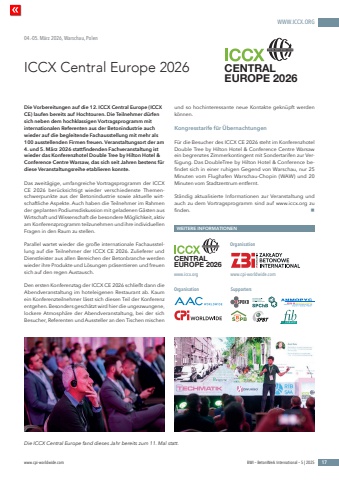WWW.ICCX.ORGwww.cpi-worldwide.com BWI %u2013 BetonWerk International %u2013 5 | 2025 17Die Vorbereitungen auf die 12. ICCX Central Europe (ICCX CE) laufen bereits auf Hochtouren. Die Teilnehmer d%u00fcrfen sich neben dem hochklassigen Vortragsprogramm mit internationalen Referenten aus der Betonindustrie auch wieder auf die begleitende Fachausstellung mit mehr als 100 ausstellenden Firmen freuen. Veranstaltungsort der am 4. und 5. M%u00e4rz 2026 stattfindenden Fachveranstaltung ist wieder das Konferenzhotel Double Tree by Hilton Hotel & Conference Centre Warsaw, das sich seit Jahren bestens f%u00fcr diese Veranstaltungsreihe etablieren konnte.Das zweit%u00e4gige, umfangreiche Vortragsprogramm der ICCX CE 2026 ber%u00fccksichtigt wieder verschiedenste Themenschwerpunkte aus der Betonindustrie sowie aktuelle wirtschaftliche Aspekte. Auch haben die Teilnehmer im Rahmen der geplanten Podiumsdiskussion mit geladenen G%u00e4sten aus Wirtschaft und Wissenschaft die besondere M%u00f6glichkeit, aktiv am Konferenzprogramm teilzunehmen und ihre individuellen Fragen in den Raum zu stellen. Parallel wartet wieder die gro%u00dfe internationale Fachausstellung auf die Teilnehmer der ICCX CE 2026. Zulieferer und Dienstleister aus allen Bereichen der Betonbranche werden wieder ihre Produkte und L%u00f6sungen pr%u00e4sentieren und freuen sich auf den regen Austausch.Den ersten Konferenztag der ICCX CE 2026 schlie%u00dft dann die Abendveranstaltung im hoteleigenen Restaurant ab. Kaum ein Konferenzteilnehmer l%u00e4sst sich diesen Teil der Konferenz entgehen. Besonders gesch%u00e4tzt wird hier die ungezwungene, lockere Atmosph%u00e4re der Abendveranstaltung, bei der sich Besucher, Referenten und Aussteller an den Tischen mischen und so hochinteressante neue Kontakte gekn%u00fcpft werden k%u00f6nnen.Kongresstarife f%u00fcr %u00dcbernachtungenF%u00fcr die Besucher des ICCX CE 2026 steht im Konferenzhotel Double Tree by Hilton Hotel & Conference Centre Warsaw ein begrenztes Zimmerkontingent mit Sondertarifen zur Verf%u00fcgung. Das DoubleTree by Hilton Hotel & Conference befindet sich in einer ruhigen Gegend von Warschau, nur 25 Minuten vom Flughafen Warschau-Chopin (WAW) und 20 Minuten vom Stadtzentrum entfernt. St%u00e4ndig aktualisierte Informationen zur Veranstaltung und auch zu dem Vortragsprogramm sind auf www.iccx.org zu finden. nICCX Central Europe 202604.-05. M%u00e4rz 2026, Warschau, PolenCENTRALEUROPE 2026WEITERE INFORMATIONENwww.iccx.org www.cpi-worldwide.comOrganisationCENTRALEUROPE 2026Organisation SupportersDie ICCX Central Europe fand dieses Jahr bereits zum 11. Mal statt.