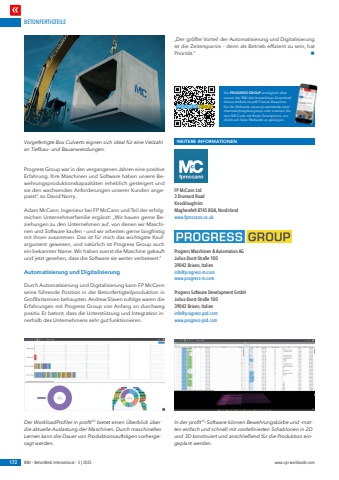 BETONFERTIGTEILE172 BWI %u2013 BetonWerk International %u2013 5 | 2025 www.cpi-worldwide.comProgress Group war in den vergangenen Jahren eine positive Erfahrung. Ihre Maschinen und Software haben unsere Bewehrungsproduktionskapazit%u00e4ten erheblich gesteigert und sie den wachsenden Anforderungen unserer Kunden angepasst%u201d, so David Norry.Adam McCann, Ingenieur bei FP McCann und Teil der erfolgreichen Unternehmerfamilie erg%u00e4nzt: %u201eWir bauen gerne Beziehungen zu den Unternehmen auf, von denen wir Maschinen und Software kaufen %u2013 und wir arbeiten gerne langfristig mit ihnen zusammen. Das ist f%u00fcr mich das wichtigste Kaufargument gewesen, und nat%u00fcrlich ist Progress Group auch ein bekannter Name. Wir haben zuerst die Maschine gekauft und jetzt gesehen, dass die Software sie weiter verbessert.%u201dAutomatisierung und DigitalisierungDurch Automatisierung und Digitalisierung kann FP McCann seine f%u00fchrende Position in der Betonfertigteilproduktion in Gro%u00dfbritannien behaupten. Andrew Slaven zufolge waren die Erfahrungen mit Progress Group von Anfang an durchweg positiv. Er betont, dass die Unterst%u00fctzung und Integration innerhalb des Unternehmens sehr gut funktionieren. %u201eDer gr%u00f6%u00dfte Vorteil der Automatisierung und Digitalisierung ist die Zeitersparnis %u2013 denn als Betrieb effizient zu sein, hat Priorit%u00e4t.%u201d nWEITERE INFORMATIONENFP McCann Ltd3 Drumard RoadKnockloughrimMagherafelt BT45 8QA, Nordirlandwww.fpmccann.co.ukProgress Maschinen & Automation AGJulius-Durst-Stra%u00dfe 10039042 Brixen, Italieninfo@progress-m.comwww.progress-m.comProgress Software Development GmbHJulius-Durst-Stra%u00dfe 10039042 Brixen, Italieninfo@progress-psd.comwww.progress-psd.comVorgefertigte Box Culverts eignen sich ideal f%u00fcr eine Vielzahl an Tiefbau- und Bauanwendungen.Der WorkloadProfiler in profitYC bietet einen %u00dcberblick %u00fcber die aktuelle Auslastung der Maschinen. Durch maschinelles Lernen kann die Dauer von Produktionsauftr%u00e4gen vorhergesagt werden.In der profitYC-Software k%u00f6nnen Bewehrungsk%u00f6rbe und -matten einfach und schnell mit vordefinierten Schablonen in 2D und 3D konstruiert und anschlie%u00dfend f%u00fcr die Produktion eingeplant werden.Die PROGRESS GROUP erm%u00f6glicht allen Lesern der BWI den kostenlosen Download dieses Artikels im pdf-Format. Besuchen Sie die Webseite www.cpi-worldwide.com/channels/progress-group oder scannen Sie den QR-Code mit Ihrem Smartphone, um direkt auf diese Webseite zu gelangen.