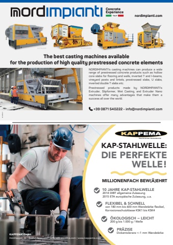 EXTRUDER NANOnordimpianti.comThe best casting machines availablefor the production of high quality prestressed concrete elementsNORDIMPIANTI%u2019s casting machines can produce a wide range of prestressed concrete products such as hollow core slabs for flooring and walls, inverted T and I-beams, vineyard posts and lintels, prestressed slabs, U slabs, inverted double T slabs etc.Prestressed products made by NORDIMPIANTI%u2019s Extruder, Slipformer, Wet Casting, and Extruder Nano machines offer many advantages that make them a success all over the world.%ue138+39 0871 540222 - info@nordimpianti.comadv | webnue.itEXTRUDER SLIPFORMER WET CASTINGConcreteExperience ITA LYKAP-STAHLWELLE:DIE PERFEKTE WELLE!10 JAHRE KAP-STAHLWELLEFLEXIBEL & SCHNELL%u00d6KOLOGISCH %u2212 LEICHTPR%u00c4ZISEvon 180 mm bis 600 mm Wandst%u00e4rke fl exibel, Korrosionsschutzklasse KSK1 bis KSK42014 DIBT allgemeine Zulassung2015 ETA europ%u00e4ische Zulassung, u.a.200 g bis 1.000 g / WelleDickentoleranz <-1 mm Wandst%u00e4rke KAPPEMA GmbHHolzhausen 2a | 83317 Teisendorf | offi ce@kappema.com | www.kappema.comMILLIONENFACH BEW(%u00c4)EHRT
