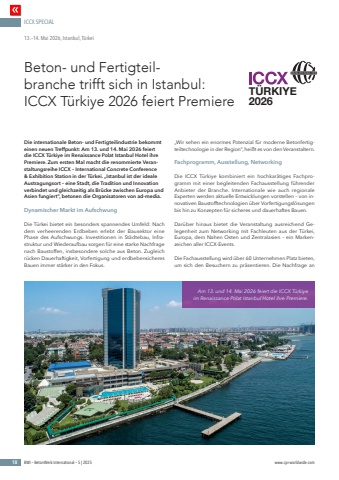 ICCX SPECIAL18 BWI %u2013 BetonWerk International %u2013 5 | 2025 www.cpi-worldwide.comDie internationale Beton- und Fertigteilindustrie bekommt einen neuen Treffpunkt: Am 13. und 14. Mai 2026 feiert die ICCX T%u00fcrkiye im Renaissance Polat Istanbul Hotel ihre Premiere. Zum ersten Mal macht die renommierte Veranstaltungsreihe ICCX %u2013 International Concrete Conference & Exhibition Station in der T%u00fcrkei. %u201eIstanbul ist der ideale Austragungsort %u2013 eine Stadt, die Tradition und Innovation verbindet und gleichzeitig als Br%u00fccke zwischen Europa und Asien fungiert%u201c, betonen die Organisatoren von ad-media.Dynamischer Markt im AufschwungDie T%u00fcrkei bietet ein besonders spannendes Umfeld: Nach dem verheerenden Erdbeben erlebt der Bausektor eine Phase des Aufschwungs. Investitionen in St%u00e4dtebau, Infrastruktur und Wiederaufbau sorgen f%u00fcr eine starke Nachfrage nach Baustoffen, insbesondere solche aus Beton. Zugleich r%u00fccken Dauerhaftigkeit, Vorfertigung und erdbebensicheres Bauen immer st%u00e4rker in den Fokus.%u201eWir sehen ein enormes Potenzial f%u00fcr moderne Betonfertigteiltechnologie in der Region%u201c, hei%u00dft es von den Veranstaltern.Fachprogramm, Ausstellung, NetworkingDie ICCX T%u00fcrkiye kombiniert ein hochkar%u00e4tiges Fachprogramm mit einer begleitenden Fachausstellung f%u00fchrender Anbieter der Branche. Internationale wie auch regionale Experten werden aktuelle Entwicklungen vorstellen %u2013 von innovativen Baustofftechnologien %u00fcber Vorfertigungsl%u00f6sungen bis hin zu Konzepten f%u00fcr sicheres und dauerhaftes Bauen.Dar%u00fcber hinaus bietet die Veranstaltung ausreichend Gelegenheit zum Networking mit Fachleuten aus der T%u00fcrkei, Europa, dem Nahen Osten und Zentralasien %u2013 ein Markenzeichen aller ICCX-Events.Die Fachausstellung wird %u00fcber 60 Unternehmen Platz bieten, um sich den Besuchern zu pr%u00e4sentieren. Die Nachfrage an Beton- und Fertigteilbranche trifft sich in Istanbul: ICCX T%u00fcrkiye 2026 feiert Premiere13.%u201314. Mai 2026, Istanbul, T%u00fcrkeiT%u00dcRKIYE2026Am 13. und 14. Mai 2026 feiert die ICCX T%u00fcrkiye im Renaissance Polat Istanbul Hotel ihre Premiere.