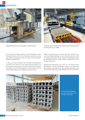 BETONFERTIGTEILE180 BWI %u2013 BetonWerk International %u2013 5 | 2025 www.cpi-worldwide.comDie Produktionsanlage besteht aus f%u00fcnf 100 Meter langen Produktionslinien, die f%u00fcr eine Produktionsanforderung von etwa 600 m%u00b2 Deckenelementen pro Tag in einer 8-StundenSchicht ausgelegt sind.In Bezug auf die Produktion der Spannbetonfertigdecken entschied sich Armos f%u00fcr die Extrusionstechnologie von Nordimpianti, die sich durch innovative technische L%u00f6sungen auszeichnet, die die Wartungskosten niedrig halten und ein hohes Ma%u00df an Effizienz beim Betonieren garantieren.Weitere Zusatzmaschinen wurden ebenfalls geliefert, darunter eine Mehrwinkels%u00e4ge, mit der Elemente von bis zu 500 mm H%u00f6he beschnitten werden k%u00f6nnen, Hebebalken, K%u00fcbel f%u00fcr den Betontransport sowie weiteres Equipment f%u00fcr den Produktionsprozess.Nordimpianti k%u00fcmmerte sich auch um die Planung des Werkslayouts und der Widerlager sowie um die Beratung beim Einsatz der Software f%u00fcr die Deckenkonstruktion und die Produktionsplanung. Diese Software wurde von dem belSpannbetonfertigdecken im Lager, bereit f%u00fcr die Lieferung zur BaustelleBatteriebetriebener Transportwagen f%u00fcr Betonk%u00fcbel Verwendung der Startplatte am Anfang der Produktionsbahn zur Reduzierung von Abfall