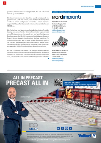 BETONFERTIGTEILEwww.cpi-worldwide.com BWI %u2013 BetonWerk International %u2013 5 | 2025 181360%u00b0 LIVE-ERLEBNIS: Jetzt f%u00fcr die World of Precast registrieren! ALL IN PRECASTPRECAST ALL INAlexander KasparSenior Sales ManagerAls f%u00fchrender Know-how-Partner bieten wir individuell zugeschnittene Anlagen- und Maschinenl%u00f6sungen f%u00fcr die moderne Betonfertigteilproduktion. Alles, was Sie f%u00fcr eine gewinnbringende Investition ben%u00f6tigen. Made in Germany. Seit 1925.www.vollert.de | precast@vollert.de | www.youtube.com/vollertprecastgischen Unternehmen i-Theses geliefert, das sich auf diesen Bereich spezialisiert hat.Die Inbetriebnahme der Maschine wurde erfolgreich abgeschlossen, und die ersten produzierten Deckenplatten wurden in einem Gro%u00dfprojekt verwendet %u2013 einem mehrst%u00f6ckigen K%u00fchlhaus f%u00fcr Dianomefs mit einer Gesamtfl%u00e4che von 10.000 m%u00b2.Die Aufnahme von Spannbetonfertigdecken in den Produktkatalog von Armos hat das Unternehmen in die Lage versetzt, seine Marktposition weiter zu st%u00e4rken und gleichzeitig seine Gewinnmargen bei der Lieferung und Logistik zu verbessern.Sowohl Armos als auch Nordimpianti sind gut etablierte Familienunternehmen, was zu einer engen Beziehung gef%u00fchrt hat, die auf gegenseitigem Vertrauen beruht. Beide Unternehmen haben ein gemeinsames Interesse daran, ihren hervorragenden Ruf in ihrem jeweiligen Bereich zu wahren.Mit der Einf%u00fchrung des neuen Deckentyps bei Armos er%u00f6ffnen sich dem Unternehmen neue M%u00f6glichkeiten, sodass es weiterhin in zus%u00e4tzliche automatische Maschinen investieren wird, um seine Effizienz und Produktionskapazit%u00e4t zu erh%u00f6hen.nWEITERE INFORMATIONENNORDIMPIANTI SYSTEM SRLVia Erasmo Piaggio, 19/A66100 Chieti (CH), ItalienT +39 0871 540222info@nordimpianti.comwww.nordimpianti.comARMOS PROKATASKEVES S.A4th km Larisas %u2013 Sikouriou41002 Larisa, GriechenlandT 2410 575035-6-7info@armosprokat.grwww.armosprokat.gr