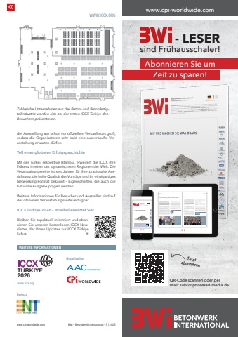 WWW.ICCX.ORGwww.cpi-worldwide.com BWI %u2013 BetonWerk International %u2013 5 | 2025WEITERE INFORMATIONENwww.iccx.orgT%u00dcRKIYE2026PartnerOrganisationder Ausstellung war schon vor offiziellem Verkaufsstart gro%u00df, sodass die Organisatoren sehr bald eine ausverkaufte Veranstaltung erwarten d%u00fcrfen.Teil einer globalen ErfolgsgeschichteMit der T%u00fcrkei, respektive Istanbul, erweitert die ICCX ihre Pr%u00e4senz in einer der dynamischsten Regionen der Welt. Die Veranstaltungsreihe ist seit Jahren f%u00fcr ihre praxisnahe Ausrichtung, die hohe Qualit%u00e4t der Vortr%u00e4ge und ihr einzigartiges Networking-Format bekannt %u2013 Eigenschaften, die auch die t%u00fcrkische Ausgabe pr%u00e4gen werden.Weitere Informationen f%u00fcr Besucher und Aussteller sind auf der offiziellen Veranstaltungsseite verf%u00fcgbar.ICCX T%u00fcrkiye 2026 %u2013 Istanbul erwartet Sie!Bleiben Sie topaktuell informiert und abonnieren Sie unseren kostenlosen ICCX-Newsletter, der Ihnen Updates zur ICCX T%u00fcrkiye liefert. nZahlreiche Unternehmen aus der Beton- und Betonfertigteilindustrie werden sich bei der ersten ICCX T%u00fcrkiye den Besuchern pr%u00e4sentieren.www.cpi-worldwide.comNACHRICHTEN NACHRICHTEN18 BWI %u2013 BetonWerk International %u2013 6 | 2024 www.cpi-worldwide.com www.cpi-worldwide.com BWI %u2013 BetonWerk International %u2013 6 | 2024 19Elematic Oyj und Heidelberg Materials Precast Abetong Ab haben eine kommerzielle und technologische Vereinbarung %u00fcber die Entwicklung von Produktionstechnologien f%u00fcr Betonfertigteileisenbahnschwellen unterzeichnet. Mit dieser Vereinbarung wollen die beiden Unternehmen die weltweite Nutzung von Betonschwellen und die technologische Entwicklung ihrer Produktionstechnologie st%u00e4rken.Heidelberg Materials Precast Abetong AB verf%u00fcgt %u00fcber langj%u00e4hrige Erfahrung in der Entwicklung und Herstellung von Eisenbahnschwellen und Produktionstechnologie. Bei Elematic handelt es sich um ein weltweit f%u00fchrendes Unternehmen f%u00fcr Betonfertigteilproduktionslinien und -maschinen mit umfangreicher F&E-Erfahrung im Bereich Betonmaschinen.%u201eWir sind stolz darauf, diese Partnerschaft mit Heidelberg Materials Precast Abetong AB bekanntzugeben, die auf deren langj%u00e4hriger Erfahrung in der Entwicklung innovativer L%u00f6sungen f%u00fcr Eisenbahnschwellen aufbaut. Wir sehen die Chance, einen positiven Beitrag zum Absatz von Betonschwellenproduktionstechnologien zu leisten und der Technologielieferant f%u00fcr Precast Abetong zu sein. Die F%u00e4higkeit von Elematic, die Markteinf%u00fchrungsbem%u00fchungen zu unterst%u00fctzen, zeigt unsere weltweite Reichweite gegen%u00fcber unserem vielf%u00e4ltigen Kundenstamm. Dar%u00fcber hinaus veranschaulicht die Lieferung dieser Maschinen die Fertigungstiefe unserer Systeme und die F%u00e4higkeiten unserer F&E- sowie unserer Produktionsteams. Wir freuen uns darauf, unsere mehrj%u00e4hrige Zusammenarbeit zu vertiefen und unseren Kunden den besten Nutzen zu bieten%u201c, so Teppo Voutilainen, CEO von Elematic.%u201eMit dieser Kooperation werden wir die Erfahrung und das Know-how von Elematic in die weitere Entwicklung und den Vertrieb unserer herausragenden Eisenbahnschwellenproduktionstechnologie einbringen%u201c, bemerkt Filip Sten, Gesch%u00e4ftsf%u00fchrer von Heidelberg Materials Precast Abetong.Elematic hat die erste Einheit, eine Zieh- und Schneidevorrichtung an das Werk von Heidelberg Materials Precast Abetong in S%u00fcdschweden geliefert. nElematic und Heidelberg Materials Precast Abetong starten Zusammenarbeit bei EisenbahnschwellenproduktionElematic, 37801 Akaa, FinnlandWEITERE INFORMATIONENElematicAirolantie 2, P.O. Box 3337801 Akaa, Finnlandwww.elematic.comUnterzeichnung der Vereinbarung zwischen Elematic und Heidelberg Materials Precast Abetong. Von links nach rechts: Teppo Voutilainen, CEO, Elematic, Jouni Sirkka, Director R&D, Elematic, Mathias Johansson, Sales Manager, Heidelberg Cement Precast Abetong, Ulf Malmqvist, Sales Manager, Heidelberg Cement Precast Abetong und Ismo Kallio, Vice President Sales, ElematicDie bauma ist die weltweit f%u00fchrende Branchenveranstaltung f%u00fcr Baumaschinen, Baustoffmaschinen, Bergbaumaschinen, Baufahrzeuge und Bauger%u00e4te und ist mit einer Gesamtausstellungsfl%u00e4che von 614.000 Quadratmetern fl%u00e4chentechnisch die gr%u00f6%u00dfte Messe der Welt. Die bauma hat einen dreij%u00e4hrigen Turnus; die n%u00e4chste Ausgabe findet vom 7. bis 13. April 2025 in M%u00fcnchen statt. Erwartet werden %u00fcber 3.000 Aussteller aus ca. 60 L%u00e4ndern der Erde und etwa 500.000 internationale Besucher. Die Leitthemen der bauma 2025Digitalisierung und Nachhaltigkeit %u2013 das sind die zuk%u00fcnftigen Leitplanken unserer Branche. Sie spiegeln sich in den f%u00fcnf Leitthemen der bauma 2025 wider, die gemeinsam mit dem bauma-Partner, dem VDMA, Fachverband Baumaschinen und Baustoffanlagen, sowie Vertretern der Industrie festgelegt wurden. Diese Leitthemen werden im bauma-Rahmenprogramm und durch die Innovationen der Aussteller erlebbar gemacht. bauma-InnovationspreisDer bauma Innovationspreis wird in f%u00fcnf Kategorien vergeben. Der Preis wird bereits zum vierzehnten Mal verliehen und ist ideell, also nicht mit einem Preisgeld verbunden.Der Wettbewerb ist ein gemeinschaftliches Projekt unter Federf%u00fchrung des VDMA Baumaschinen und Baustoffanlagen, der Messe M%u00fcnchen, des Hauptverbands der Deutschen Bauindustrie e.V. (HDB), des Zentralverbands des deutschen Baugewerbes e.V. (ZDB) und des Bundesverbands Baustoffe - Steine und Erden e.V. (bbs).Hallen B und C mit Schwerpunkt Anlagenbau f%u00fcr die BetonindustrieDie Hallen B und C sind seit Jahren schon das Zentrum der Betonindustrie. Die meisten Anlagenbauer aus diesem Industriezweig sind hier zu finden und pr%u00e4sentieren dem Publikum ihre Innovationen. Innovationshalle bauma LAB0Die Halle B0 ist gewisserma%u00dfen der Schmelztiegel aus Industrie, Wissenschaft und Start-Up-Szene. In der Innovat