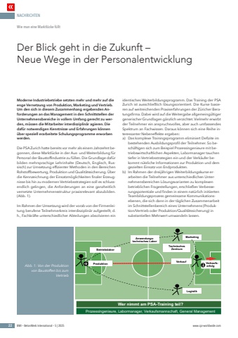 NACHRICHTEN22 BWI %u2013 BetonWerk International %u2013 5 | 2025 www.cpi-worldwide.comModerne Industriebetriebe setzten mehr und mehr auf die enge Vernetzung von Produktion, Marketing und Vertrieb. Um den sich in diesem Zusammenhang ergebenden Anforderungen an das Management in den Schnittstellen der Unternehmensbereiche in vollem Umfang gerecht zu werden, m%u00fcssen die Mitarbeiter interdisziplin%u00e4r agieren. Die daf%u00fcr notwendigen Kenntnisse und Erfahrungen k%u00f6nnen %u00fcber speziell erarbeitete Schulungsprogramme erworben werden.Die PSA Zurich hatte bereits vor mehr als einem Jahrzehnt begonnen, diese Marktl%u00fccke in der Aus- und Weiterbildung f%u00fcr Personal der Baustoffindustrie zu f%u00fcllen. Die Grundlage daf%u00fcr bilden mehrsprachige Lehrinhalte (Deutsch, Englisch, Russisch) zur Umsetzung effizienter Methoden in den Bereichen Rohstoffbewertung, Produktion und Qualit%u00e4tssicherung. %u00dcber die Kennzeichnung der Einsatzm%u00f6glichkeiten finaler Erzeugnisse bis hin zu modernen Vertriebsstrategien soll es schlussendlich gelingen, die Anforderungen an eine ganzheitlich vernetzte Unternehmensstruktur praxisrelevant abzubilden. (Abb. 1). Im Rahmen der Umsetzung wird der vorab von der Firmenleitung berufene Teilnehmerkreis interdisziplin%u00e4r aufgestellt, d. h., Fachkr%u00e4fte unterschiedlicher Abteilungen absolvieren ein identisches Weiterbildungsprogramm. Das Training der PSA Zurich ist ausschlie%u00dflich l%u00f6sungsorientiert. Die Kurse basieren auf weitreichenden Praxiserfahrungen der Z%u00fcricher Beratungsfirma. Dabei wird auf die Weitergabe allgemeing%u00fcltiger generischer Grundlagen g%u00e4nzlich verzichtet. Vielmehr erwirbt der Teilnehmer ein anspruchsvolles, aber auch umfassendes Spektrum an Fachwissen. Daraus k%u00f6nnen sich eine Reihe interessanter Nebeneffekte ergeben:a) Das komplexe Trainingsprogramm eliminiert Defizite im bestehenden Ausbildungsprofil der Teilnehmer. So besch%u00e4ftigen sich zum Beispiel Prozessingenieure mit betriebswirtschaftlichen Aspekten, Labormanager tauchen tiefer in Vertriebsstrategien ein und der Verk%u00e4ufer bekommt n%u00fctzliche Informationen zur Produktion und dem gezielten Einsatz von Endprodukten.b) Im Rahmen der dreij%u00e4hrigen Weiterbildungskurse erarbeiten die Teilnehmer aus unterschiedlichen Unternehmensbereichen L%u00f6sungsvarianten zu komplexen betrieblichen Fragestellungen, erschlie%u00dfen Verbesserungspotentiale und finden in einem nat%u00fcrlich initiierten Teambildungsprozess gemeinsame Kommunikationsebenen, die sich dann in der t%u00e4glichen Zusammenarbeit im Schnittstellenbereich eines Unternehmens (Produktion/Vertrieb oder Produktion/Qualit%u00e4tssicherung) in substantiellen Mehrwert umwandeln lassen.Der Blick geht in die Zukunft %u2013 Neue Wege in der PersonalentwicklungWie man eine Marktl%u00fccke f%u00fcllt%u0012*(ff-$,#('%u0010fl*$fi,#'!%u0016fi*$fl- %u0016fi*$fl- +%u0005fi* (%!%u0001%u0001%u0001%u0008fi,*#fiffi+%flffi(*%u0015fiffl\%u0018fi',*-&%u0007'/fi'ff-'!+%u0005,fiffl\%u000f(!#+,#$%u000f%u0012ffi %u0019%u0015%u0018%u0018ff %u0010%u0018%u0001%u000c%u0006%u0003%u000effi%u0010%u0015%u0019%u0015%u0019%u0014%u0001ff%u0012%u0015%u0017%u0005fiff#%u0015 %u0019ffl%u0017%u0015ffl%u0019%u0015\%u0011%u0012fffiffi%u0011ffl%u0011%u0017%u0015fi%u0003 %u000f%u0015fi%u001a%u0011\Abb. 1: Von der Produktion von Baustoffen bis zum Vertrieb