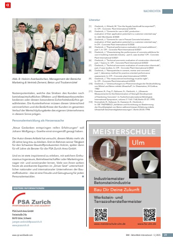 NACHRICHTENwww.cpi-worldwide.com BWI %u2013 BetonWerk International %u2013 5 | 2025 29Nutzenpotentialen, welche das Streben des Kunden nach betriebswirtschaftlichen Effekten und Wettbewerbsvorteilen bedienen oder dessen besonderes Sicherheitsbed%u00fcrfnis gew%u00e4hrleisten. Die Kursteilnehmer m%u00fcssen diesen Unterschied verinnerlichen und die Bed%u00fcrfnisse der Kunden im gesamten Verlauf der Wertsch%u00f6pfungskette des eigenen Unternehmens in diesem Sinne pr%u00e4gen.Personalentwicklung als Herzenssache %u201eNeue Gedanken entspringen reifen Erfahrungen%u201c soll Johann Wolfgang v. Goethe einst sinngem%u00e4%u00df gesagt haben.Der Autor dieses Artikels hat versucht, diesem Motto mehr als 20 Jahre lang treu zu bleiben. Erst im Rahmen seiner T%u00e4tigkeit f%u00fcr den Schweizer Baustoffproduzenten Holcim, sp%u00e4ter dann f%u00fcr elf Jahre als Berater f%u00fcr die PSA Zurich Area GmbH. Und es ist stets inspirierend zu erleben, mit welchem Enthusiasmus Ingenieure, Betriebswirtschaftler oder Marketingmanager mit- und voneinander lernen. Viele von ihnen wirken heute als anerkannte Experten im %u201eDriver Seat%u201c unterschiedlicher nationaler und internationaler Unternehmen der Baustoffindustrie %u2013 das ist eine Freude und Genugtuung f%u00fcr jeden Personalentwickler. nLiteratur[1] Oecknick, J.; Erhardt, M. %u201cCan the fa%u00e7ade handicraft be exported?%u201d; In: CPI %u2013 Concrete Plant International 2/2018[2] Oecknick, J. %u201cCements for use in AAC production %u2013 evaluation of their application potential in a customer-oriented way%u201d In: AAC Worldwide 4/2020[3] Oecknick, J. %u201cCements for use in Precast Concrete Industries %u2013 evaluation of their application potential in a customer-oriented way%u201d; In CPI %u2013 Concrete Plant International 5/2020[4] Oecknick, J. %u201cPractical performance evaluation of mineral additions%u201d; part 1; In: CPI %u2013 Concrete Plant International 4/2021[5] Oecknick, J. %u201cCharacterizing the performance of concrete additions for use in building materials industry %u2013 part 2, case studies%u201d CPI %u2013 Concrete Plant International 5/2021[6] Oecknick, J. %u201cTechnical-economic evaluation of construction chemicals%u201d; part, 1 basics; In: CPI %u2013 Concrete Plant International 4/2022[7] Oecknick, J. %u201cTechnical-economic evaluation of construction chemicals%u201d; part, 2 case studies; In: CPI %u2013 Concrete Plant International 6/2022[8] Oecknick, J. %u201cNanoparticles in cement, mortar and concrete%u201d; part 1, laboratory method for practice-oriented performance assessment; In: CPI %u2013 Concrete plant International 3/2023[9] Oecknick, J. %u201cThe measurement technology must be right%u201d; In: CPI %u2013 Concrete Plant International 6/2024[10] Oecknick, J. %u201cUntersuchungen zur Phenomenologie der Strukturbildung von M%u00f6rtel und Beton mittels Ultraschall%u201c; In: Dissertation, IH Cottbus 1982 [11] Kaessner, B.; Frey, P.; Gebauer, G.; Oecknick, J., %u201eUltrasonic Measurements for the Determination of Strength Development of Hardening Concrete%u201d; In. Fachinformationsdienst BAUdigital, International Symposium, volume 2 1165-1168, Berlin 01.01.1995 [12] Krompholz, R.; Gebauer, G.; Kaessner, B.; Oecknick, J. In: DE 19629485C2 %u201eVerfahren und Vorrichtung zur Bestimmung der Druckfestigkeit von Beton w%u00e4hrend dessen Erh%u00e4rtung mittels Ultraschall-Geschwindigkeitsmessungen%u201c; Berlin 20.05.1998 WEITERE INFORMATIONENPSA Zurich Area GmbHFreiestra%u00dfe 24a8610 Uster, Schweizjuergen.oecknick@psazurich.chwww.psazurich.chAbb. 8: Holcim Aserbaidschan, Management der Bereiche Marketing & Vertrieb Zement, Beton und Trockenm%u00f6rtelmeisterschuleBau Dir Deine Zukunftwww.meisterschule-ulm.de www.fss-ulm.deIndustriemeisterBetonsteinindustrieWerkstein- und TerrazzoherstellermeisterUlm2501_meisterschule_de.indd 1 17.12.24 13:54