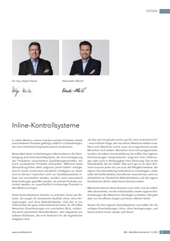 www.cpi-worldwide.com BWI %u2013 BetonWerk International %u2013 5 | 2025 3EDITORIALIn vielen Werken unserer Industrie werden Produkte mittels automatisierter Prozesse gefertigt, vielfach in Umlaufanlagen, die ohne Unterbrechung kontinuierlich produzieren.Bestandteil dieser Umlaufanlagen insbesondere in der Steinfertigung sind Inline-Kontrollsysteme, die ohne Verz%u00f6gerung der Produktion verschiedene Qualit%u00e4tseigenschaften der frisch produzierten Produkte %u00fcberpr%u00fcfen. W%u00e4hrend diese %u00dcberpr%u00fcfung fr%u00fcher allein aufgrund %u201eharter Fakten%u201c erfolgte, kommt heute zunehmend k%u00fcnstliche Intelligenz ins Spiel. Und so k%u00f6nnen inzwischen nicht nur Qualit%u00e4tszust%u00e4nde erfasst und protokolliert werden, sondern auch automatisch Entscheidungen getroffen werden, ob und wie Produkte aussortiert werden, um ausschlie%u00dflich hochwertige Produkte in den Markt zu bringen.Diese Kontrollsysteme arbeiten im wahrsten Sinne wie Roboter. Sie sorgen f%u00fcr konsistente Qualit%u00e4t, inline, ohne Verz%u00f6gerungen und ohne Befindlichkeiten. Und das ist ein Unterschied, der ganz entscheidend sein kann: Zu oft treffen Menschen Entscheidungen mit unscharfem Blick, verblendet durch pers%u00f6nliche Befindlichkeiten, oder abgelenkt von %u00e4u%u00dferen Einfl%u00fcssen, die nicht f%u00f6rderlich f%u00fcr die eigentlichen Aufgaben sind.%u201eIst das, was ich gerade mache, gut f%u00fcr mein Unternehmen?%u201c %u2013 eine einfache Frage, die man keiner Maschine stellen muss. Denn eine Maschine macht, wozu sie programmiert wurde. Menschen sind anders. Menschen sind nicht programmiert, sondern sie haben eine Ausbildung. Sie treffen ihre eigenen Entscheidungen beispielsweise aufgrund ihrer Erfahrungen oder auch in Abh%u00e4ngigkeit ihrer Stimmung. Das ist die Individualit%u00e4t, die wir haben. Was auch gut so ist, aber dennoch muss ein jeder von uns auch die F%u00e4higkeit besitzen, die eigene Grundeinstellung fortlaufend zu hinterfragen. Jeder sollte die Gr%u00f6%u00dfe besitzen, Korrekturen vorzunehmen, wenn es erforderlich ist. Pers%u00f6nliche Befindlichkeiten und die eigene Komfortzone d%u00fcrfen dabei keine Grenzen setzen.Maschinen kennen diese Grenzen auch nicht, und wir sollten alles daransetzen, mit der Individualit%u00e4t unserer eigenen Entscheidungen den Maschinen %u00fcberlegen zu bleiben. Das geht aber nur mit offenen Augen und einem offenen Geist! Nutzen Sie Ihre eigenen Kontrollsysteme und treffen Sie die richtigen Entscheidungen; inline, ohne Verz%u00f6gerungen, und kontinuierlich immer wieder aufs Neue!Dr.-Ing. Holger Karutz Alexander OlbrichInline-Kontrollsysteme