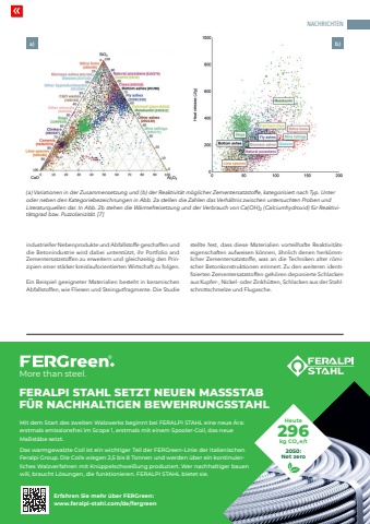 NACHRICHTENwww.cpi-worldwide.com BWI %u2013 BetonWerk International %u2013 5 | 2025 31industrieller Nebenprodukte und Abfallstoffe geschaffen und die Betonindustrie wird dabei unterst%u00fctzt, ihr Portfolio and Zementersatzstoffen zu erweitern und gleichzeitig den Prinzipien einer st%u00e4rker kreislauforientierten Wirtschaft zu folgen.Ein Beispiel geeigneter Materialien besteht in keramischen Abfallstoffen, wie Fliesen und Steingutfragmente. Die Studie stellte fest, dass diese Materialien vorteilhafte Reaktivit%u00e4tseigenschaften aufweisen k%u00f6nnen, %u00e4hnlich denen herk%u00f6mmlicher Zementersatzstoffe, was an die Techniken alter r%u00f6mischer Betonkonstruktionen erinnert. Zu den weiteren identifizierten Zementersatzstoffen geh%u00f6ren deponierte Schlacken aus Kupfer-, Nickel- oder Zinkh%u00fctten, Schlacken aus der Stahlschrottschmelze und Flugasche.(a) Variationen in der Zusammensetzung und (b) der Reaktivit%u00e4t m%u00f6glicher Zementersatzstoffe, kategorisiert nach Typ. Unter oder neben den Kategoriebezeichnungen in Abb. 2a stellen die Zahlen das Verh%u00e4ltnis zwischen untersuchten Proben und Literaturquellen dar. In Abb. 2b stehen die W%u00e4rmefreisetzung und der Verbrauch von Ca(OH)2 (Calciumhydroxid) f%u00fcr Reaktivit%u00e4tsgrad bzw. Puzzolanizit%u00e4t. [7]a) b)More than steel.FERALPI STAHL SETZT NEUEN MASSSTAB F%u00dcR NACHHALTIGEN BEWEHRUNGSSTAHLMit dem Start des zweiten Walzwerks beginnt bei FERALPI STAHL eine neue %u00c4ra: erstmals emissionsfrei im Scope 1, erstmals mit einem Spooler-Coil, das neue Ma%u00dfst%u00e4be setzt.Das warmgewalzte Coil ist ein wichtiger Teil der FERGreen-Linie der italienischen Feralpi Group. Die Coils wiegen 2,5 bis 8 Tonnen und werden %u00fcber ein kontinuierliches Walzverfahren mit Kn%u00fcppelschwei%u00dfung produziert. Wer nachhaltiger bauen will, braucht L%u00f6sungen, die funktionieren. FERALPI STAHL bietet sie.Erfahren Sie mehr %u00fcber FERGreen: www.feralpi-stahl.com/de/fergreenHeute296kg CO2e/t2050:Net zero