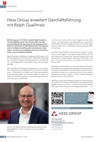 NACHRICHTEN36 BWI %u2013 BetonWerk International %u2013 5 | 2025 www.cpi-worldwide.comMit Wirkung zum 01.07.2025 verst%u00e4rkt Ralph Quellmalz die Gesch%u00e4ftsf%u00fchrung der Hess Group GmbH und %u00fcbernimmt k%u00fcnftig die Verantwortung f%u00fcr alle kaufm%u00e4nnischen Bereiche. Gemeinsam mit dem bestehenden F%u00fchrungsteam wird er die Weiterentwicklung des Unternehmens mitgestalten %u2013 mit Fokus auf strategische Steuerung, Finanztransparenz und wirtschaftliche Stabilit%u00e4t. Ralph Quellmalz verf%u00fcgt %u00fcber langj%u00e4hrige Erfahrung als CFO auf Leitungsebene in verschiedenen mittelst%u00e4ndisch gepr%u00e4gten, international t%u00e4tigen Industrieunternehmen des Maschinen- und Anlagenbau mit speziellem Fokus auf das Projektgesch%u00e4ft. Sein beruflicher Werdegang ist gepr%u00e4gt von der erfolgreichen Begleitung unternehmerischer Transformationsprozesse %u2013 insbesondere im Hinblick auf Organisationsentwicklung, Reporting, Risiko- und Finanzmanagement. Dabei versteht er es, komplexe Strukturen zu durchdringen und praxisnahe L%u00f6sungen zu etablieren. %u201eIch freue mich sehr auf die neue Aufgabe bei der HESS Group %u2013 ein Unternehmen mit starken Wurzeln, einer klaren Ausrichtung und einem engagierten Team. Ich bin %u00fcberzeugt: Zukunft entsteht dort, wo Strategie auf Zusammenarbeit trifft%u201c, so Quellmalz. Die Hess Group GmbH ist ein f%u00fchrender Anbieter von Maschinen und Anlagen f%u00fcr die Betonsteinproduktion. Als Teil der international agierenden Topwerk-Gruppe liefert das Unternehmen technologische L%u00f6sungen f%u00fcr Kunden weltweit %u2013 mit einem klaren Fokus auf Qualit%u00e4t, Innovation und Kundenn%u00e4he. %u201eMit Ralph Quellmalz gewinnen wir eine erfahrene F%u00fchrungspers%u00f6nlichkeit mit umfassender kaufm%u00e4nnischer Expertise. Er bringt das richtige Ma%u00df an Klarheit, Erfahrung und unternehmerischem Denken mit, um gemeinsam mit uns die n%u00e4chsten Entwicklungsschritte zu gehen%u201c, so Oliver Rauter, Managing Director der Hess Group GmbH. Mit dieser personellen Verst%u00e4rkung stellt sich die Hess Group noch breiter auf, um den Anforderungen eines dynamischen Marktes gerecht zu werden %u2013 mit klarer Ausrichtung, starker F%u00fchrung und dem Fokus auf nachhaltiges Wachstum. nHess Group erweitert Gesch%u00e4ftsf%u00fchrung mit Ralph Quellmalz Hess Group GmbH, 57299 Burbach-Wahlbach, Deutschland WEITERE INFORMATIONENHESS Group GmbH Freier-Grund-Stra%u00dfe 123 57299 Burbach-Wahlbach, Deutschland T +49 2736 4976 0info@hessgroup.comwww.hessgroup.comDie HESS GROUP erm%u00f6glicht allen Lesern der BWI den kostenlosen Download dieses Artikels im pdf-Format. Besuchen Sie die Webseite www.cpi-worldwide.com/channels/topwerk oder scannen Sie den QR-Code mit Ihrem Smartphone ein, um direkt auf diese Webseite zu gelangen.Zum 01. Juli 2025 tritt Ralph Quellmalz als kaufm%u00e4nnischer Gesch%u00e4ftsf%u00fchrer / CFO in die F%u00fchrung der Hess Group GmbH ein.