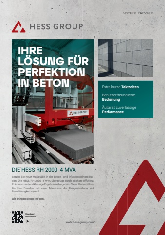www.hessgroup.comIHREL%u00d6SUNG F%u00dcRPERFEKTIONIN BETON Extra kurze TaktzeitenBenutzerfreundlicheBedienung%u00c4u%u00dferst zuverl%u00e4ssige PerformanceSetzen Sie neue Ma%u00dfst%u00e4be in der Beton- und Pflastersteinproduktion. Die HESS RH 2000-4 MVA %u00fcberzeugt durch h%u00f6chste Effi zienz, Pr%u00e4zision und erstklassige Ergebnisse bei jedem Stein. Unterst%u00fctzenSie Ihre Projekte mit einer Maschine, die Spitzenleistung undZuverl%u00e4ssigkeit vereint.Wir bringen Beton in Form. DIE HESS RH 2000-4 MVADownloadBrosch%u00fcren