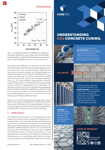 BETONTECHNOLOGIEwww.cpi-worldwide.com BWI %u2013 BetonWerk International %u2013 5 | 2025Der Einfluss des Gr%u00f6%u00dftkorns und demnach der unterschiedliche Wasserbedarf der Kornzusammensetzungen kann somit eliminiert werden. Der zuvor beschriebene gro%u00dfe Streubereich wird so deutlich reduziert, da die Eigenschaften der Gesteinsk%u00f6rnung in dem ermittelten Wassergehalt Vw,flowintegral ber%u00fccksichtigt sind. Die resultierende Konsistenz des Frischbetons kann anhand des ermittelten Wassergehalts Vw,flow f%u00fcr unterschiedliche Ausgangstoffe und Betonzusammensetzungen im 3-Stoff-System sehr gut abgesch%u00e4tzt werden. Anhand der Eigenschaften der verwendeten Gesteinsk%u00f6rnung kann so auf das erforderliche Zugabewasser f%u00fcr eine bestimmte Konsistenz geschlossen werden. So wird f%u00fcr eine weiche Konsistenz mit einem Ausbreitma%u00df von 45 cm ein Wassergehalt Vw,flow von ca. 115 l/m%u00b3, der f%u00fcr die Verfl%u00fcssigung zur Verf%u00fcgung steht, ben%u00f6tigt. Bei den zuvor beschriebenen Betrachtungen gilt es zu beachten, dass diese ausschlie%u00dflich f%u00fcr das klassische 3-StoffSystem bzw. 4-Stoff-System (inkl. Zusatzstoff) gelten. Die heutzutage g%u00e4ngige Verwendung verfl%u00fcssigender Zusatzmittel zur Einstellung der Konsistenz ist dort nicht ber%u00fccksichtigt. 4 %u201eNullkonsistenz%u201cZur Einstellung der Konsistenz mit verfl%u00fcssigenden Zusatzmitteln ist ein ausreichender Leimgehalt im Frischbeton notwendig. Thielen et al. [14] zeigten bereits, dass Frischbetone nur bei einem ausreichenden Leimgehalt zur vollst%u00e4ndigen F%u00fcllung des Hohlraumgehaltes der Gesteinsk%u00f6rnung mit Zusatzmitteln verfl%u00fcssigt werden k%u00f6nnen. Nur so wirkt die Reduzierung des Scherwidertands des Leims und erm%u00f6glicht eine Verschiebung der einzelnen Gesteinsk%u00f6rner. Ist nicht gen%u00fcgend Leim vorhanden und die Hohlr%u00e4ume zwischen den Gesteinsk%u00f6rnern nicht vollst%u00e4ndig gef%u00fcllt, f%u00fchrt eine Steigerung des Gehalts an verfl%u00fcssigenden Zusatzmitteln zu keiner Abb. 3: Zur Verfl%u00fcssigung des Frischbetons zur Verf%u00fcgung stehendes Wasser (Vw,flow) als Funktion des resultierenden Ausbreitma%u00dfes f%u00fcr unterschiedliche Betonzusammensetzungen mit einem Gr%u00f6%u00dftkorn von 8 mm, 16 mm und 32 mmUNDERSTANDINGCO2 CONCRETE CURING.CO2-READYMADE IN GERMANY.Besuchen Sie uns online!Das Betonh%u00e4rtungssystem CureComplete beschleunigt den Aush%u00e4rtungsprozess mittels kontrollierter Zugabe von W%u00e4rme und Feuchtigkeit und schaff t ein optimales Klima f%u00fcr die jeweiligen Betonprodukte.Curetec entwirft, produziert und installiert alle Arten von Aush%u00e4rteregale f%u00fcr Hohlblock-, Pfl asterstein- und Betonplattenwerke, abgestimmt auf die Bed%u00fcrfnisse und M%u00f6glichkeiten des Kunden. Innovative Details und Produktionsmethoden machen unsere Aush%u00e4rteregale einzigartig.%u201eTurnkey%u201c als schl%u00fcsselfertiges System, inklusive Lieferung zum Kunden vor Ort und Vollmontage der Anlagen.