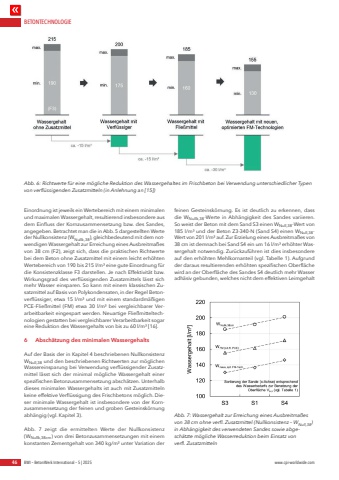 BETONTECHNOLOGIE46 BWI %u2013 BetonWerk International %u2013 5 | 2025 www.cpi-worldwide.comEinordnung ist jeweils ein Wertebereich mit einem minimalen und maximalen Wassergehalt, resultierend insbesondere aus dem Einfluss der Kornzusammensetzung bzw. des Sandes, angegeben. Betrachtet man die in Abb. 5 dargestellten Werte der Nullkonsistenz (WNullk,38), gleichbedeutend mit dem notwendigen Wassergehalt zur Erreichung eines Ausbreitma%u00dfes von 38 cm (F2), zeigt sich, dass die praktischen Richtwerte bei dem Beton ohne Zusatzmittel mit einem leicht erh%u00f6hten Wertebereich von 190 bis 215 l/m%u00b3 eine gute Einordnung f%u00fcr die Konsistenzklasse F3 darstellen. Je nach Effektivit%u00e4t bzw. Wirkungsgrad des verfl%u00fcssigenden Zusatzmittels l%u00e4sst sich mehr Wasser einsparen. So kann mit einem klassischen Zusatzmittel auf Basis von Polykondensaten, in der Regel Betonverfl%u00fcssiger, etwa 15 l/m%u00b3 und mit einem standardm%u00e4%u00dfigen PCE-Flie%u00dfmittel (FM) etwa 30 l/m%u00b3 bei vergleichbarer Verarbeitbarkeit eingespart werden. Neuartige Flie%u00dfmitteltechnologien gestatten bei vergleichbarer Verarbeitbarkeit sogar eine Reduktion des Wassergehalts von bis zu 60 l/m%u00b3 [16]. 6 Absch%u00e4tzung des minimalen WassergehaltsAuf der Basis der in Kapitel 4 beschriebenen Nullkonsistenz WNull,38 und den beschriebenen Richtwerten zur m%u00f6glichen Wassereinsparung bei Verwendung verfl%u00fcssigender Zusatzmittel l%u00e4sst sich der minimal m%u00f6gliche Wassergehalt einer spezifischen Betonzusammensetzung absch%u00e4tzen. Unterhalb dieses minimalen Wassergehalts ist auch mit Zusatzmitteln keine effektive Verfl%u00fcssigung des Frischbetons m%u00f6glich. Dieser minimale Wassergehalt ist insbesondere von der Kornzusammensetzung der feinen und groben Gesteinsk%u00f6rnung abh%u00e4ngig (vgl. Kapitel 3). Abb. 7 zeigt die ermittelten Werte der Nullkonsistenz (WNullk,38cm) von drei Betonzusammensetzungen mit einem konstanten Zementgehalt von 340 kg/m%u00b3 unter Variation der feinen Gesteinsk%u00f6rnung. Es ist deutlich zu erkennen, dass die WNullk,38-Werte in Abh%u00e4ngigkeit des Sandes variieren. So weist der Beton mit dem Sand S3 einen WNull,38-Wert von 185 l/m%u00b3 und der Beton Z3-340-N (Sand S4) einen WNull,38-Wert von 201 l/m%u00b3 auf. Zur Erzielung eines Ausbreitma%u00dfes von 38 cm ist demnach bei Sand S4 ein um 16 l/m%u00b3 erh%u00f6hter Wassergehalt notwendig. Zur%u00fcckzuf%u00fchren ist dies insbesondere auf den erh%u00f6hten Mehlkornanteil (vgl. Tabelle 1). Aufgrund der daraus resultierenden erh%u00f6hten spezifischen Oberfl%u00e4che wird an der Oberfl%u00e4che des Sandes S4 deutlich mehr Wasser adh%u00e4siv gebunden, welches nicht dem effektiven Leimgehalt Abb. 6: Richtwerte f%u00fcr eine m%u00f6gliche Reduktion des Wassergehaltes im Frischbeton bei Verwendung unterschiedlicher Typen von verfl%u00fcssigenden Zusatzmitteln (in Anlehnung an [15])Abb. 7: Wassergehalt zur Erreichung eines Ausbreitma%u00dfes von 38 cm ohne verfl. Zusatzmittel (Nullkonsistenz %u2013 WNull,38) in Abh%u00e4ngigkeit des verwendeten Sandes sowie abgesch%u00e4tzte m%u00f6gliche Wasserreduktion beim Einsatz von verfl. Zusatzmitteln