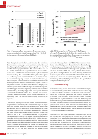 BETONTECHNOLOGIE48 BWI %u2013 BetonWerk International %u2013 5 | 2025 www.cpi-worldwide.comAbb. 9 zeigt die ermittelten Ausbreitma%u00dfe der einzelnen Betonzusammensetzungen unter Variation des Sandes und des Wassergehaltes. Mit einem Wassergehalt von 176 l/m%u00b3 konnte unabh%u00e4ngig des Sandes die Zielkonsistenz von 52 %u00b1 3 cm bei allen Betonen eingestellt werden. Bei einer Wasserreduktion auf 162 l/m%u00b3 war eine Einstellung der Konsistenz bei Verwendung des Sandes S4 nicht m%u00f6glich. Die Zugabe von verfl%u00fcssigenden Zusatzmitteln f%u00fchrte zu keiner ausreichenden Verfl%u00fcssigung, sondern zu starken Entmischungserscheinungen. Dies konnte auch bei weiterer Reduktion des Wassergehalts auf 146 l/m%u00b3 unter Verwendung des Sandes S1 festgestellt werden. Zur%u00fcckzuf%u00fchren ist dies auf die physikalischen Eigenschaften der Mischungszusammensetzung (systemabh%u00e4ngiger Mindestleimgehalt) und einer resultierenden %u00dcberschreitung des S%u00e4ttigungspunkts. Die Eigenschaften der unterschiedlichen Sande f%u00fchren dazu, dass bei dem entsprechenden Wassergehalt kein ausreichender Leimgehalt zur Verf%u00fcgung steht, der f%u00fcr eine Verfl%u00fcssigung notwendig ist (vgl. [6]). Ordnet man die Ergebnisse den in Abb. 7 ermittelten Wassergehalten zu, kann eine gute %u00dcbereinstimmung zum abgesch%u00e4tzten minimal erforderlichen Wassergehalt beobachtet werden (vgl. Abb. 10). Betone mit einem Wassergehalt oberhalb des abgesch%u00e4tzten minimalen Wassergehalts konnten alle zielsicher mit verfl%u00fcssigenden Zusatzmitteln auf ein Ausbreitma%u00df von 52 %u00b1 3 cm eingestellt werden. Dagegen war bei den Betonen unterhalb des abgesch%u00e4tzten Wassergehalts (roter Bereich) mit den Sanden S1 und S4 infolge des systemabh%u00e4ngigen Mindestleimgehalts und der resultierenden %u00dcberschreitung des S%u00e4ttigungspunktes keine Verfl%u00fcssigung m%u00f6glich (dunkel gef%u00fcllte Symbole in Abb. 10). Einzige Ausnahme stellt dabei der Beton mit Sand S3 und einem Wassergehalt von 147 l/m%u00b3 dar. Auch unterhalb des abgesch%u00e4tzten minimalen Wassergehaltes von 155 l/m%u00b3 konnte dieser Frischbeton mit verfl%u00fcssigendem Zusatzmittel ohne Entmischungserscheinungen verfl%u00fcssigt und die Zielkonsistenz von 52 %u00b1 3 cm zielsicher erreicht werden (vgl. wei%u00df gef%u00fclltes Symbol im roten Bereich in Abb. 10). Dabei gilt es zu ber%u00fccksichtigen, dass der abgesch%u00e4tzte minimale Wassergehalt keinen Grenzwert, sondern nur einen Richtwert darstellt und demnach auch unterhalb dieses Wassergehaltes durchaus die Herstellung stabiler flie%u00dff%u00e4higer Betone mit den spezifischen Ausgangsstoffen m%u00f6glich ist. 7 Zusammenfassung In diesem Beitrag wurde der Einfluss unterschiedlicher granulometrischer Eigenschaften der feinen Gesteinsk%u00f6rnung auf die Verarbeitbarkeit bzw. den Wasserbedarf von Frischbeton auf Grundlage systematischer Untersuchungen beschrieben und diskutiert. Dazu wurden neben %u00fcblichen physikalischen Eigenschaften auch der zur Benetzung der Gesteinsk%u00f6rnungsoberfl%u00e4che ben%u00f6tigte Wasserbedarf experimentell ermittelt. Die experimentell ermittelten Werte zeigen deutlich, dass vor allem die Kornzusammensetzung der Gesteinsk%u00f6rnung entscheidend f%u00fcr die Verarbeitbarkeit bzw. die Konsistenz bei konstantem Wassergehalt im klassischen 3-Stoff-System des Frischbetons ist. Aufbauend auf den experimentellen Untersuchungen wurde ein Konzept zur Absch%u00e4tzung des minimal m%u00f6glichen Wassergehalts einer spezifischen Betonzusammensetzung unter Ber%u00fccksichtigung der Zugabe verfl%u00fcssigender Zusatzmittel entwickelt. Zur Einstellung der Konsistenz mit verfl%u00fcssigenden Zusatzmitteln ist ein ausreichender Leimgehalt im Frischbeton notwendig. Ist nicht gen%u00fcgend Leim vorhanden und sind die Hohlr%u00e4ume zwischen den Gesteinsk%u00f6rnern nicht vollAbb. 9: Ausbreitma%u00df der untersuchten Betonzusammensetzungen unter Variation des Wassergehaltes (176-147 l/m%u00b3) bei konstantem Zementgehalt von 360 kg/m%u00b3Abb. 10: Wassergehalt im Frischbeton (3-Stoff-System %u2013 ohne verfl. Zusatzmittel) als Funktion des resultierenden Ausbreitma%u00dfes f%u00fcr unterschiedliche Betonzusammensetzungen zur Ermittlung der %u201eNullkonsistenz%u201c (WNullk,38cm)