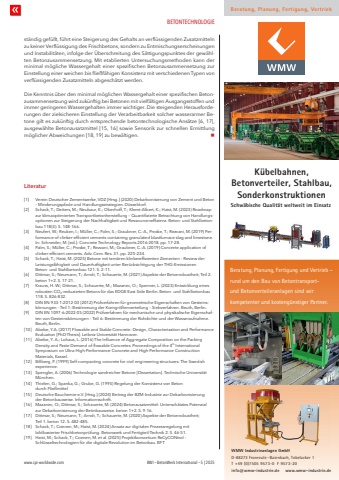 BETONTECHNOLOGIEwww.cpi-worldwide.com BWI %u2013 BetonWerk International %u2013 5 | 2025st%u00e4ndig gef%u00fcllt, f%u00fchrt eine Steigerung des Gehalts an verfl%u00fcssigenden Zusatzmitteln zu keiner Verfl%u00fcssigung des Frischbetons, sondern zu Entmischungserscheinungen und Instabilit%u00e4ten, infolge der %u00dcberschreitung des S%u00e4ttigungspunktes der gew%u00e4hlten Betonzusammensetzung. Mit etablierten Untersuchungsmethoden kann der minimal m%u00f6gliche Wassergehalt einer spezifischen Betonzusammensetzung zur Einstellung einer weichen bis flie%u00dff%u00e4higen Konsistenz mit verschiedenen Typen von verfl%u00fcssigenden Zusatzmitteln abgesch%u00e4tzt werden.Die Kenntnis %u00fcber den minimal m%u00f6glichen Wassergehalt einer spezifischen Betonzusammensetzung wird zuk%u00fcnftig bei Betonen mit vielf%u00e4ltigen Ausgangsstoffen und immer geringeren Wassergehalten immer wichtiger. Die steigenden Herausforderungen der zielsicheren Einstellung der Verarbeitbarkeit solcher wasserarmer Betone gilt es zuk%u00fcnftig durch entsprechende betontechnologische Ans%u00e4tze [6, 17], ausgew%u00e4hlte Betonzusatzmittel [15, 16] sowie Sensorik zur schnellen Ermittlung m%u00f6glicher Abweichungen [18, 19] zu bew%u00e4ltigen. nLiteratur[1] Verein Deutscher Zementwerke, VDZ [Hrsg.] (2020) Dekarbonisierung von Zement und Beton %u2013 Minderungspfade und Handlungsstrategien. D%u00fcsseldorf.[2] Schack, T.; Deiters, M.; Neubaur, K.; Oberhoff, T.; Klemt-Albert, K.; Haist, M. (2023) Roadmap zur klimaoptimierten Transportbetonherstellung %u2013 Quantifizierte Betrachtung von Handlungsoptionen zur Steigerung der Nachhaltigkeit und Ressourceneffizienz. Beton- und Stahlbetonbau 118(3). S. 148-166.[3] Neufert, W.; Reuken, I.; M%u00fcller, C.; Palm, S.; Graubner, C.-A., Proske, T.; Rezvani, M. (2019) Performance of clinker-efficient cements containing granulated blastfurnace slag and limestone. In: Schneider, M. [ed.]: Concrete Technology Reports 2016-2018. pp. 17-28.[4] Palm, S.; M%u00fcller, C.; Proske, T.; Rezvani, M.; Graubner, C.-A. (2019) Concrete application of clinker-efficient cements. Adv. Cem. Res. 31. pp. 225%u2013234.[5] Schack, T.; Haist, M. (2025) Betone mit tern%u00e4ren klinkereffizienten Zementen %u2013 Review der Leistungsf%u00e4higkeit und Dauerhaftigkeit unter Ber%u00fccksichtigung der THG-Emissionen. Beton- und Stahlbetonbau 121. S. 2-11.[6] Dittmar, S.; Neumann, T.; Arndt, T.; Schauerte, M. (2021) Aspekte der Betonrobustheit; Teil 2. beton 1+2. S. 17-21.[7] Krauss, H.-W.; Dittmar, S.; Schauerte, M.; Mazanec, O.; Spenner, L. (2023) Entwicklung eines robusten CO2-reduzierten Betons f%u00fcr das EDGE East Side Berlin. Beton- und Stahlbetonbau 118. S. 826-832.[8] DIN EN 933-1:2012-03 (2012) Pr%u00fcfverfahren f%u00fcr geometrische Eigenschaften von Gesteinsk%u00f6rnungen %u2013 Teil 1: Bestimmung der Korngr%u00f6%u00dfenverteilung %u2013 Siebverfahren. Beuth, Berlin.[9] DIN EN 1097-6:2022-05 (2022) Pr%u00fcfverfahren f%u00fcr mechanische und physikalische Eigenschaften von Gesteinsk%u00f6rnungen %u2013 Teil 6: Bestimmung der Rohdichte und der Wasseraufnahme. Beuth, Berlin.[10] Abebe, Y.A. (2017) Flowable and Stable Concrete: Design, Characterization and Performance Evaluation [PhD-Thesis]. Leibniz Universit%u00e4t Hannover.[11] Abebe, Y. A.; Lohaus, L. (2016) The Influence of Aggregate Composition on the Packing Density and Paste Demand of flowable Concretes. Proceedings of the 4th International Symposium on Ultra-High-Performance Concrete and High-Performance ConstructionMaterials, Kassel.[12] Billberg, P. (1999) Self-compacting concrete for civil engineering structures. The Swedish experience.[13] Spengler, A. (2006) Technologie sandreicher Betone [Dissertation]. Technische Universit%u00e4t M%u00fcnchen. [14] Thielen, G.; Spanka, G.; Grube, G. (1995) Regelung der Konsistenz von Beton durch Flie%u00dfmittel[15] Deutsche Bauchemie e.V. [Hrsg.] (2024) Beitrag der BZM-Industrie zur Dekarbonisierung der Betonbauweise. Informationsschrift. [16] Mazanec, O.; Dittmar, S.; Schauerte, M. (2024) Betonzusatzmittel: Untersch%u00e4tztes Potenzial zur Dekarbonisierung der Betinbauweise. beton 1+2. S. 9-16.[17] Dittmar, S.; Neumann, T.; Arndt, T.; Schauerte, M. (2020) Aspekte der Betonrobustheit; Teil 1. beton 12. S. 482-485.[18] Schack, T.; Coenen, M.; Haist, M. (2024) Ansatz zur digitalen Prozessregelung mit bildbasierter Frischbetonpr%u00fcfung. Betonwerk und Fertigteil-Technik 2. S. 46-51.[19] Haist, M.; Schack, T.; Coenen, M. et al. (2025) Projektkonsortium ReCyCONtrol %u2013 Schl%u00fcsseltechnologien f%u00fcr die digitale Revolution im Betonbau. BFTBeratung, Planung, Fertigung und Vertrieb %u2013rund um den Bau von Betontransportund Betonverteileranlagen sind wirkompetenter und kosteng%u00fcnstiger Partner.Schw%u00e4bische Qualit%u00e4t weltweit im EinsatzWMW Industrieanlagen GmbHD-88273 Fronreute-Baienbach, Tobelacker 1T +49 (0)7505 9573-0 F 9573-20info@wmw-industrie.de www.wmw-industrie.deK%u00fcbelbahnen,Betonverteiler, Stahlbau,SonderkonstruktionenBeratung, Planung, Fertigung, VertriebCMYCMMYCYCMYK