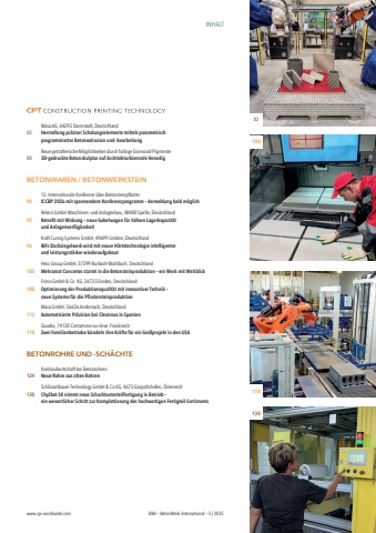 INHALTWasa AG, 64293 Darmstadt, Deutschland 82%u0009 Herstellung pr%u00e4ziser Schalungselemente mittels parametrischprogrammierter Betonextrusion und -bearbeitungNeue gestalterische M%u00f6glichkeiten durch farbige Eisenoxid-Pigmente 88 3D-gedruckte Betonskulptur auf Architekturbiennale VenedigBETONWAREN / BETONWERKSTEIN13. Internationale Konferenz %u00fcber Betonsteinpflaster90%u0009 ICCBP 2026 mit spannendem Konferenzprogramm %u2013 Anmeldung bald m%u00f6glichRekers GmbH Maschinen- und Anlagenbau, 48480 Spelle, Deutschland 92%u0009 Retrofit mit Wirkung %u2013 neue Gabelwagen f%u00fcr h%u00f6here Lagerkapazit%u00e4tund Anlagenverf%u00fcgbarkeitKraft Curing Systems GmbH, 49699 Lindern, Deutschland96%u0009 IBFs Dachziegelwerk wird mit neuer H%u00e4rtetechnologie intelligenterund leistungsst%u00e4rker wiederaufgebautHess Group GmbH, 57299 Burbach-Wahlbach, Deutschland102%u0009 Mehramat Concretes startet in die Betonsteinproduktion %u2013 ein Werk mit WeitblickFrima GmbH & Co. KG, 26723 Emden, Deutschland108%u0009 Optimierung der Produktionsqualit%u00e4t mit innovativer Technik %u2013neue Systeme f%u00fcr die PflastersteinproduktionMasa GmbH, 56626 Andernach, Deutschland 112%u0009 Automatisierte Pr%u00e4zision bei Cleannox in SpanienQuadra, 74130 Contamine-sur-Arve, Frankreich118%u0009 Zwei Familienbetriebe b%u00fcndeln ihre Kr%u00e4fte f%u00fcr ein Gro%u00dfprojekt in den USABETONROHRE UND -SCH%u00c4CHTEKreislaufwirtschaft bei Betonrohren124 Neue Rohre aus alten RohrenSchl%u00fcsselbauer Technology GmbH & Co KG, 4673 Gaspoltshofen, %u00d6sterreich130%u0009 Chy%u017ebet SK nimmt neue Schachtunterteilfertigung in Betrieb %u2013ein wesentlicher Schritt zur Komplettierung des hochwertigen Fertigteil-Sortiments82108www.cpi-worldwide.com BWI %u2013 BetonWerk International %u2013 5 | 2025118130