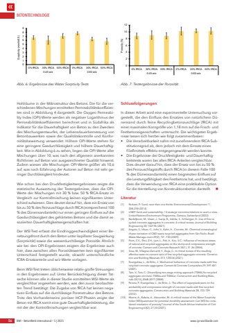 BETONTECHNOLOGIE56 BWI %u2013 BetonWerk International %u2013 5 | 2025 www.cpi-worldwide.comHohlr%u00e4ume in der Mikrostruktur des Betons. Die f%u00fcr die verschiedenen Mischungen ermittelten Permeabilit%u00e4tskoeffizienten sind in Abbildung 4 dargestellt. Die Oxygen Permeability Index (OPI)-Werte werden als negativer Logarithmus der Permeabilit%u00e4tskoeffizienten berechnet und in S%u00fcdafrika als Indikator f%u00fcr die Dauerhaftigkeit von Beton zu den Zwecken des Mischungsentwurfes, der Lebensdauerbemessung von Betonbauwerken sowie der Qualit%u00e4tskontrolle und Konformit%u00e4tsbewertung verwendet. H%u00f6here OPI-Werte stehen f%u00fcr eine geringere Gasdurchl%u00e4ssigkeit und h%u00f6here Dauerhaftigkeit. Wie in Abbildung 6 zu sehen, liegen die OPI-Werte aller Mischungen %u00fcber 10, was nach den allgemein anerkannten Richtlinien auf Beton von ausgezeichneter Qualit%u00e4t hinweist. Zudem wiesen alle Mischungen OPI-Werte gr%u00f6%u00dfer als 10,6 auf, was nach Erfahrung der Autoren auf Beton mit sehr geringer Durchl%u00e4ssigkeit hindeutet.Wie schon bei den Druckfestigkeitsergebnissen zeigte die statistische Auswertung der Testergebnisse, dass die OPIWerte der Mischungen mit 30 % bzw. 50 % fRCA-Ersatz im Vergleich zur Kontrollmischung keinen signifikanten Unterschied aufwiesen. Dies deutet darauf hin, dass ein Ersatz von bis zu 50 % des Feinzuschlags durch fRCA (entsprechend 100 % des D%u00fcnensandanteils) nur einen geringen Einfluss auf die Gasdurchl%u00e4ssigkeit des geh%u00e4rteten Betons und die damit assoziierten Dauerhaftigkeitseigenschaften hat. Der WSI-Test erfasst die Eindringgeschwindigkeit einer Benetzungsfront durch den Beton unter kapillarer Saugwirkung (Sorptivit%u00e4t) sowie die wasserdurchl%u00e4ssige Porosit%u00e4t. %u00c4hnlich wie bei den OPI-Ergebnissen zeigten die Ergebnisse auch hier, dass zwischen allen Porosit%u00e4tswerten kein signifikanter Unterschied festgestellt wurde, obwohl unterschiedliche fCRA-Ersatzanteile und w/z-Werte vorlagen. Beim WSI-Test treten %u00fcblicherweise relativ gro%u00dfe Streuungen in den Ergebnissen auf. Unter Ber%u00fccksichtigung dieser Tatsache k%u00f6nnen alle in dieser Studie ermittelten WSI-Werte als vergleichbar angesehen werden, was den zuvor beobachteten Trend best%u00e4tigt: Die Zugabe von fRCA hat keinen negativen Einfluss auf die durchl%u00e4ssige Porenstruktur des Betons. Trotz des Vorhandenseins por%u00f6ser HCP-Phasen zeigte der Beton mit fRCA somit eine gute Dauerhaftigkeitsleistung, die mit der der Kontrollmischungen vergleichbar war.Schlussfolgerungen In dieser Arbeit wird eine experimentelle Untersuchung vorgestellt, die den Einfluss des Ersatzes von nat%u00fcrlichem D%u00fcnensand durch feine Recyclingbetonzuschl%u00e4ge (fRCA) mit einer maximalen Korngr%u00f6%u00dfe von 1,18 mm auf die Frisch- und Festbetoneigenschaften untersucht. Die wichtigsten Ergebnisse lassen sich hierbei wie folgt zusammenfassen:%u2022 Die Verarbeitbarkeit nahm mit zunehmendem fRCA-Substitutionsgrad ab, dem jedoch mit dem Einsatz eines Flie%u00dfmittels effektiv entgegengewirkt werden konnte. %u2022 Die Ergebnisse der Druckfestigkeits- und Dauerhaftigkeitstests waren bei allen fRCA-Anteilen vergleichbar. Dies deutet darauf hin, dass der Ersatz von bis zu 50 % des Feinzuschlagstoffs durch fRCA (in diesem Falle 100 % des D%u00fcnensandanteils) einen begrenzten Einfluss auf die Leistungsf%u00e4higkeit des Festbetons hat, und best%u00e4tigt, dass die Verwendung von fRCA eine praktikable Option f%u00fcr die Herstellung von Konstruktionsbeton darstellt. nLiteratur[1] Peduzzi, P.: Sand, rarer than one thinks. Environmental Development 11, 208-218 (2014).[2] UNEP. Sand and sustainability: 10 strategic recommendations to avert a crisis. United Nations Environment Programme, Geneva, Switzerland (2022). [3] Nedeljkovic, M., Visser, J., Savija, B., Valcke, S., Schlangen, E.: Use of fine recycled concrete aggregates in concrete: A critical review. Journal of Building Engineering 38, 102196 (2021).[4] Angulo, S., Ulsen, C., John, V., Kahn, H., Cincotto, M.: Chemical-mineralogical charac-terization of C&D waste recycled aggregates from S%u00e3o Paulo, Brazil. Waste Manage-ment 29(2), 721-730 (2009).[5] Poon, C.S., Shui, Z.H., Lam, L., Fok, H., Kou, S.C.: Influence of moisture states of natural and recycled aggregates on the slump and compressive strength of concrete. Cement and Concrete Research 34(1), 31-36 (2004).[6] Sosa, M., Villagran Zaccardi, Y., Zega, C.: A critical review of the resulting effective water-to-cement ratio of fine recycled aggregate concrete. Construction and Building Materials 313, 125536 (2021).[7] Evangelista, L., de Brito, J.: Mechanical behaviour of concrete made with fine recycled concrete aggregates. Cement & Concrete Composites 29, 397-401 (2007).[8] Tam, V., Tam, C.: Diversifying two-stage mixing approach (TSMA) for recycled aggregate concrete: TSMAs and TSMAsc. Construction and Building Materials 22(10), 2068-2077 (2008). [9] Pereira, P., Evangelista, L., de Brito, J.: The effect of superplasticizers on the workability and compressive strength of concrete made with fine recycled concrete aggregates. Construction and Building Materials 28, 722-729 (2012).[10] Moore, A., Bakera, A., Alexander, M.: A critical review of the Water Sorptivity Index (WSI)parameter for potential durability assessment: Can WSI be considered inisolation of porosity? Journal of the South African Institution of Civil Engineering 63(2), 27-34 (2021).fifffflffifl%u001a%u0019%u0018%u0017%u0016fi%u0015%u0014%u0013%u0012%u0011%u0010 ffifi%u0015%u0014%u0013%u0012%u0011%u0010 %u001afi%u0015%u0014%u0013%u0012%u0011%u0010 fi%u0015%u0014%u0013%u0012%u0011%u0010 ffifi%u0015%u0014%u0013%u0012%u0011%u0010 %u001afi%u0015%u0014%u0013%u0012%u0011%u0010fi%u000ffl%u001a%u0014%u000e%u000c fi%u000f%u0019fi%u0014%u000e%u000c%u000b%u0009%u0008%u0007%u0006%u0005%u0006%u0007%u0004%u0014%u0003%u0001%u0009fi%u000f%u001a%u0014fifffflffifl%u001afi%u001afffi%u0019%u0018