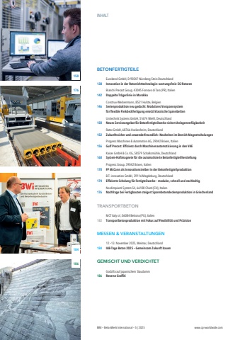 INHALT150176BETONFERTIGTEILEEurobend GmbH, D-90547 N%u00fcrnberg-Stein Deutschland138%u0009 Innovation in der Rotorrichttechnologie: wartungsfreie 5G-RotorenBianchi Precast Group, 43045 Fornovo di Taro (PR), Italien142 Doppelte Tr%u00e4gerlinie in MarokkoConstrux-Weckenmann, 8531 Hulste, Belgien146%u0009 Serienproduktion neu gedacht: Modulares Vorspannsystemf%u00fcr flexible Parkdeckfertigung ersetzt klassische SpannbettenUnitechnik Systems GmbH, 51674 Wiehl, Deutschland150 Neues Serviceangebot f%u00fcr Betonfertigteilwerke sichert Anlagenverf%u00fcgbarkeitRatec GmbH, 68766 Hockenheim, Deutschland 152%u0009 Zukunftssicher und anwenderfreundlich: Neuheiten im Bereich MagnetschalungenProgress Maschinen & Automation AG, 39042 Brixen, Italien156%u0009 Gulf Precast: Effizienz durch Maschinenautomatisierung in den VAEKaiser GmbH & Co. KG, 58579 Schalksm%u00fchle, Deutschland160%u0009 System-Haftmagnete f%u00fcr die automatisierte BetonfertigteilherstellungProgress Group, 39042 Brixen, Italien170 FP McCann als Innovationstreiber in der BetonfertigteilproduktionB.T. innovation GmbH, 39116 Magdeburg, Deutschland174%u0009 Effiziente Schalung f%u00fcr Fertigteilwerke %u2013 modular, schnell und nachhaltigNordimpianti System Srl, 66100 Chieti (CH), Italien176 Nachfrage bei Fertigbauten steigert Spannbetondeckenproduktion in GriechenlandTRANSPORTBETONMCT Italy srl, 06084 Bettona (PG), Italien182%u0009 Transportbetonproduktion mit Fokus auf Flexibilit%u00e4t und Pr%u00e4zisionMESSEN & VERANSTALTUNGEN12.%u201313. November 2025, Weimar, Deutschland184%u0009 IAB-Tage Beton 2025 %u2013 Gemeinsam Zukunft bauenGEMISCHT UND VERDICHTETGodzilla auf japanischem Staudamm 186%u0009 Reverse GraffitiBWI %u2013 BetonWerk International %u2013 5 | 2025 www.cpi-worldwide.com186184