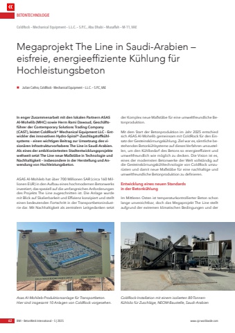 BETONTECHNOLOGIE62 BWI %u2013 BetonWerk International %u2013 5 | 2025 www.cpi-worldwide.comIn enger Zusammenarbeit mit den lokalen Partnern ASAS Al-Mohelib (MHC) sowie Herrn Rami Dawoud, Gesch%u00e4ftsf%u00fchrer der Contemporary Solutions Trading Company (CAST), leistet ColdRock%u00ae Mechanical Equipment LLC %u2013 Entwickler des innovativen Hydro-Spiral%u00ae-Zuschlagstoffk%u00fchlsystems %u2013 einen wichtigen Beitrag zur Umsetzung des vision%u00e4ren Infrastrukturvorhabens The Line in Saudi-Arabien. Als eines der ambitioniertesten Stadtentwicklungsprojekte weltweit setzt The Line neue Ma%u00dfst%u00e4be in Technologie und Nachhaltigkeit %u2013 insbesondere in der Herstellung und Anwendung von Hochleistungsbeton.ASAS Al-Mohileb hat %u00fcber 700 Millionen SAR (circa 160 Millionen EUR) in den Aufbau eines hochmodernen Betonwerks investiert, das speziell auf die umfangreichen Anforderungen des Projekts The Line zugeschnitten ist. Die Anlage wurde mit Blick auf Skalierbarkeit und Effizienz konzipiert und stellt einen bedeutenden Fortschritt in der Transportbetonindustrie dar. Mit Nachhaltigkeit als zentralem Leitgedanken setzt der Komplex neue Ma%u00dfst%u00e4be f%u00fcr eine umweltfreundliche Betonproduktion.Mit dem Start der Betonproduktion im Jahr 2025 entschied sich ASAS Al-Mohelib gemeinsam mit ColdRock f%u00fcr den Einsatz der Gesteinsk%u00f6rnungsk%u00fchlung. Ziel war es, s%u00e4mtliche bestehenden Betonk%u00fchlsysteme auf dieses Verfahren umzustellen, um den K%u00fchlbedarf des Betons so energieeffizient und umweltfreundlich wie m%u00f6glich zu decken. Die Vision ist es, eines der modernsten Betonwerke der Welt vollst%u00e4ndig auf die Gesteinsk%u00f6rnungsk%u00fchltechnologie von ColdRock umzur%u00fcsten und damit neue Ma%u00dfst%u00e4be f%u00fcr eine nachhaltige und umweltfreundliche Betonproduktion zu definieren.Entwicklung eines neuen Standards in der Betonk%u00fchlungIm Mittleren Osten ist temperaturkontrollierter Beton schon lange unverzichtbar, doch das Megaprojekt The Line stellt aufgrund der extremen klimatischen Bedingungen und der Megaprojekt The Line in Saudi-Arabien %u2013 eisfreie, energieeffiziente K%u00fchlung f%u00fcr HochleistungsbetonColdRock %u2013 Mechanical Equipment %u2013 L.L.C. %u2013 S.P.C., Abu Dhabi %u2013 Musaffah %u2013 M-11, VAEn Julian Cathro, ColdRock - Mechanical Equipment %u2013 L.L.C. %u2013 S.P.C, VAEAsas Al-Mohileb-Produktionsanlage f%u00fcr Transportbeton. Hier sind insgesamt 10 Anlagen von ColdRock vorgesehen.ColdRock-Installation mit einem isolierten 80-TonnenK%u00fchlsilo f%u00fcr Zuschl%u00e4ge, NEOM-Baustelle, Saudi-Arabien